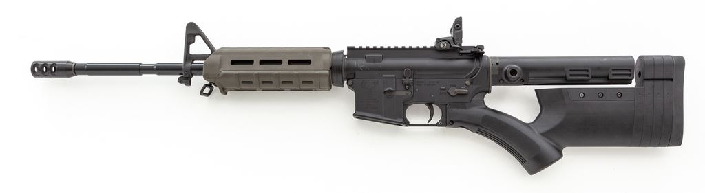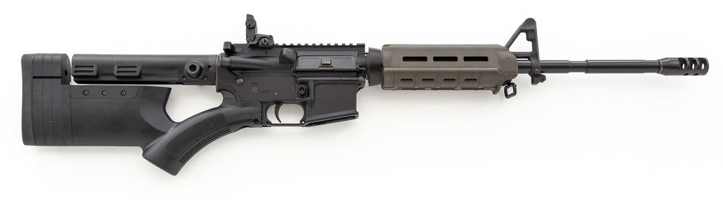 Stag Arms Model Stag-15 Semi-Automatic Rifle, #23351, 5.56 cal., 16'' blued steel barrel, 18'' overall including muzzlebrake, matte black receiver, OD green Magpul handguard, black Thordsen Customs stock, fixed post front sight, Magpul MBUS flip-up rear sight, no magazine. Included is a digital camouflage pattern padded Molle range bag. In fine overall condition, showing scattered scuffs and light handling marks to the stock and matte metal surfaces; left side of receiver with a few noticeable moderate surface scratches. Excellent smooth action and bright bore. Est.: $400-$600. (Modern)