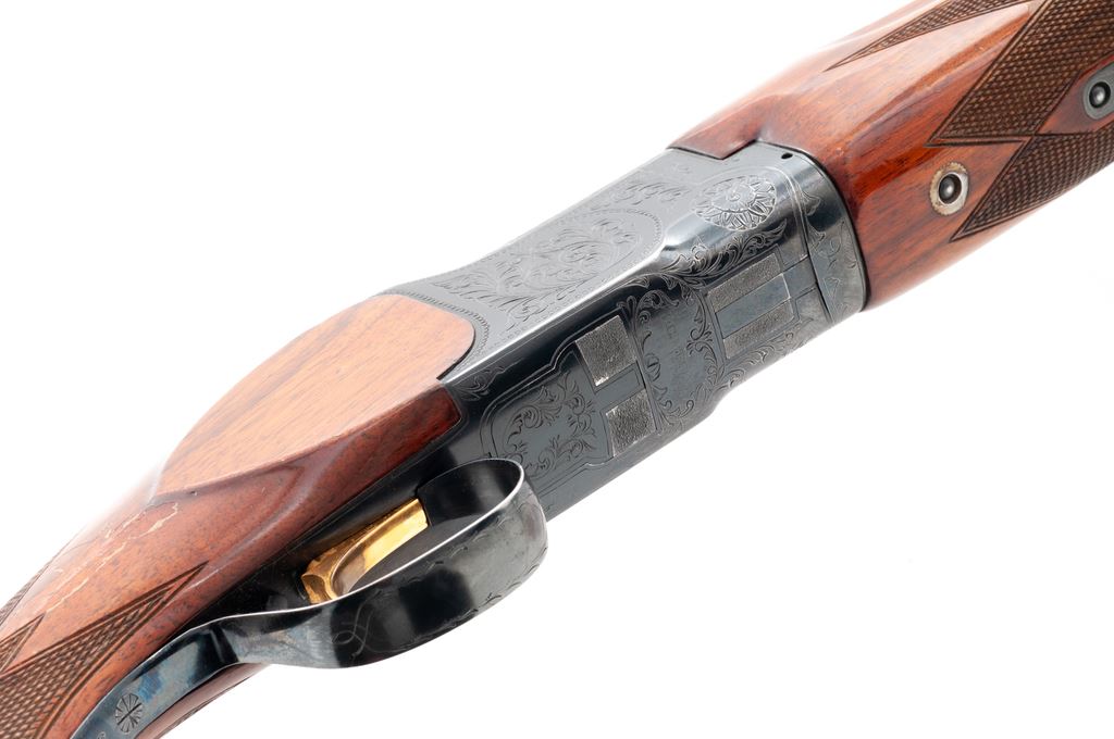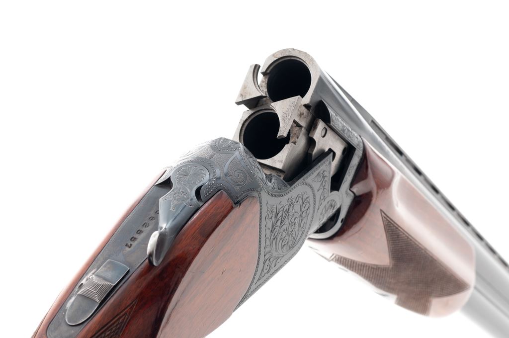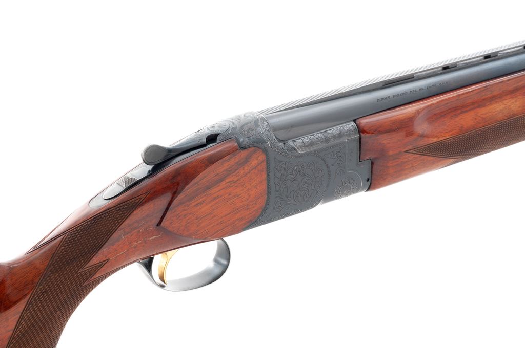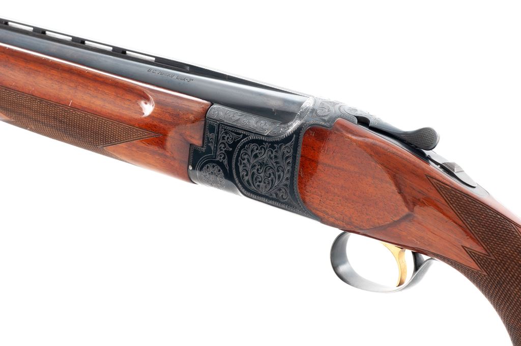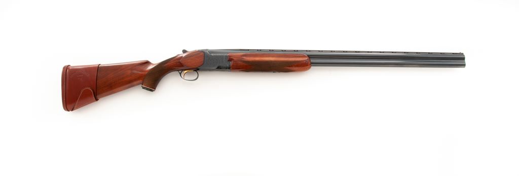 B.C. Miroku (Pre-Citori) Standard Grade Over/Under Shotgun, #M552557. 12 ga. 30'' vent rib barrels have 3'' chambers and are choked IM./Full. Action geatures single selective trigger, auto ejectors and non-auto safety. Receiver is nicely engraved with rose and scroll patterns. Beavertail forend and pistol-grip buttstock are fully checkered. At some point the buttstock was shortened then re-lengthened to 14-1/4'' length of pull over a solid Pachmayr pad and 15'' over a slip-on pad. Mfg'd early 1970s in Japan. Condition is very good, with the action locking up tight and functioning correctly. There are numerous handling marks to the wood and minor damage to the rib at the muzzle. Bores are bright. Est.: $450-$600. (Modern)