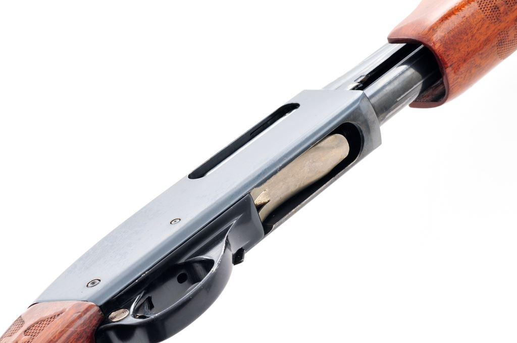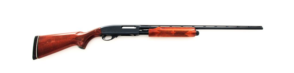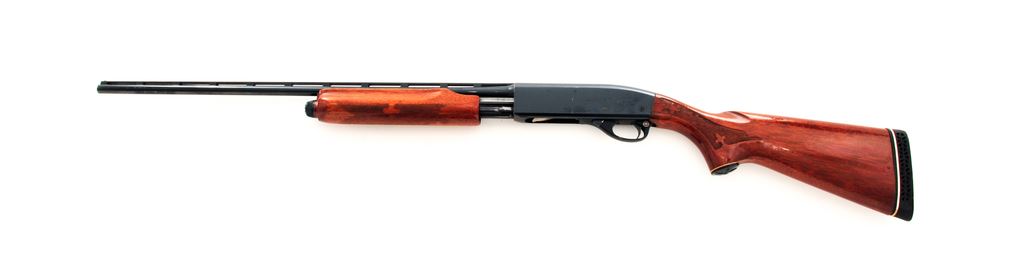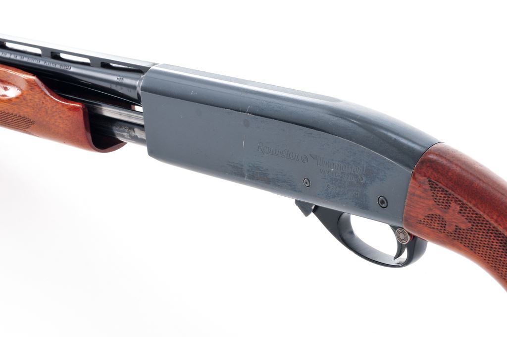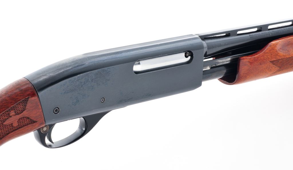 .410 Bore Remington Model 870 Wingmaster Pump Action Shotgun, #S343777H, 3'' chamber, 25'' vent rib barrel, with a silver bead front sight. Gloss-finished pistol-grip walnut stock with press checkering, original grip cap, and black rubber Mershon recoil pad; LOP is 14-5/8''. Condition is very good. Metal with approx. 92%-94% original blue; receiver with general light scratching; factory lettering is clear. Wood with most of the original varnish and intermittent shallow impressions and marks from handling and field use; buttstock with a small a chip at the upper edge and appears to have been cut; recoil pad does not fit flush on all sides. Action is crisp with an excellent bright bore. Est.: $300-$500. (Modern)