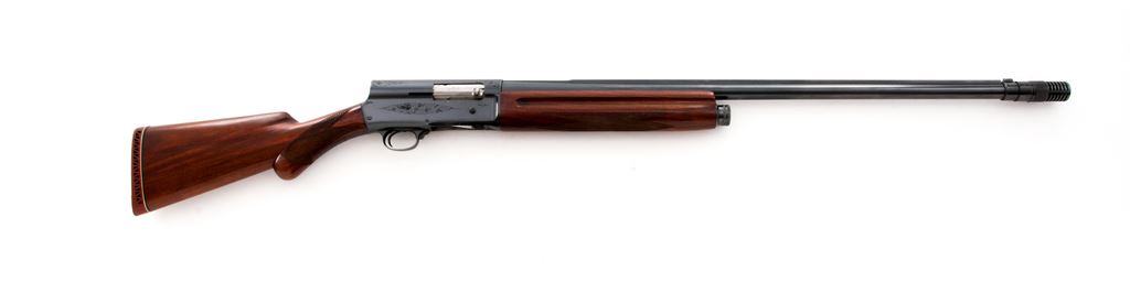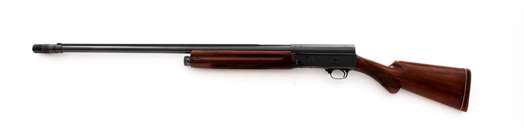 Belgian Browning Auto-5 Semi-Automatic Shotgun, #303994, 12 ga., 2-3/4'' chamber, 26.5'' ribbed barrel with Polychoke, blue finish, long-tang round-knob checkered walnut stock, with red rubber Pachmayr butt pad. LOP 14-1/8''. Mfg'd 1950. Condition is excellent as modified, retaining approx. 97% factory blue, with some thinning in the balance area. Stock with light pressure dings and minor flattening to checks. Good action, bright bore. Est.: $350-$500. (C&R)