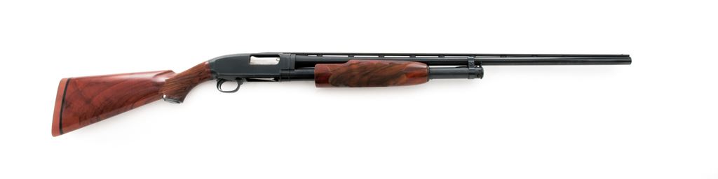 Upgraded Winchester Model 12 Standard Grade Slide-Action Shotgun, #693394. 20 ga. 28'' barrel has a 2-3/4'' chamber, is choked Full, and has been fitted with a Simmons ventilated rib that extends 3'' onto the receiver. Both the barrel and receiver appear reblued, with dull matte finish done on top of receiver. Wood, full forend and pistol-grip buttstock have been upgraded to a beautiful ''C'' Grade walnut with a red hue, then extensively checkered at 26 LPI in a fleur-de-lis pattern. Buttstock features a blued grip cap and red ''Old English'' butt pad. Mfg'd 1936. Condition is like new as upgraded, with few marks to wood, little wear to action, and one impression on forend; bright bore. A very nice 20 ga. Model 12. Est.: $450-$550. (C&R)