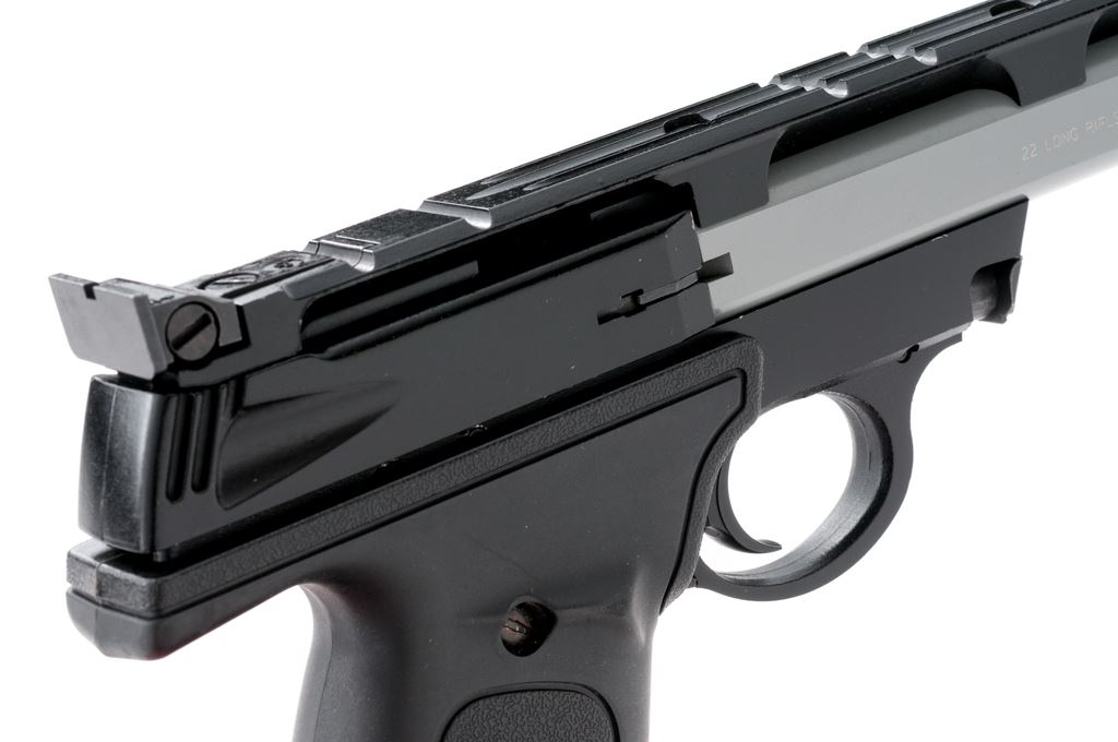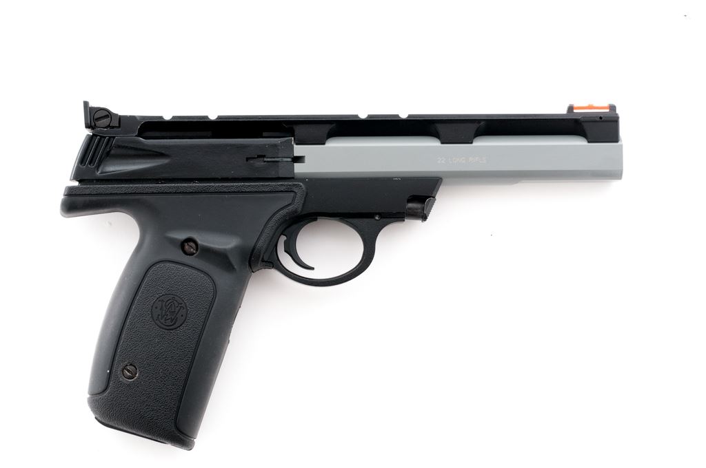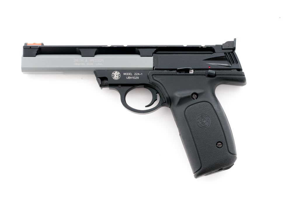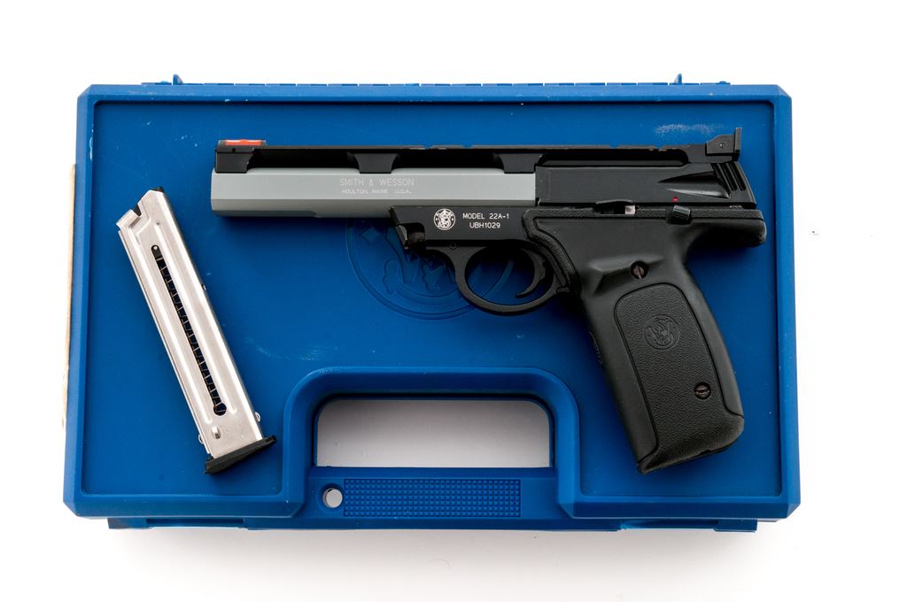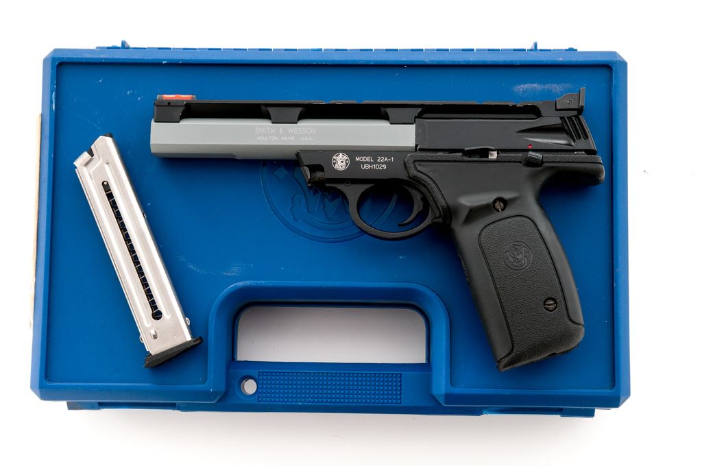 Smith & Wesson Model 22A-1 Semi-Automatic Pistol, #UBH1029, .22 LR cal., 5.5'' bull barrel, two-tone light gray/black finish, raised solid rib, black plastic/rubber S&W grips, green fiber-optic type front sight, fully adjustable rear sight, with two (2) S&W magazines, in blue plastic S&W case with matching end label and owner's manual. Condition is excellent, with approx. 98%+ original finish; highpoints show minor wear. Grips with a few normal very light handling marks. Action and bore are excellent. Est.: $200-$350. (Modern/PPT)