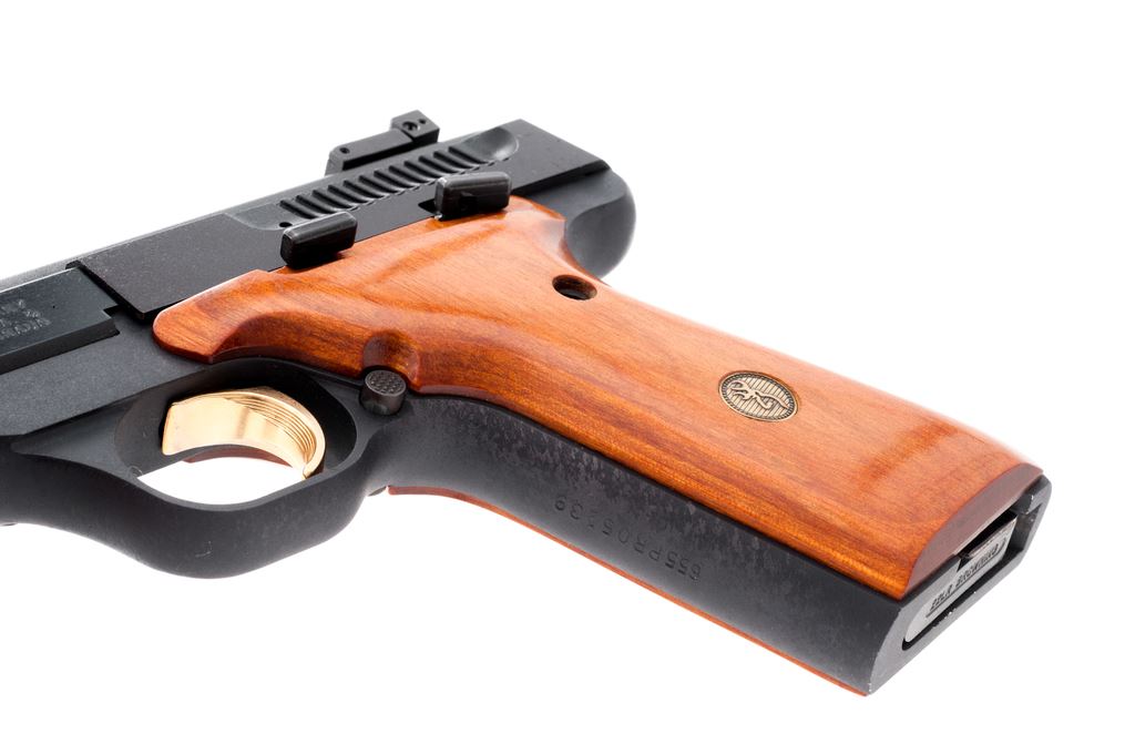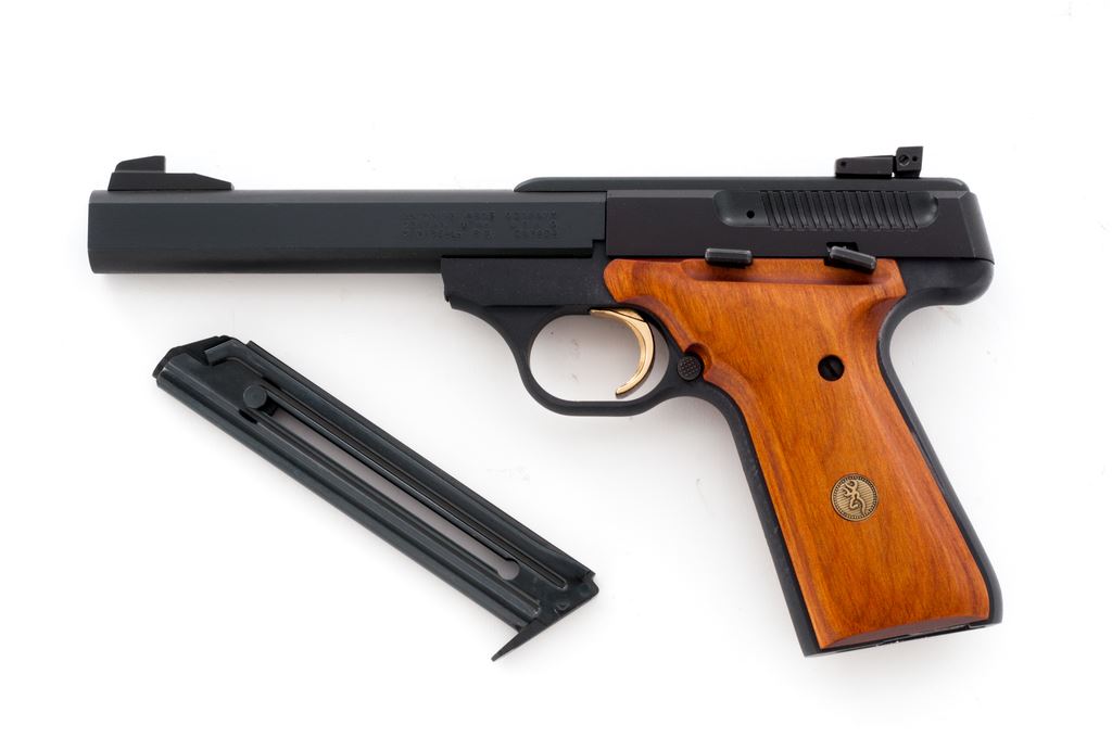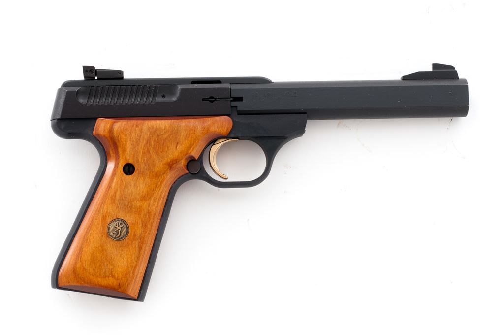 Browning Buckmark Semi-Automatic Pistol, #655PRO5139, .22 LR cal., 5.5'' barrel, combination matte and polished blue finish, smooth wood grips with Browning medallions, Patridge front sight, square notched fully adjustable rear sight, gold-colored trigger, with two (2) Browning magazines, and owner's manual. Condition is near excellent. Visibly the only blemish on this pistol would be spotting to the matte finish on the front grip strap. Right grip with a few very small handling marks, otherwise both are excellent. Gold-colored trigger with a nice even color. Factory lettering is clear. Action is smooth; bore is bright. Est.: $200-$400. (Modern/PPT)