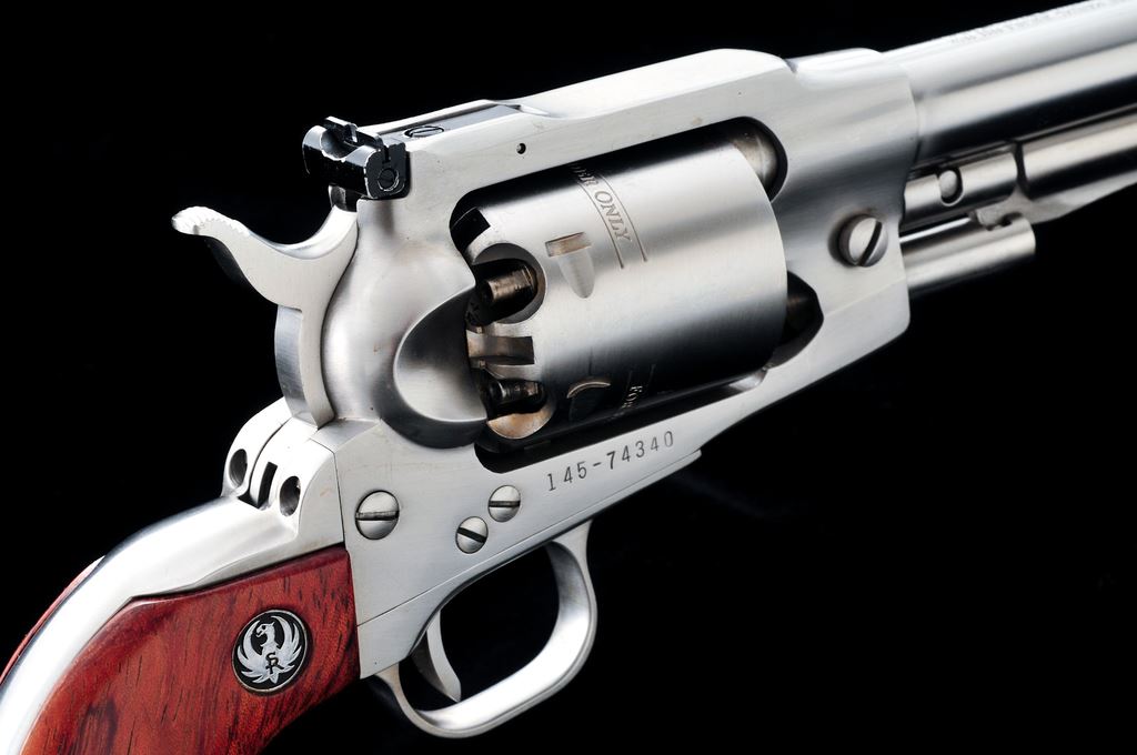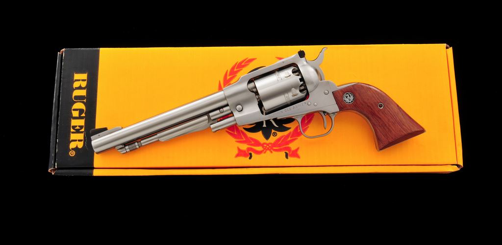 Ruger Old Army Percussion Single Action Revolver, #145-74340, .45 cal., 7.5'' barrel, stainless steel, smooth wood grips with silver Ruger medallions, fixed large blade front sight, with a fully adjustable square notched rear sight. Included is the original brown cardboard box with matching end label and one-piece Ruger box with the owner's manual. Condition is near excellent. Metal with scattered handling marks; cylinder with a light index line and some light surface scratching. A thin coat of dried oil can be found on some of the metal, most noticeable around the muzzle and on the loading lever. Factory lettering with crisp raised edges. Grips appear near new. Excellent action and bright bore. Brown cardboard box shows normal light storage wear; yellow and black box rates excellent. Est.: $400-$600. (Modern/PPT) (This revolver is not classified as an antique and does require an FFL for registration.)