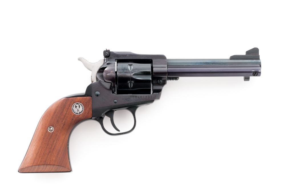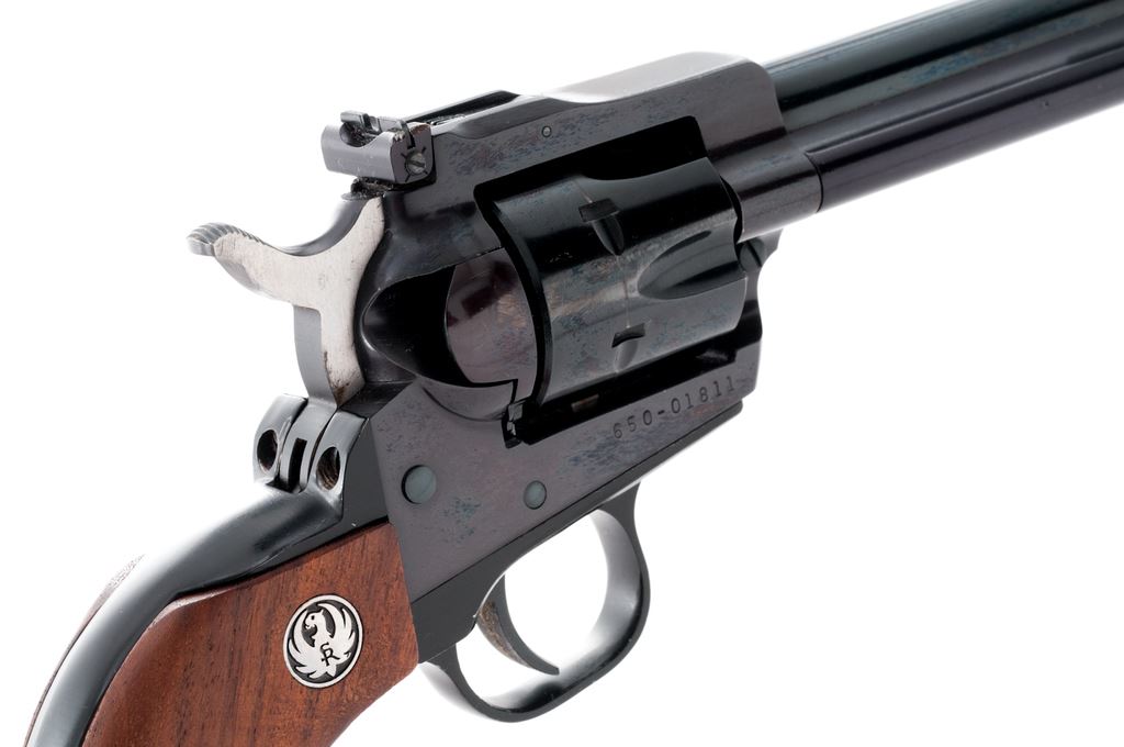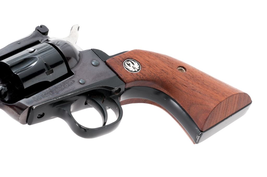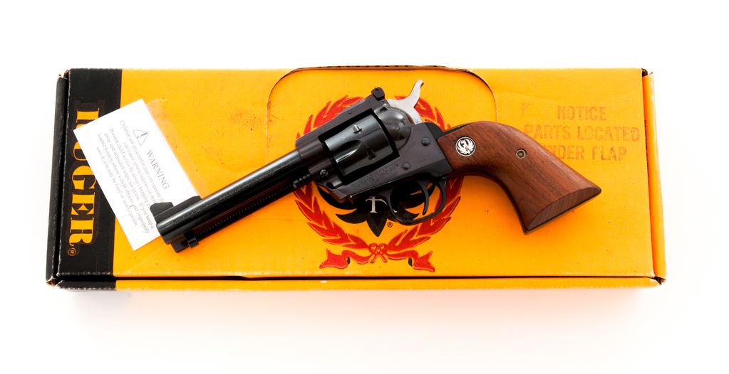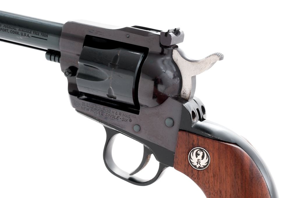 Ruger New Model Single Six Revolver, in .32 H&R mag. cal., #650-01811, 4-5/8'' barrel, blue finish, smooth walnut grips with silver Ruger medallions, fixed blade front sight and square notched fully adjustable rear sight. In an original Ruger box with no end label or particular firearms identification. Approx. 95% original finish remains and this revolver rates as very good overall. Frame has toned to a light plum color. Cylinder with a thin index line. Tip of ejector rod housing with a small impression. Grips with bright medallions and only a few minor handling marks. Action is crisp with an excellent bright bore. Est.: $300-$500. (Modern/PPT)