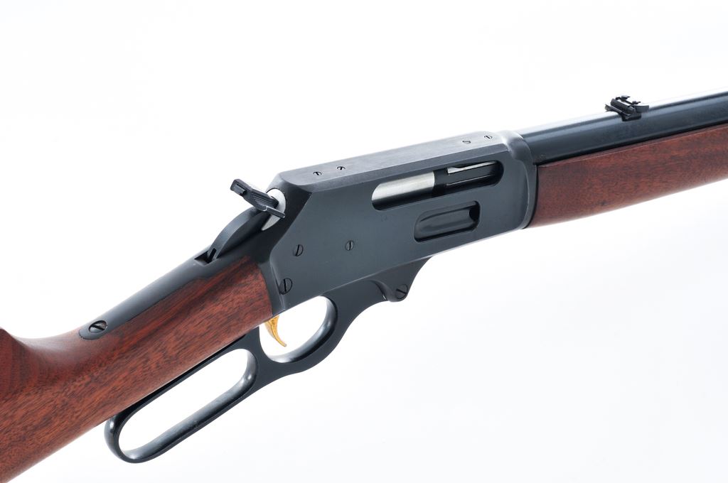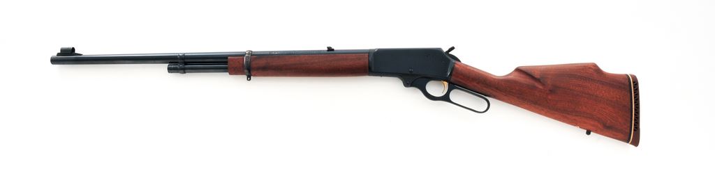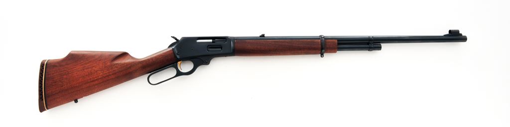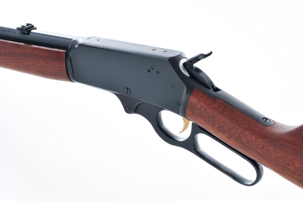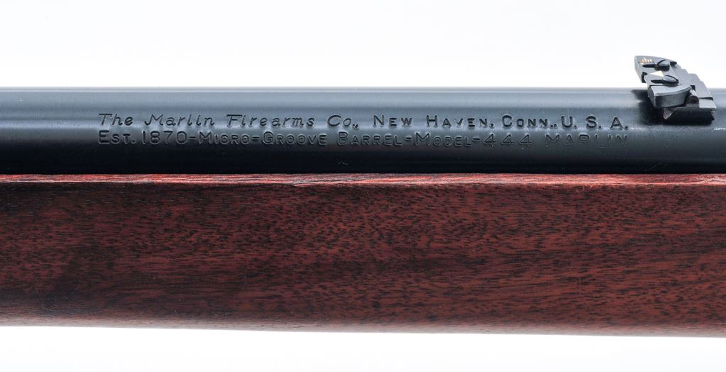 Marlin Model 444 Lever Action Rifle, #AD17484, .444 Marlin cal., 24'' round ''JM'' marked barrel with micro-groove rifling, blue finish, 2/3-length magazine tube, straight grip oil-finished walnut stock with Monte Carlo cheekpiece with brown rubber Marlin pad, sling swivel studs, hooded brass bead front sight, folding rear sight, ''JM'' marked hammer extension, and factory drilled and tapped receiver. Mfg'd 1968. Condition is very good with approx. 97% original finish. Receiver with some light scratching, mainly on top around the factory scope holes. Right side of receiver and lever with a small amount of tiny specks of oxidation. Barrel address is sharp. Wood is mostly smooth with a few moderate carry marks on the forend, as well as a few shallow impressions along the bottom edge of the buttstock. Lever is crisp with a smooth hammer and trigger; bore is excellent. Est.: $400-$600. (C&R)