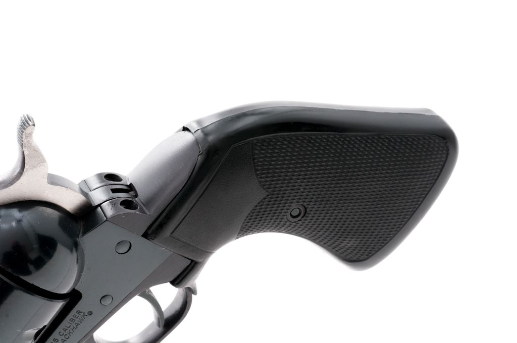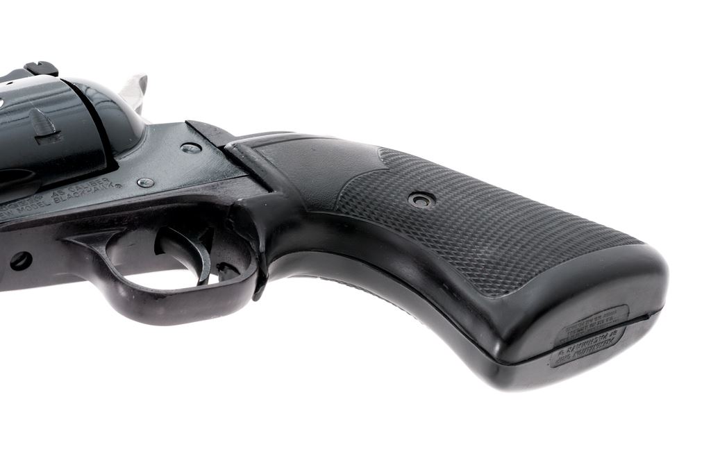 Ruger New Model Blackhawk Convertible Single Action Revolver, #46-88931, with both a .45 LC and .45 ACP cylinder. Also featuring a blue finish, checkered black rubber Pachmayr ''Presentation'' grips, red ramp front sight and white outline fully adjustable rear sight. Both cylinders are numbered to the gun. Condition overall is excellent with approx. 98%+ original blue. Metal shows a small amount of intermittent slight handling marks; wear to the left side of the muzzle and top of the frame near the rear sight accounts for a majority of the finish loss. .45 Colt cylinder with a light index line; .45 ACP moderate. Grips are also excellent with clean checkering. Smooth crisp action and an excellent bore. Est.: $400-$600. (Modern/PPT)