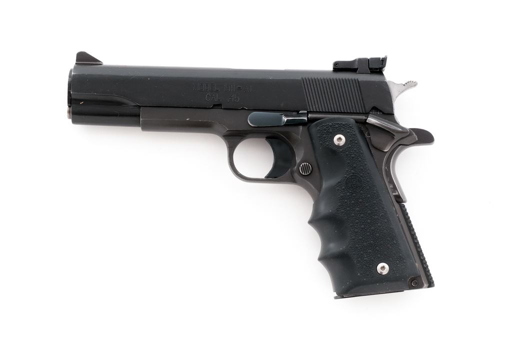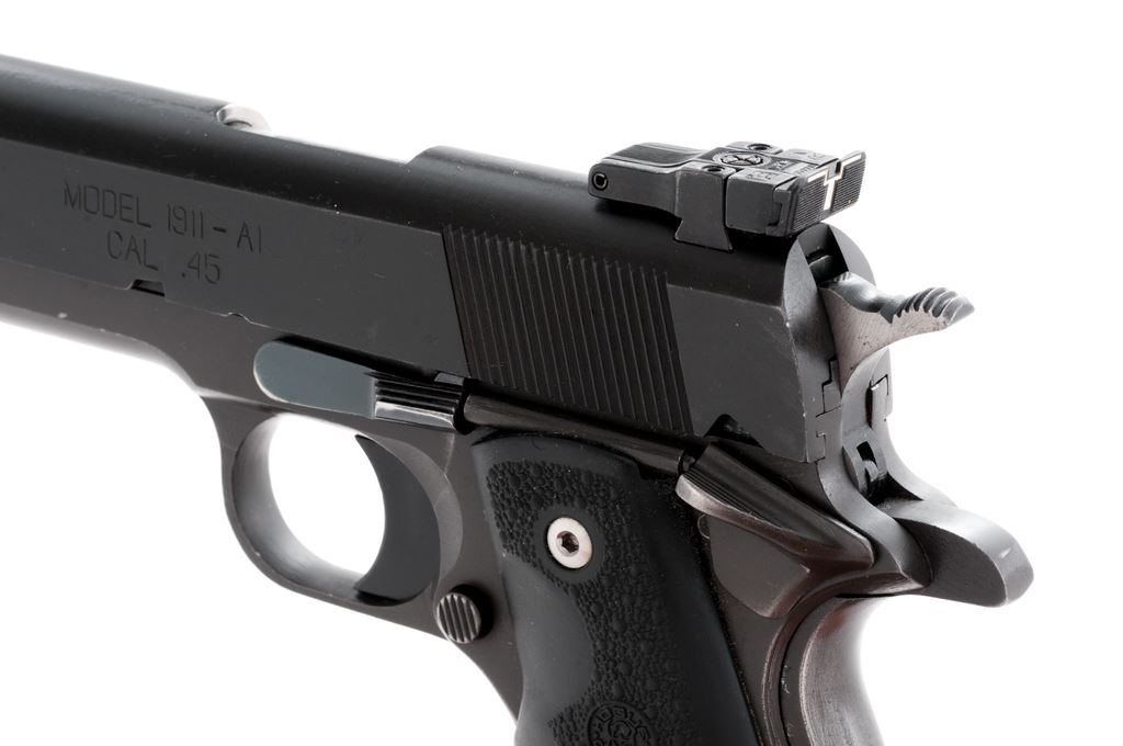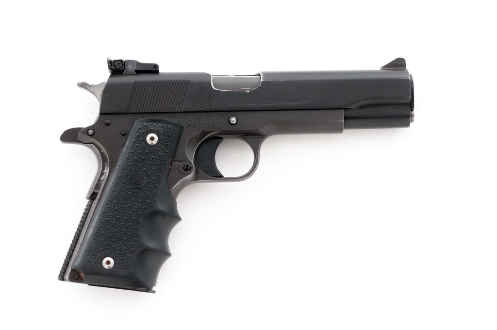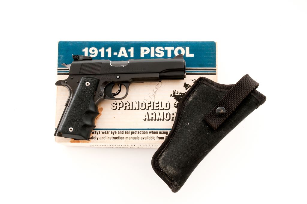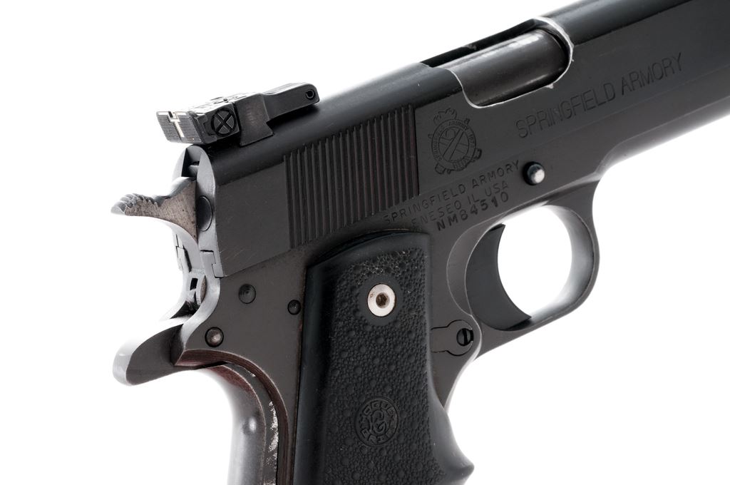 Modified Springfield Armory Model 1911-A1 Semi-Automatic Pistol, #NM84510, .45 ACP cal., 5'' barrel, parkerized finish, finger-grooved black rubber wraparound grips, and replacement Millett sights which include an orange ramped front and fully adjustable white outline rear. Gunsmith receipts show a National Match trigger and two-piece Ed Brown guide rod assembly being installed. Previous owner also filed down the edges of the slide at chamber, most likely for a desired case ejection. Included is the original box that is numbered to the gun, black nylon Cordura holster, and the original small parts that were replaced; trigger, sights, etc. With the exception of the filed down inside edges of the slide, pistol rates as very good overall, showing signs of moderate range use. Grips with normal light handling marks. Factory lettering is crisp. Action is smooth with a very good bore. Box with visible yellowing from age. Est.: $300-$500. (Modern/PPT)