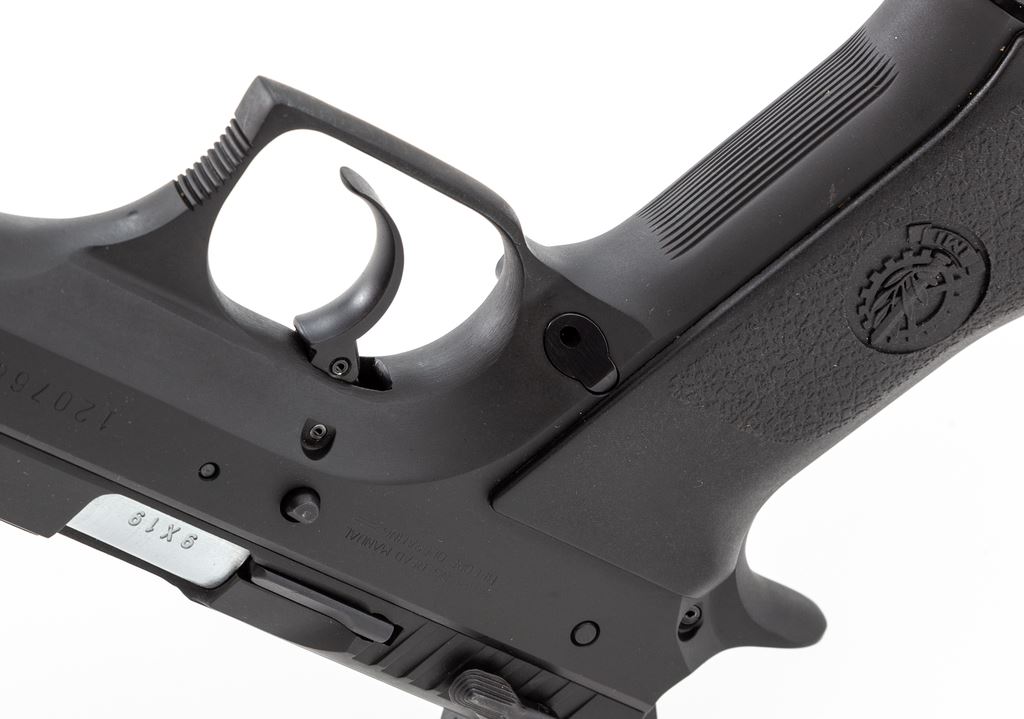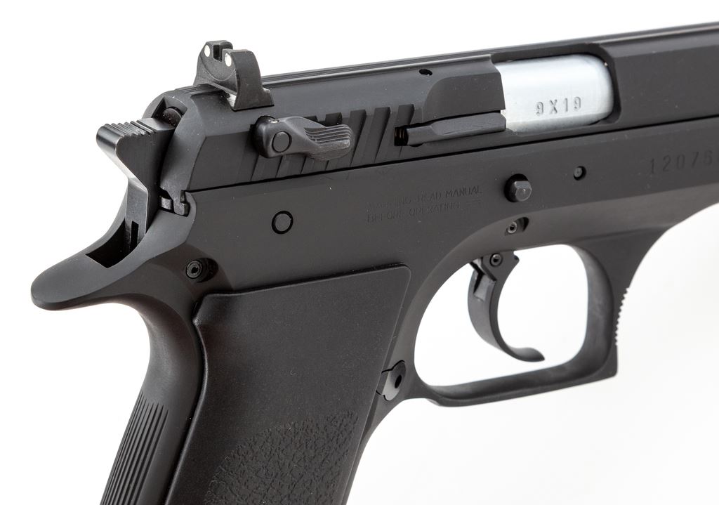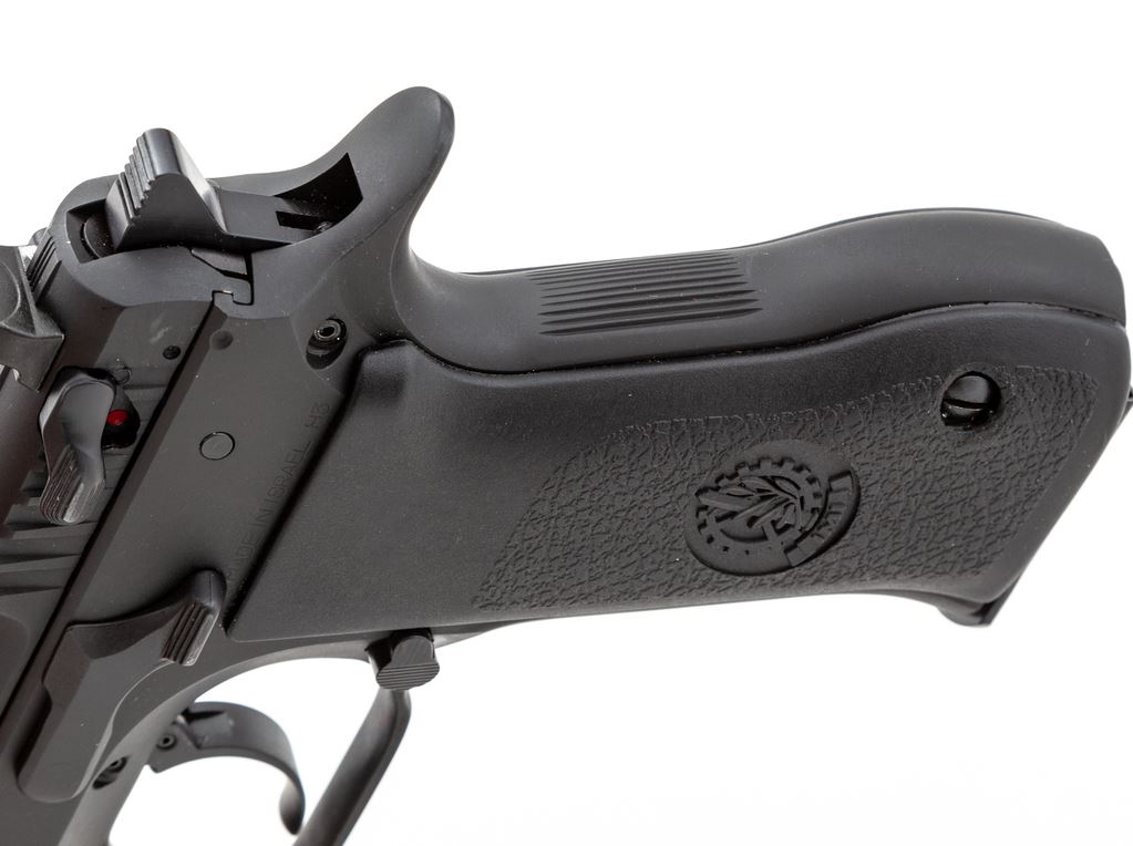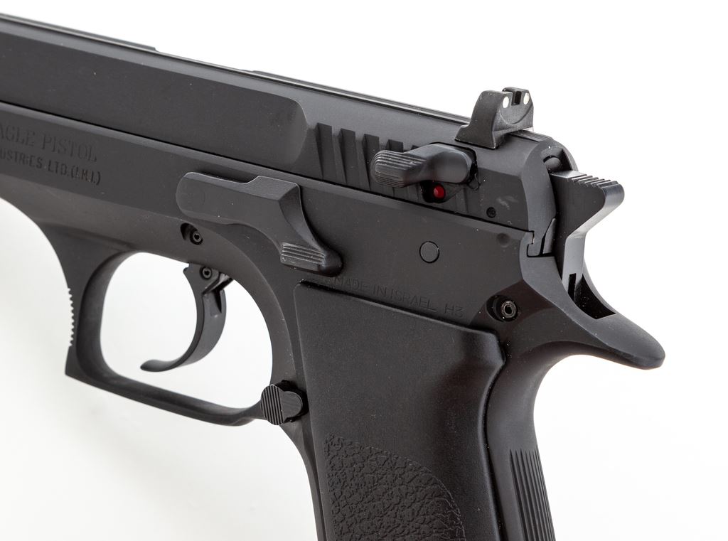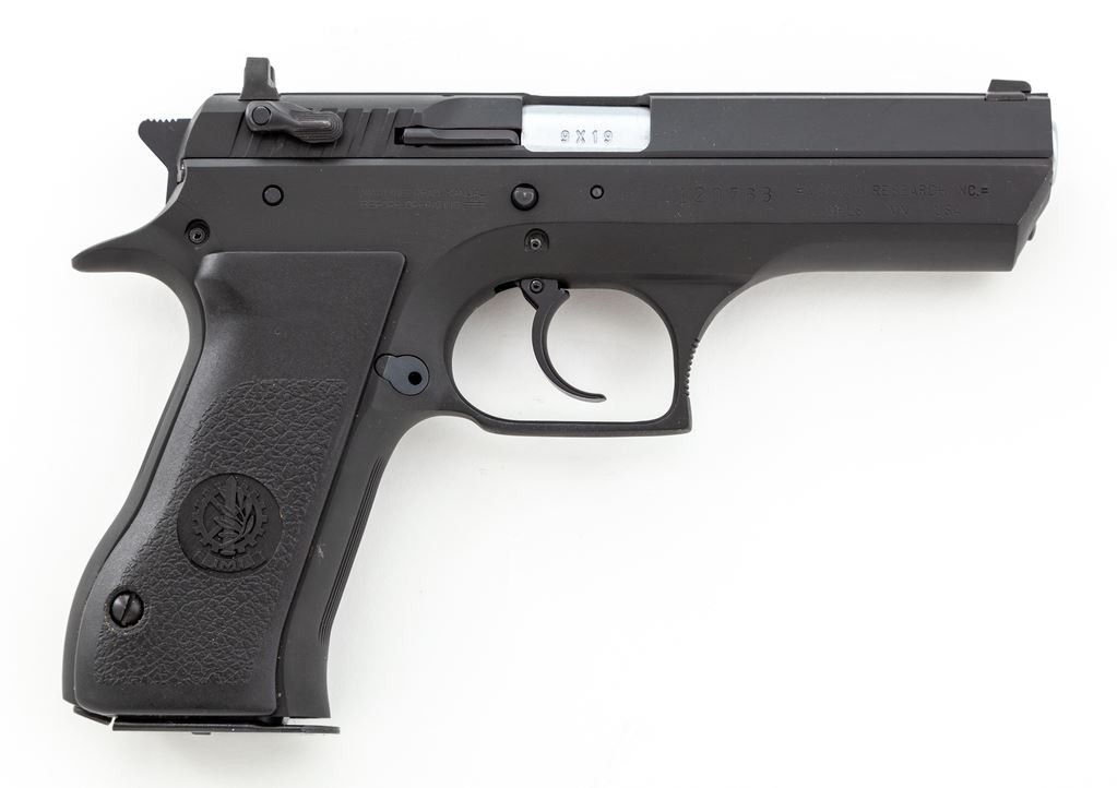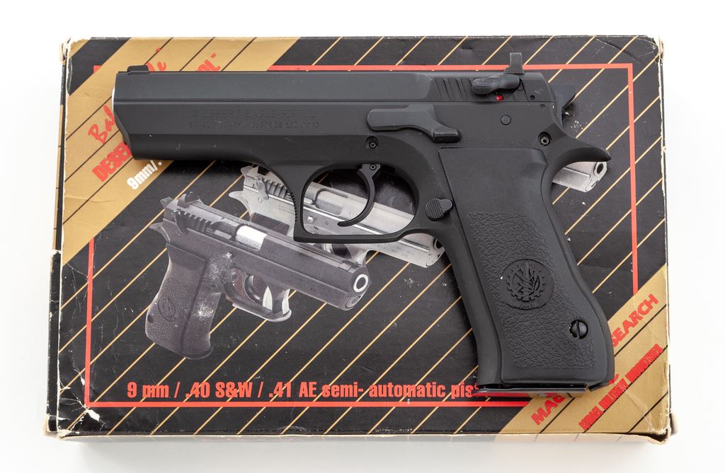 Magnum Research/IMI Baby Eagle Semi-Automatic Pistol, #120768, 9mm cal., 4-3/8'' barrel, matte black finish, factory black plastic IMI grips, fixed white 3-dot sights, ambidextrous safety/decocking lever, with one 14-round magazine. In original box with matching end label and the owner's manual. Made in Israel. Metal surfaces rate near excellent showing normal light scuffs and handling marks to the matte surfaces. Grips are excellent. Action is smooth with a mirror bright bore. Est.: $400-$600. (Modern/PPT) (High-cap mags not available to Calif. residents.)