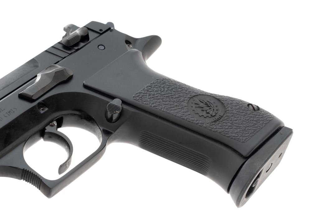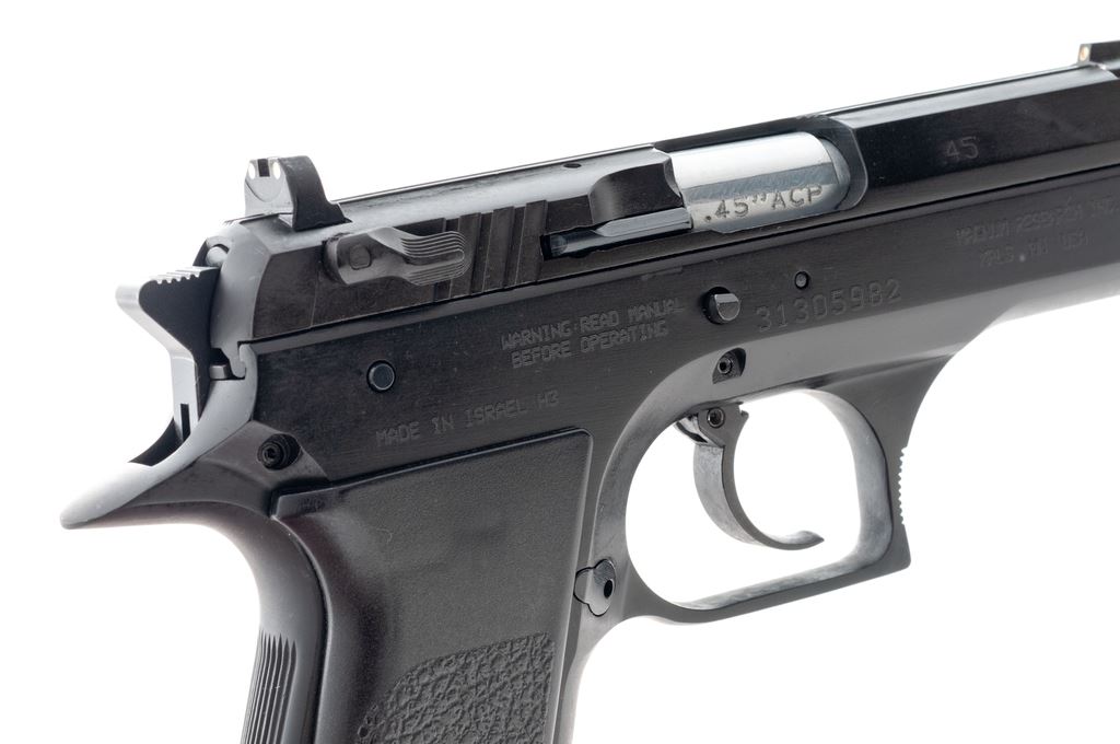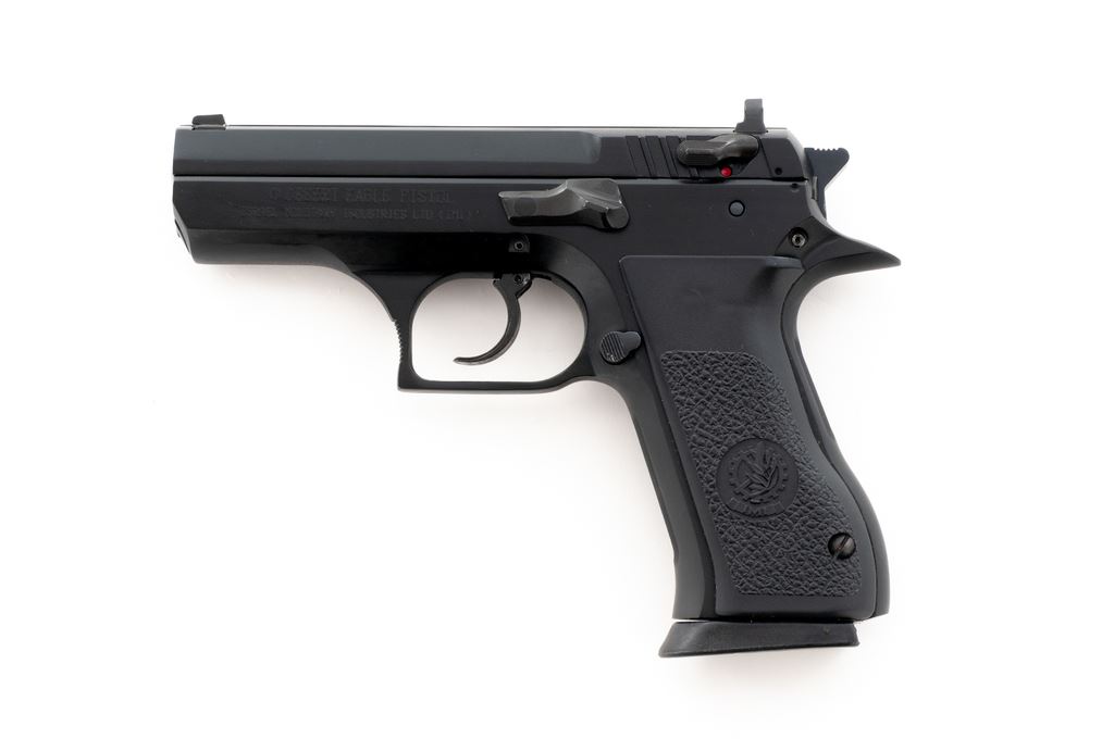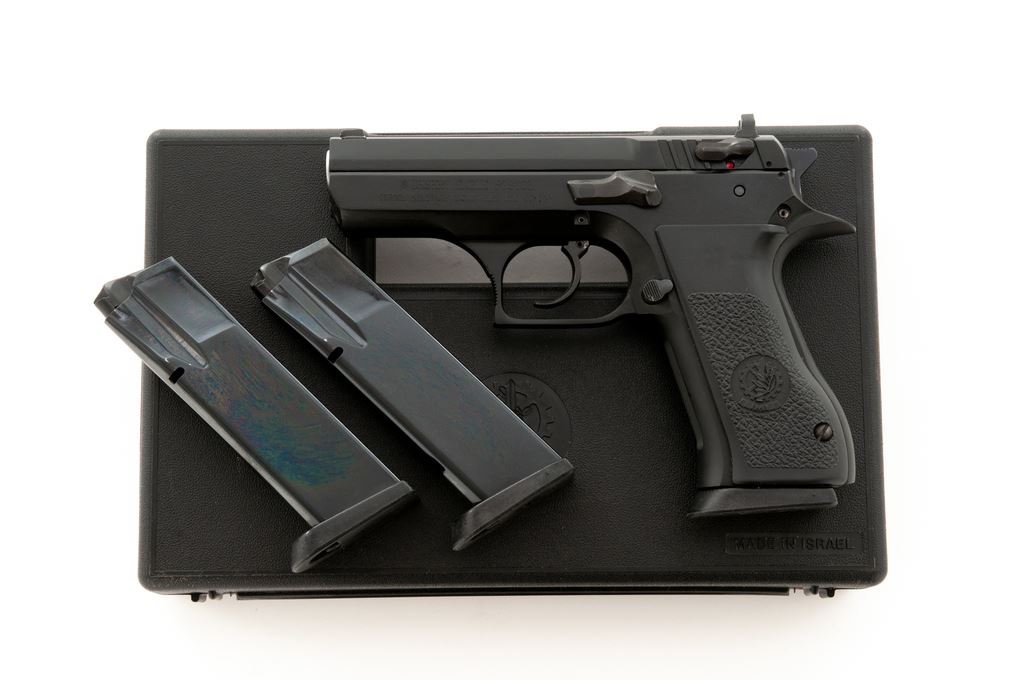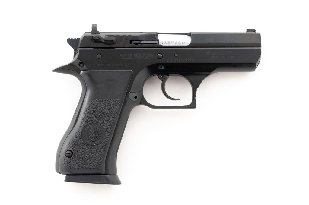 Magnum Research/IMI Baby Eagle Semi-Automatic Pistol, #31305982, .45 ACP cal., 3-7/8'' barrel, matte black finish, factory black plastic IMI grips, fixed white 3-dot sights, ambidextrous safety/de-cocking lever, with three (3) magazines. In original black plastic IMI case with owner's manual and cleaning brushes. Made in Israel. Overall condition is excellent showing normal slight scuffs to the matte surfaces from handling. Left grip with a shallow surface dent, otherwise both are excellent. Action is smooth with a near excellent bore. Est.: $400-$600. (Modern/PPT)