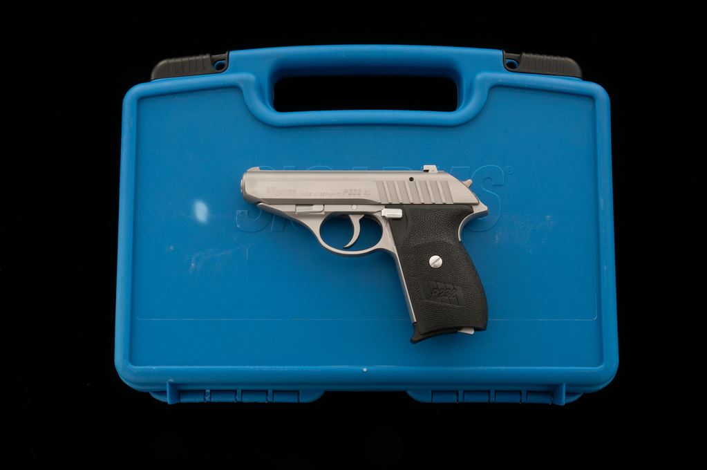 Sig Sauer P232 SL Semi-Automatic Pistol, #S246422, .380 ACP cal., 3-5/8'' barrel, stainless finish, factory black plastic Sig Sauer grips, fixed red 3-dot sights, with one 7-round magazine. In original blue plastic case with matching end label and owner's manual. Overall condition is excellent showing only normal light marks from handling and use. Factory lettering is sharp. Action is smooth with an excellent bright bore. Est.: $500-$700. (Modern/PPT)