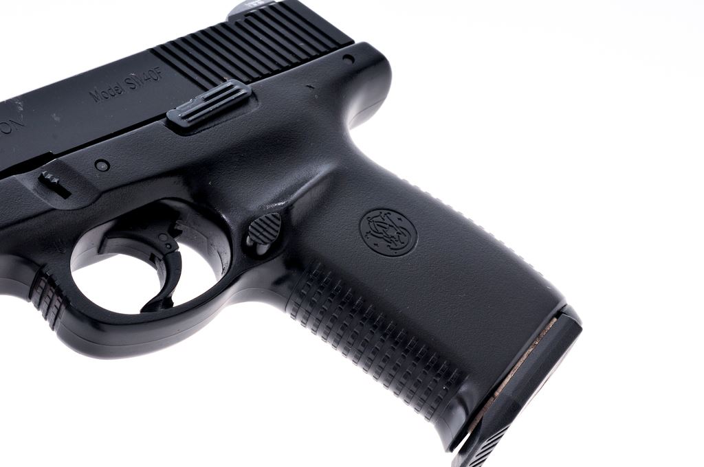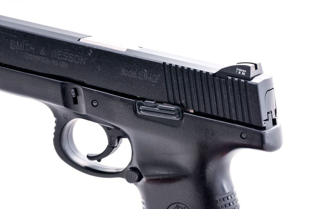 Smith & Wesson Model SW40F Sigma Series Semi-Automatic Pistol, #PAL7616, .40 S&W cal., double action only, 4.5'' barrel, dark blue/black slide, black polymer frame, fixed 3-dot Trijicon night sights that have a very faint glow, one factory 10-round magazine, and one factory 14-round magazine. In original blue plastic case with matching end label and owner's manual. Pistol is in very good overall condition showing signs of moderate range use. Slide with a few shallow scratches and small handling marks. Frame with some small impressions on the front bottom and right side. Action and bore are both excellent. Est.: $250-$350. (Modern/PPT) (High-cap mags not available to Calif. residents.)