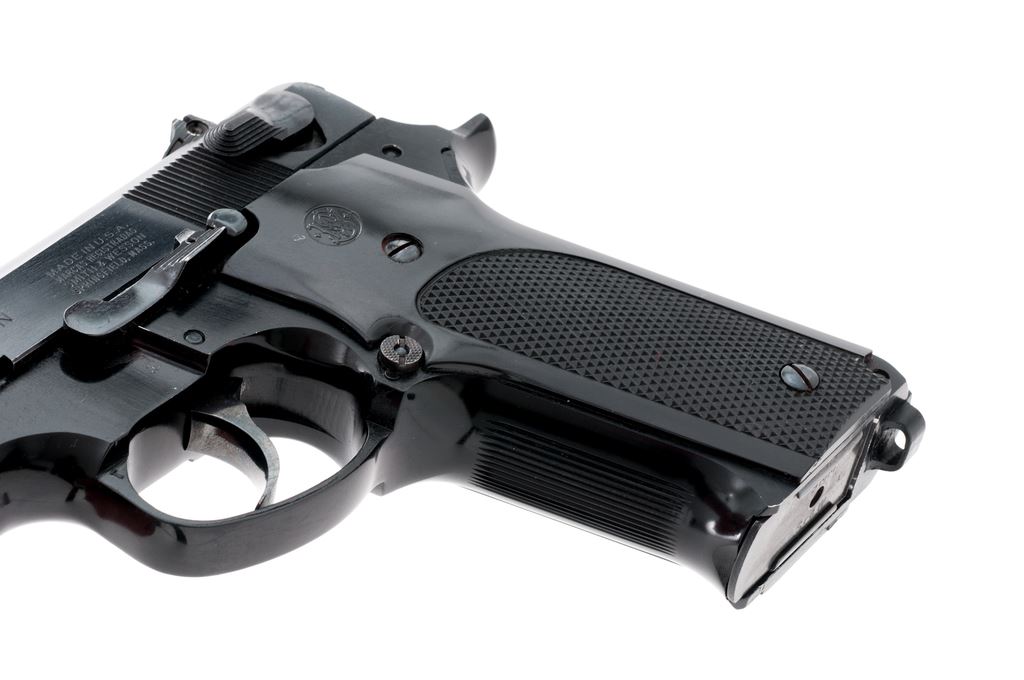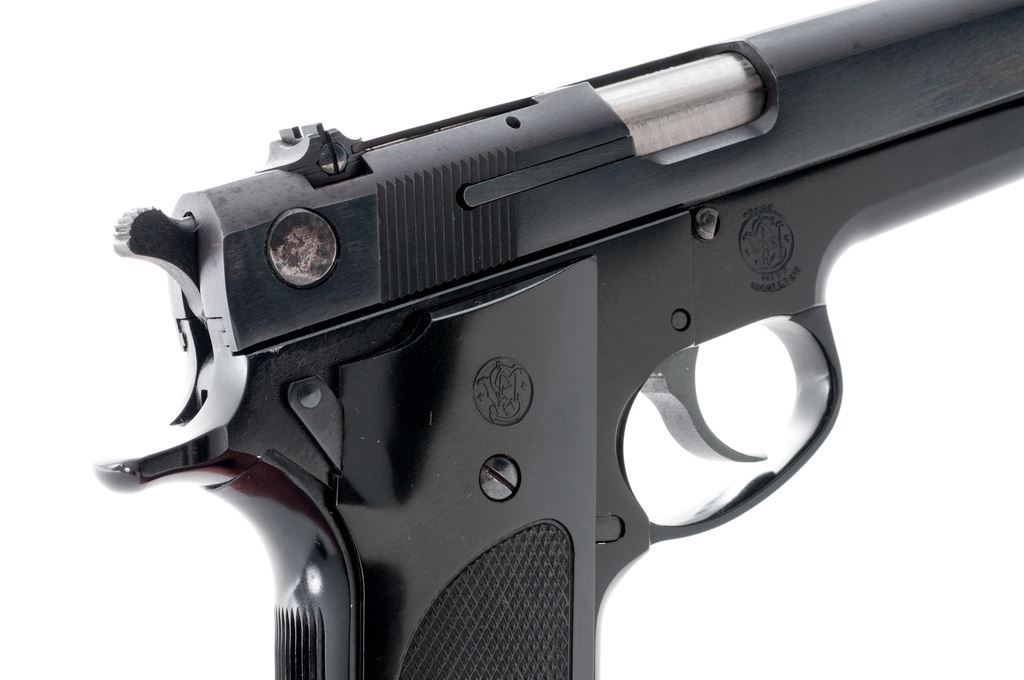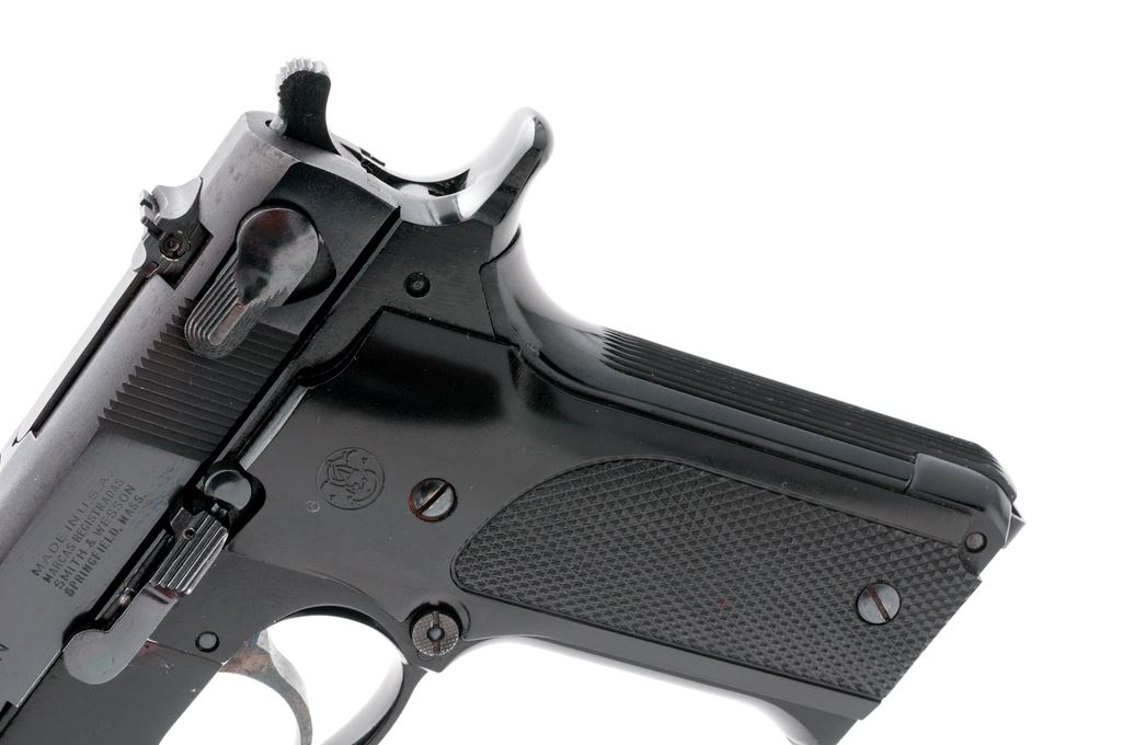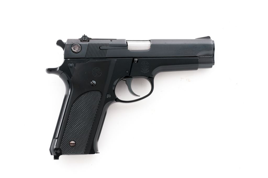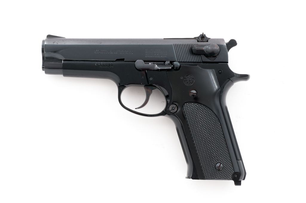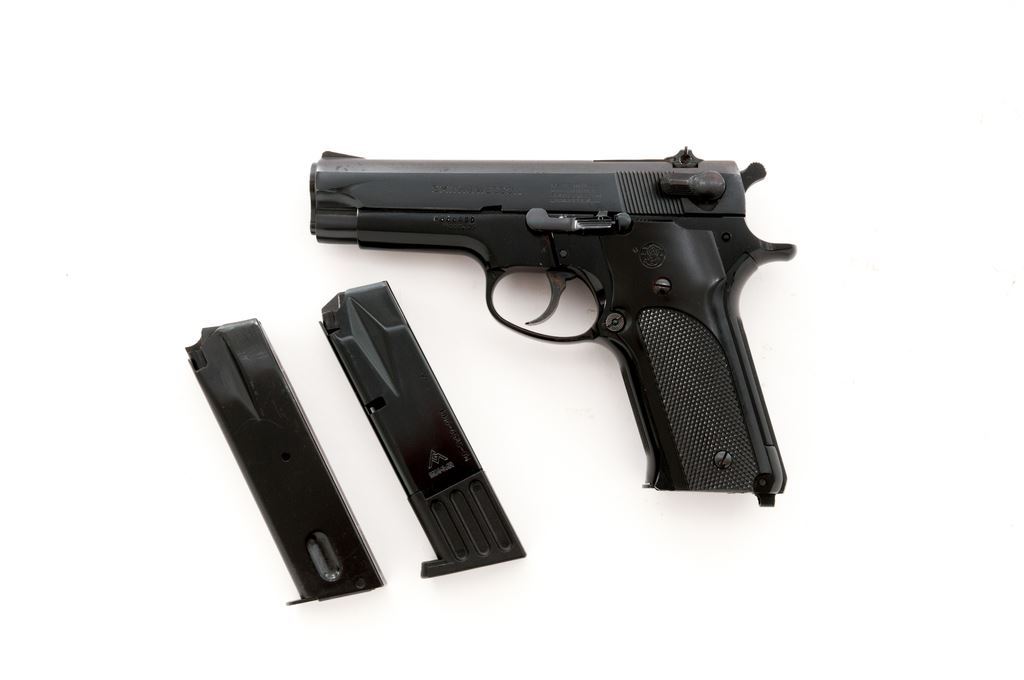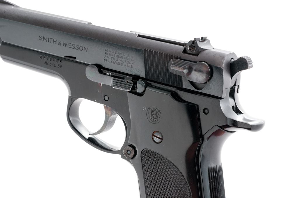 Smith & Wesson Model 59 Semi-Automatic Pistol, #A668695, 9mm, double/single action, 4'' barrel, blue slide, black alloy frame, factory checkered black plastic grips, fixed ramp front sight, adjustable rear sight, serrated front and back grip strap, with two (2) factory 14-round S&W magazines and one (1) 10-round Mec-Gar magazine. Condition is fine overall retaining approx. 97% original blue/black finish; circular portion of the safety that is visible through the right side of the slide shows finish loss and some very minor pitting; matted edges of the slide with a few small freckled spots. Grips show normal light handling marks; checkering is sharp. Factory lettering is clear. Action and bore are excellent. Est.: $350-$550. (Modern/PPT) (High-cap mags not available to Calif. residents.)