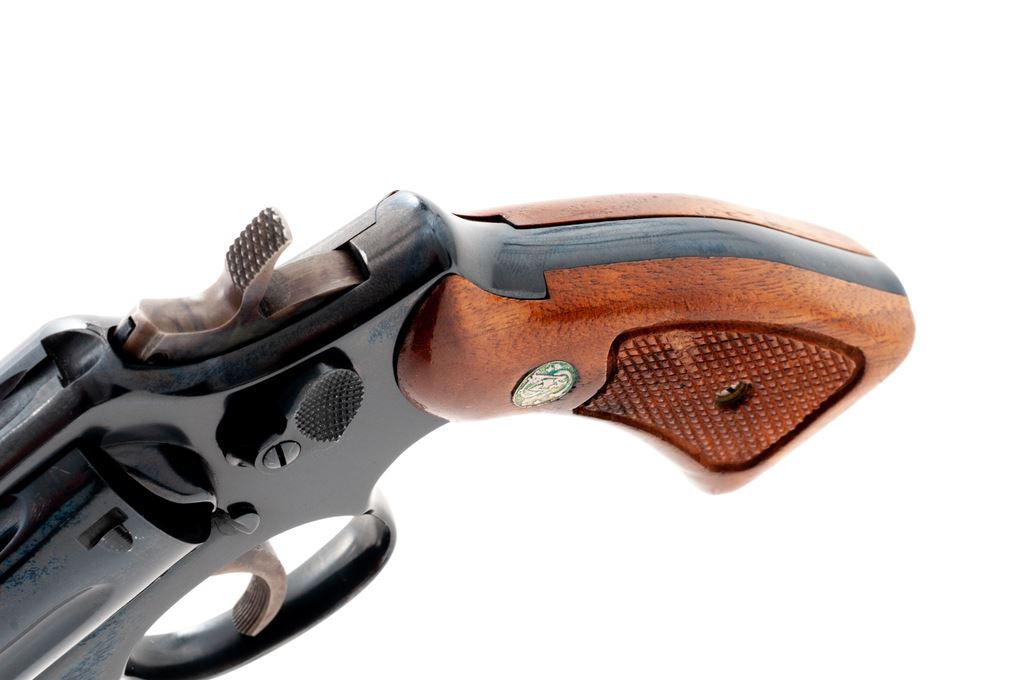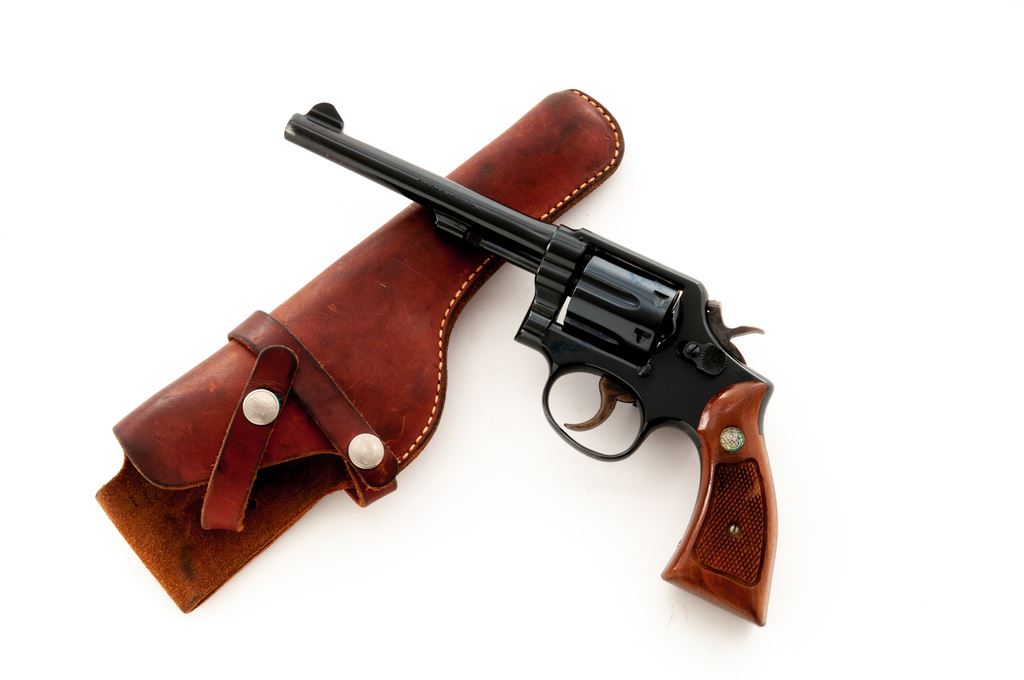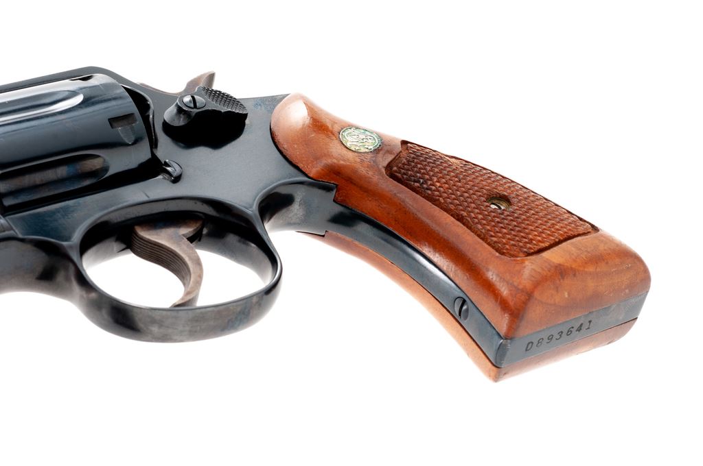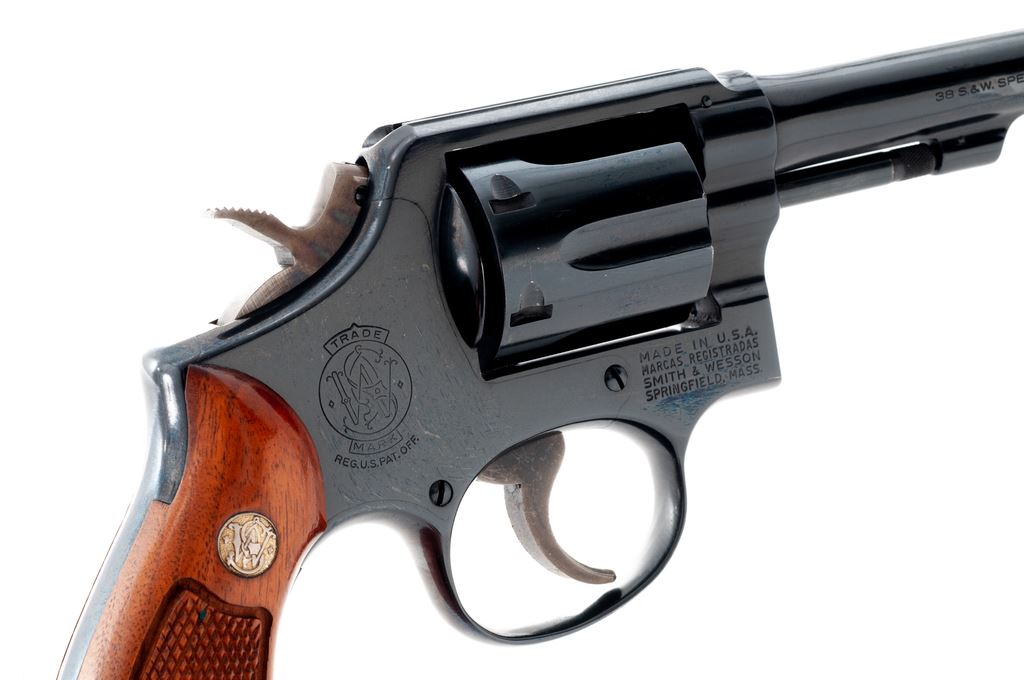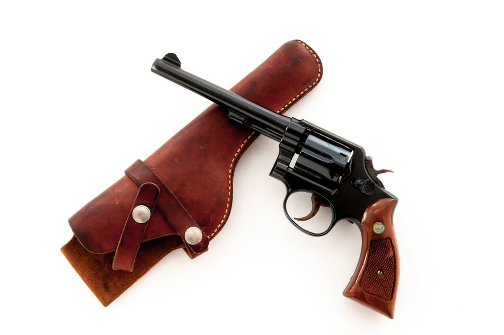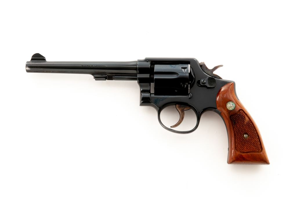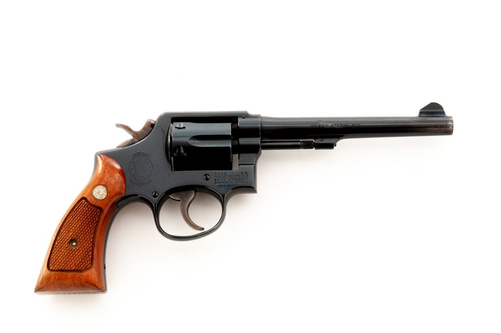 Smith & Wesson Model 10-5 Double Action Revolver, #D893641, .38 Spec. cal., 6'' pinned barrel, dark blue finish, checkered walnut grips that are numbered to the gun, case hardened hammer and trigger, with standard fixed sights. In brown leather right-hand Hunter holster. In very good overall condition with approx. 93%-95% polished blue; muzzle wear and a few scratches to the barrel and cylinder account for a majority of the finish loss, with approx. 85%-90% case colors. Grips with moderate thinning to the finish along the edges; left grip with a flat spot to the checks, otherwise grip checkering is mostly clean. Fine action and bore. Est.: $400-$600. (Modern/PPT)