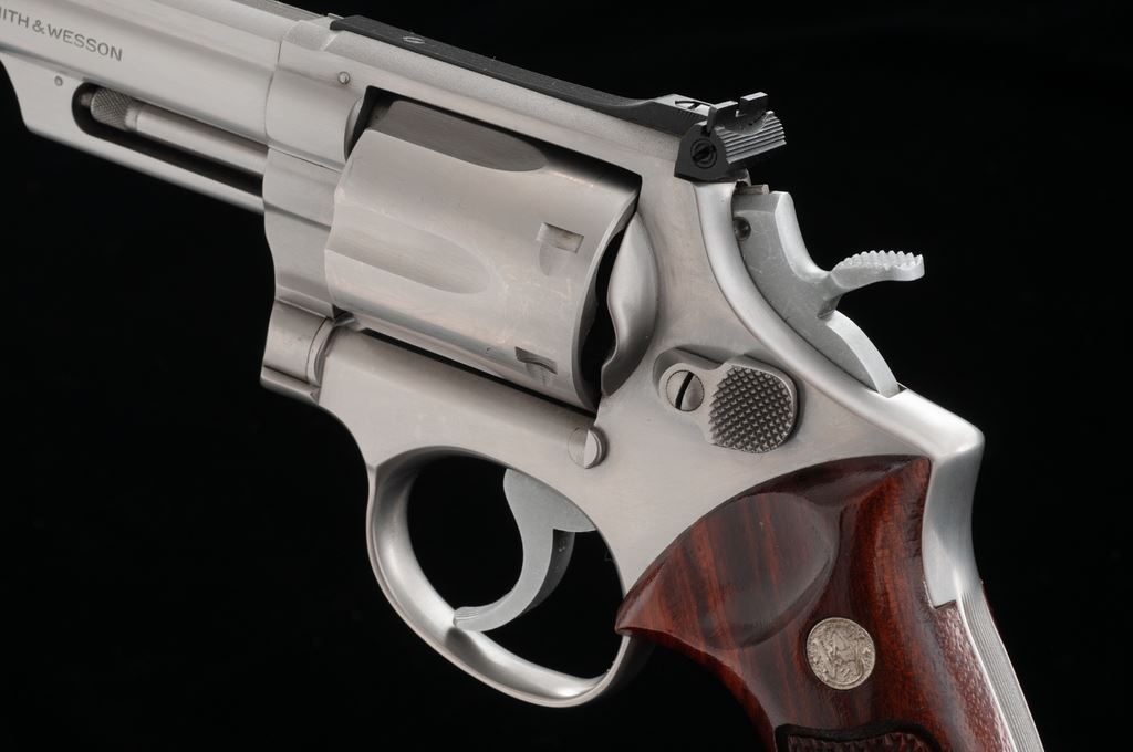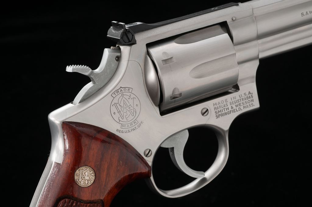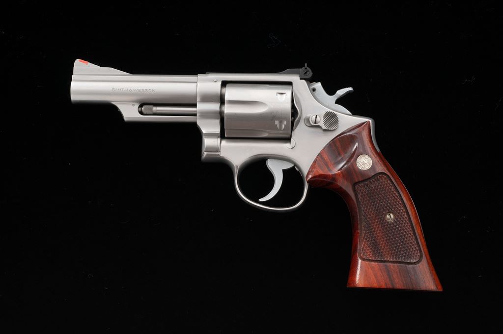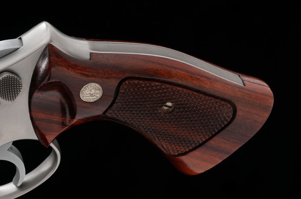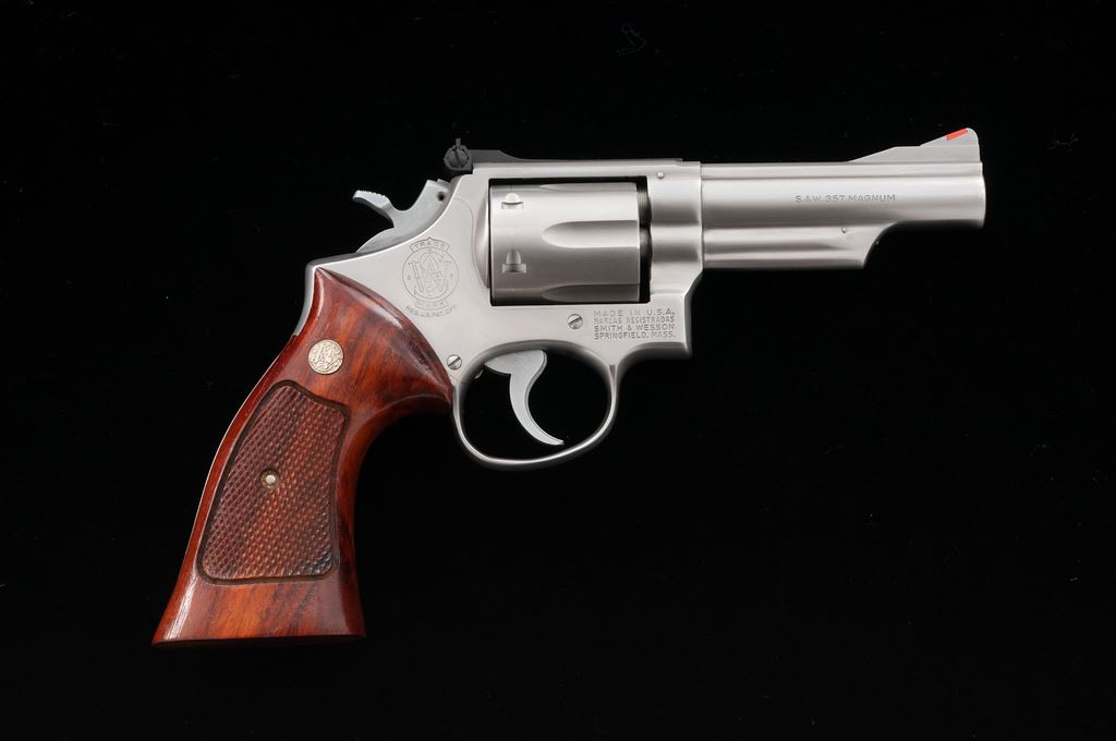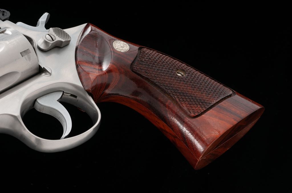 Smith & Wesson Model 66 Combat Magnum Double Action Revolver, #7K85614, .357 mag. cal., 4'' pinned barrel, satin stainless finish, factory checkered square butt Goncalo alves target grips with S&W medallions, red ramp front sight with micrometer click adjustable rear sight. Mfg'd 1975. Revolver is in excellent overall condition and shows normal signs of light range use, including a moderate index line to the cylinder. Factory lettering is clear and well defined. Grips show scattered shallow handling marks; checkering is sharp and shows no visible wear. Excellent crisp action and bright bore. Est.: $400-$600. (Modern) (Not available to Calif. residents.)(Sierra Sid's Casino, Sparks, NV.)