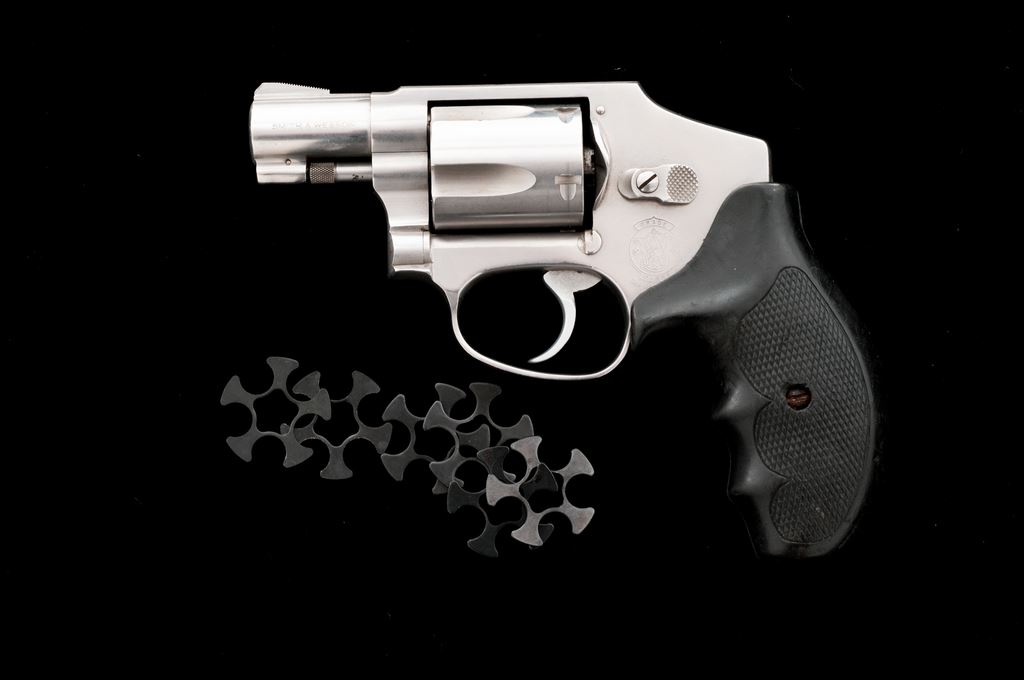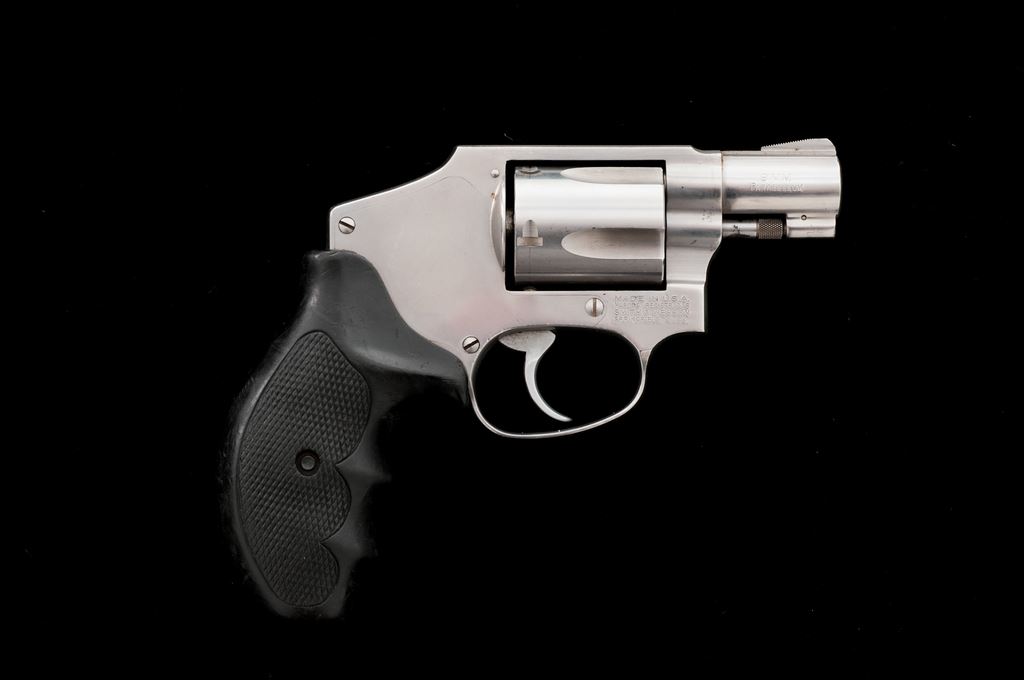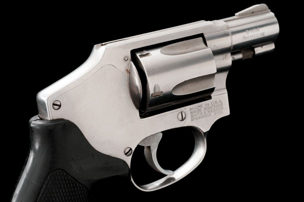 Smith & Wesson Model 940 Centennial Double Action Revolver, #BKY3229, 9mm cal., 1-7/8'' barrel, stainless steel, checkered black hard rubber finger-grooved grips, hammerless, with standard fixed sights, and includes six (6) full moon clips. Overall condition is good showing considerable shallow scuffs and scratches to the metal and grips; most likely a carry gun. Cylinder with a moderate index line. Fine action and bore. Est.: $400-$600. (Modern/PPT)