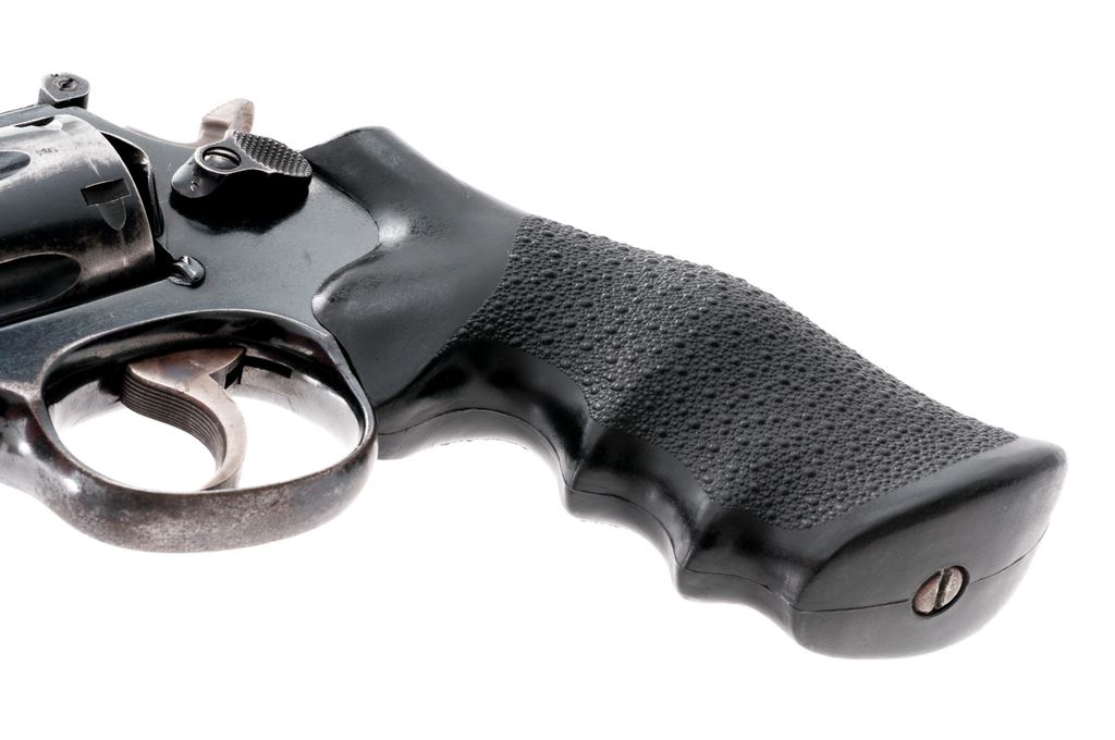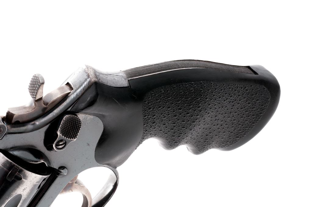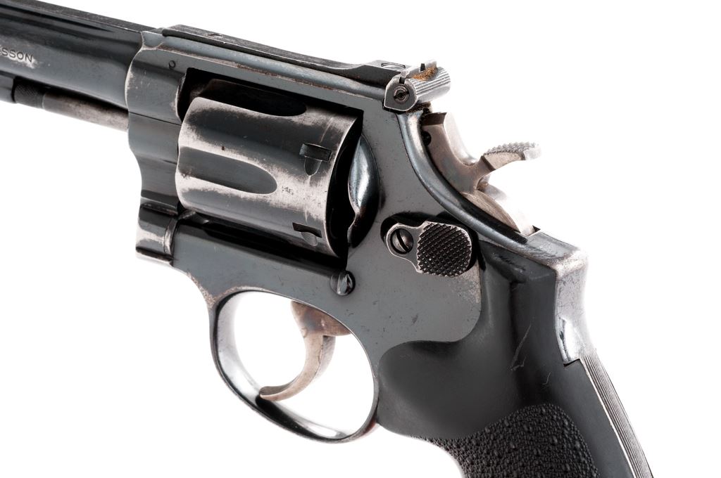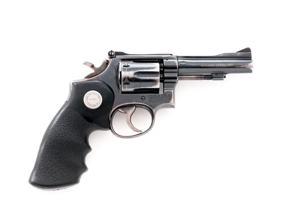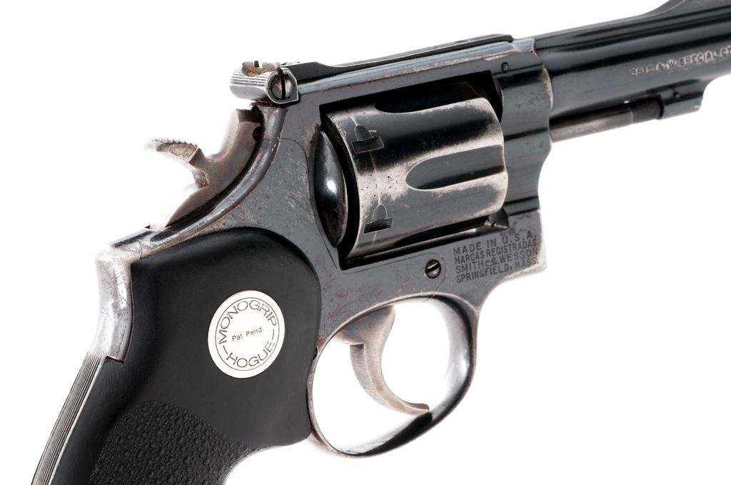 Smith & Wesson Model 15-3 K-38 Combat Masterpiece Double Action Revolver, #K995986, .38 Spec. cal., 4'' pinned barrel, blue finish, stippled black hard rubber Hogue Monogrip with finger grooves, case hardened hammer and trigger, ramped front sight with added red paint and square-notched adjustable rear sight. Mfg'd 1970. Condition is good with approx. 70% remaining original blue finish and 65% case colors. Factory lettering is clear. Grips with general moderate scuffs and scratches to the smooth borders. Very good action and bore. Est.: $250-$450. (Modern/PPT)