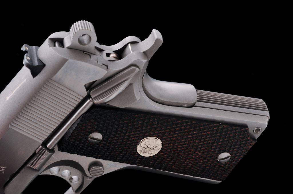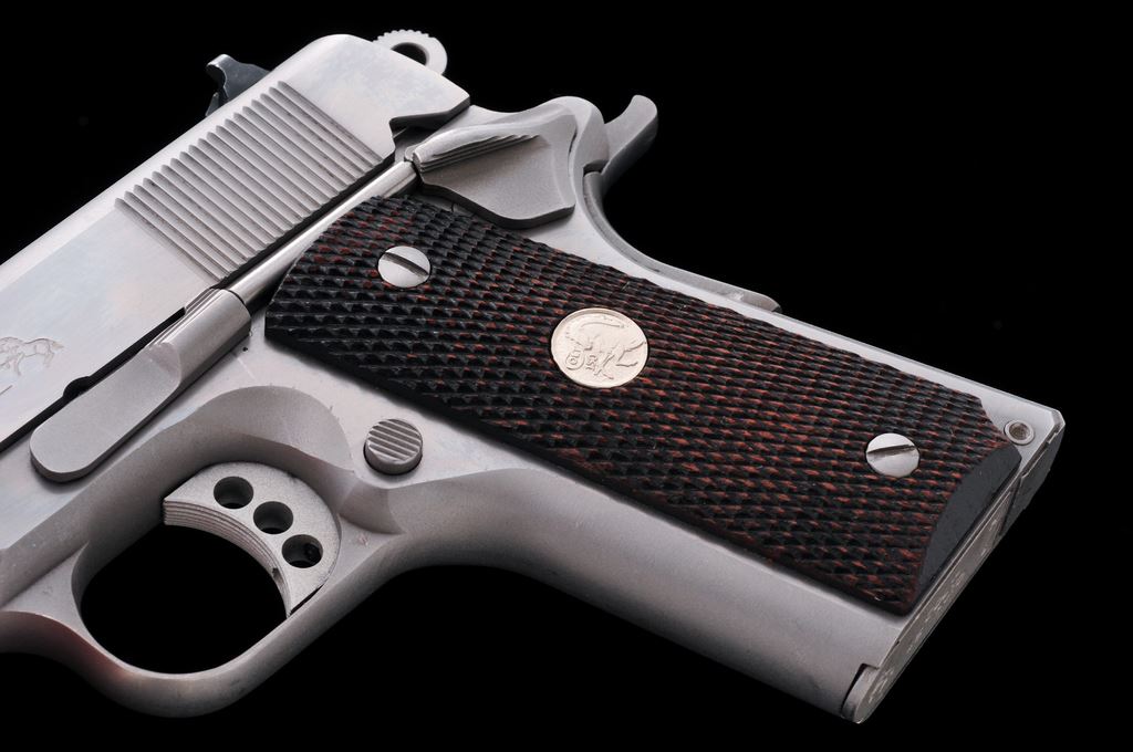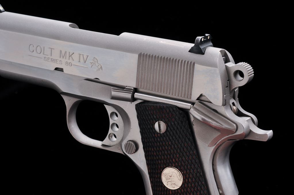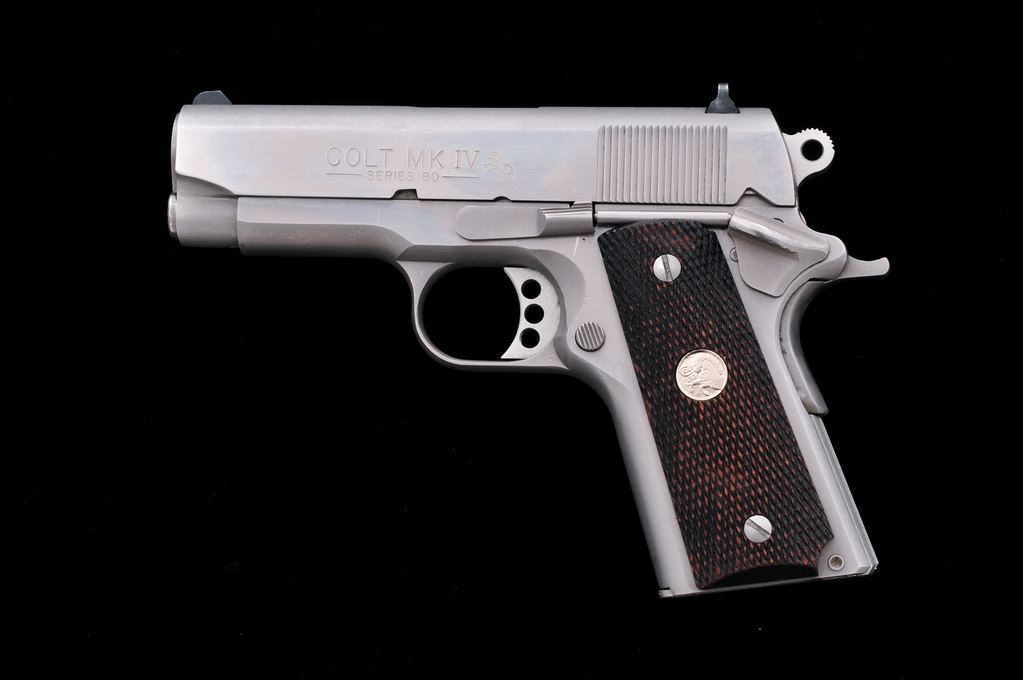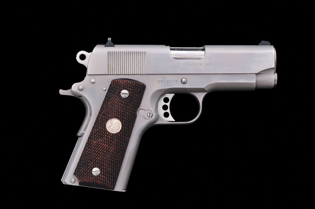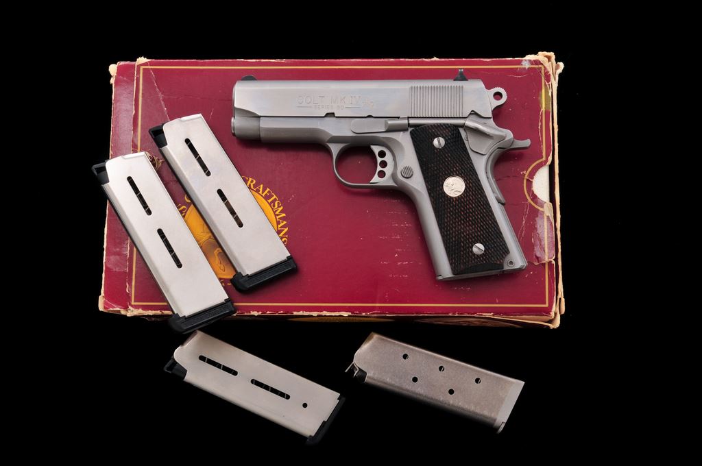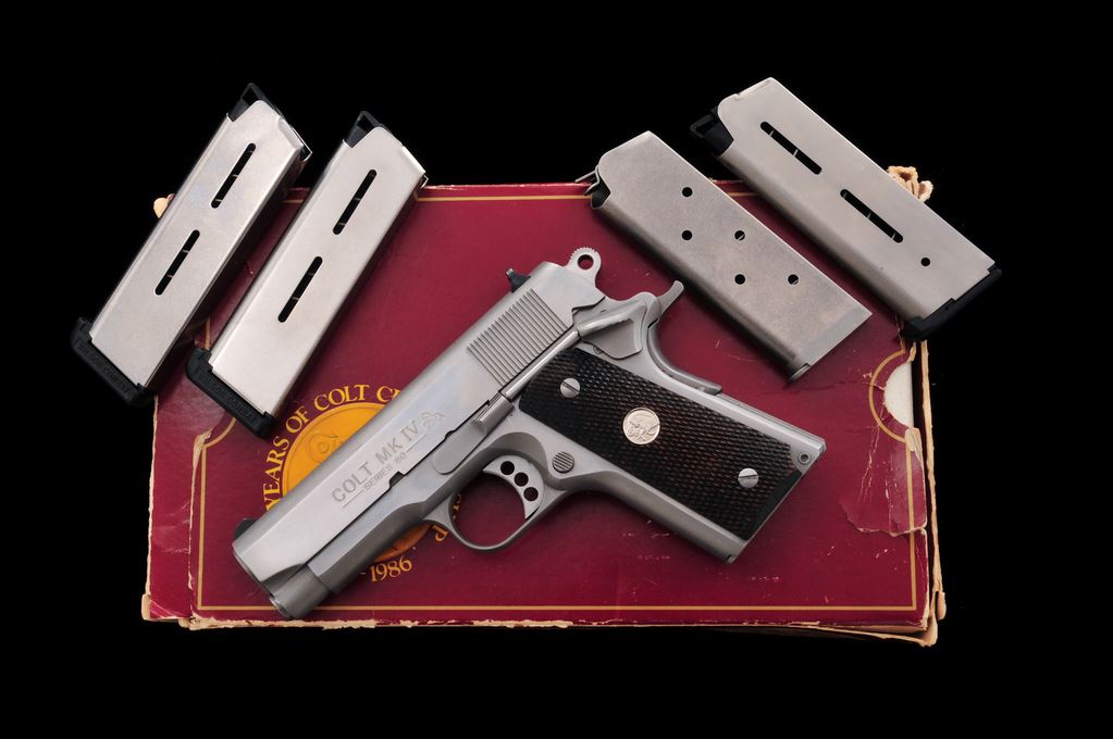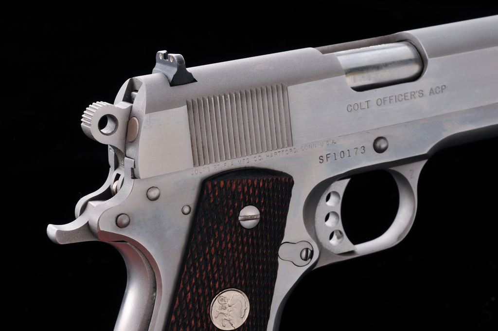 Colt MK IV Series 80 Officer's ACP Semi-Automatic Pistol, #SF10173, .45 ACP cal., 3.5'' barrel, stainless steel, checkered walnut grips with silver Colt medallions, and fixed white 3-dot sights. Includes five (5) total magazines, two (2) are factory Colt magazines; one with matte stainless base, the other bright stainless. Other three (3) magazines are made by Wilson Combat; two are still in the original packaging. In original box with matching end label, two-piece styrofoam insert, owner's manual, and misc. factory paperwork. Overall condition is very good showing general light scratches and signs of range use. Factory lettering is crisp. Grips show general moderate wear; medallions are bright. Action is smooth and tight; very good bore also shows moderate use. Box shows age and storage wear. Est.: $500-$700. (Modern/PPT)