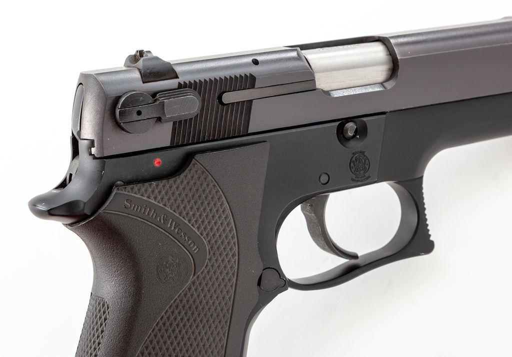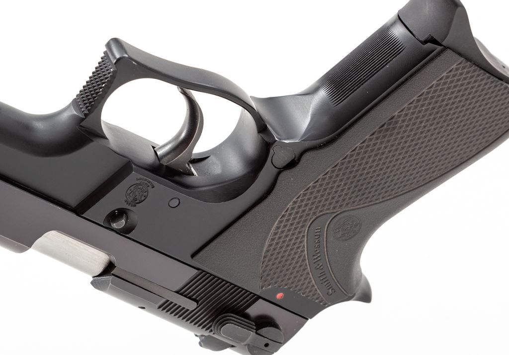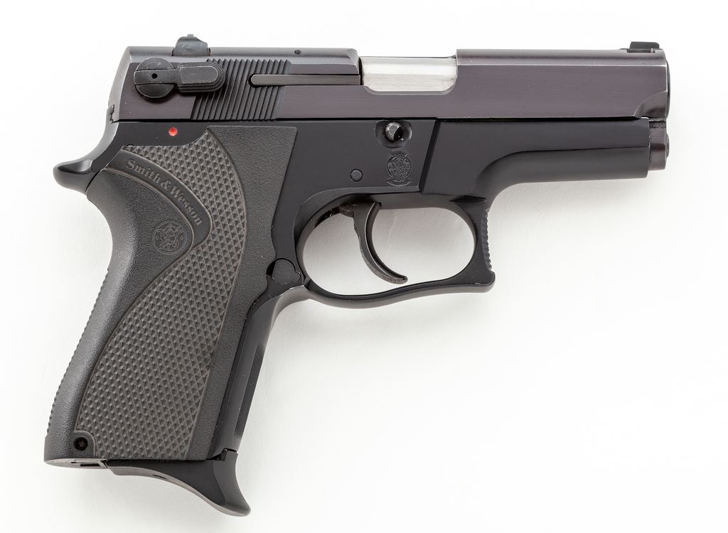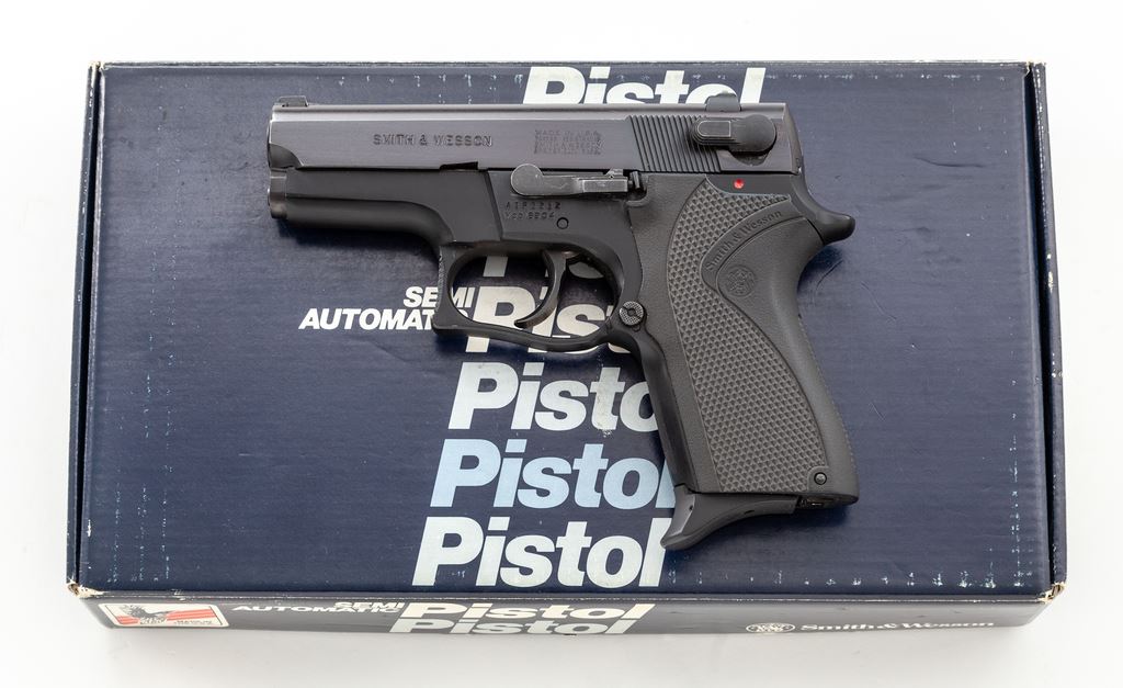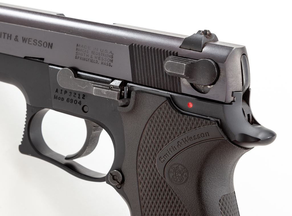 Smith & Wesson Model 6904 Compact Semi-Automatic Pistol, #AIP3212, 9mm, double/single action, 3.5'' barrel, blued steel slide, black alloy frame, checkered black plastic factory S&W grips, ambidextrous safety/decocking lever, concealed hammer, white dot front sight, white 2-dot rear sight, with two (2) 12-round magazines; magazine with black plastic finger extension. In original box with matching end label, owner's manual, other misc. factory paperwork, S&W packing paper, and cleaning accessories. Condition is near excellent, with approx. 97% factory finishes showing light high edgewear. Grips appear near new. Blued steel slide has toned to a light plum color. Action is tight with an excellent bright bore. Est.: $300-$500. (Modern/PPT) (High-cap mags not available to Calif. residents.)