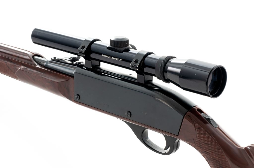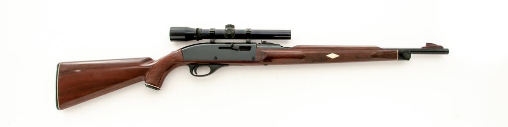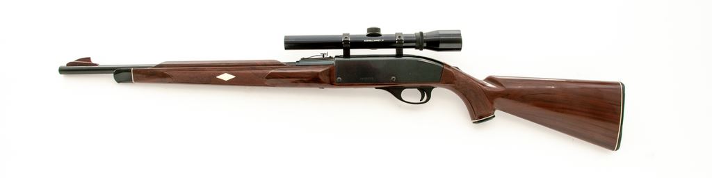 Remington Nylon 66 Semi-Automatic Rifle, #2430310, .22 LR cal., 19.5'' barrel, blue finish, checkered ''Mohawk'' brown plastic stock, factory black plastic Remington buttplate, Nylon 66 decorative grip cap, factory grooved receiver with standard sights, including an adjustable rear sight. Topped with a Bushnell Banner .22 scope with duplex reticle. Barrel date code is ''DY'', mfg'd 1974. Overall condition is very good with approx. 96% original finish; thinning and wear to the upper left edge of the receiver accounts for a majority of the finish loss. Factory lettering is clear. Stock shows some scattered thin scratches and small handling marks, predominantly on the forend. Smooth action, bright bore. Scope optics are clear. Est.: $200-$300. (Modern)