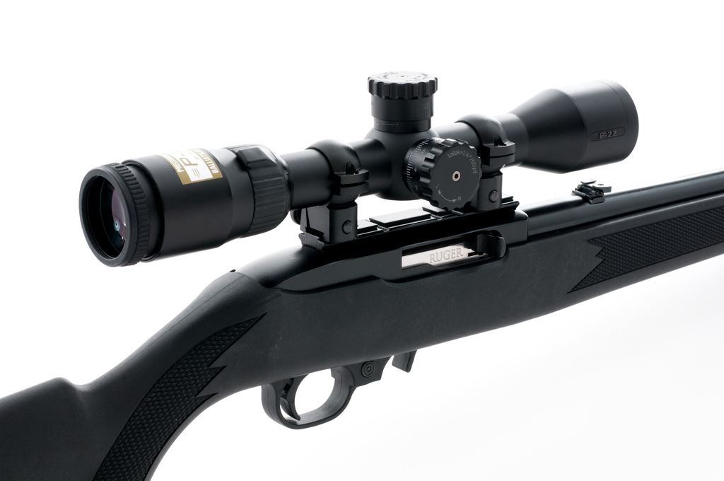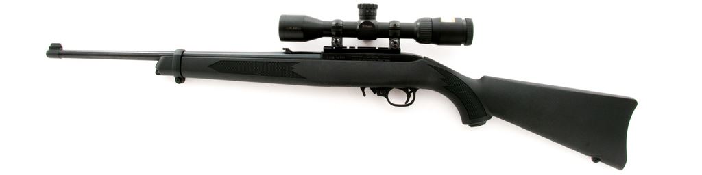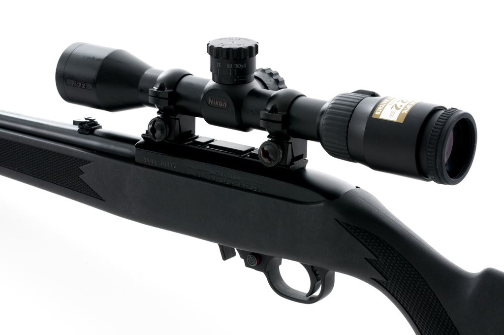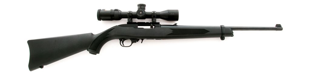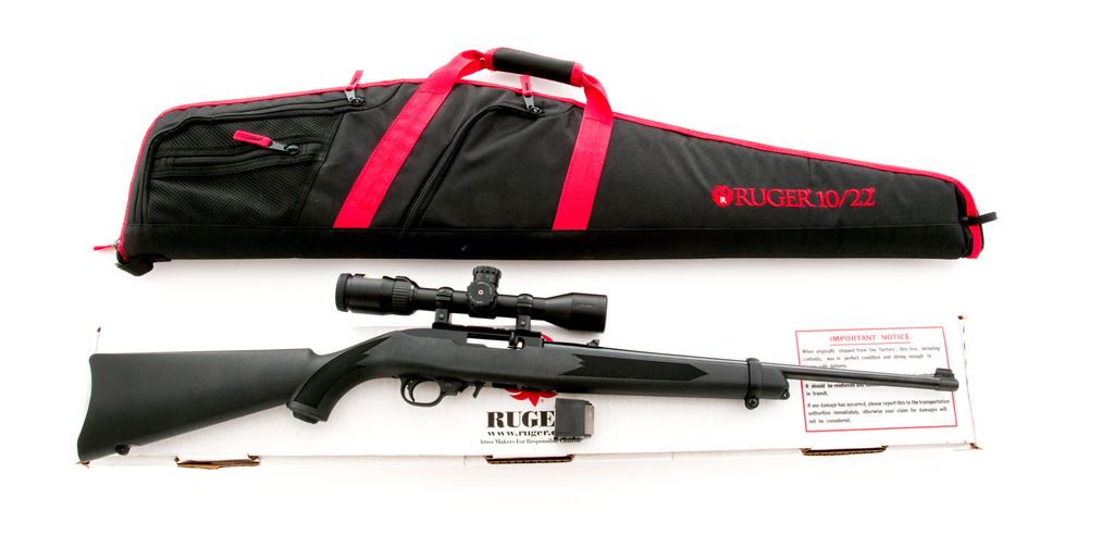 Ruger 10/22 Semi-Automatic Carbine, with Nikon scope, #0008-10195, .22 LR cal., 18.5'' blued steel barrel, black receiver, black synthetic factory stock with integral sling swivel studs, and standard sights including a ''U''-notched folding rear sight, and two (2) factory 10-round magazines. Topped with a Nikon P-22 2-7x32 ballistically matched scope; scope with a duplex reticle and original plastic lens covers. Included is the original box that is numbered to the gun, owner's manual, gun lock, and padded red and black 10/22 soft gun case. Rifle and scope are both in excellent as new overall condition. Stock shows a few slight handling and scuff marks. Action is smooth with a bright bore. Scope optics are bright and clear. Est.: $250-$400. (Modern)
