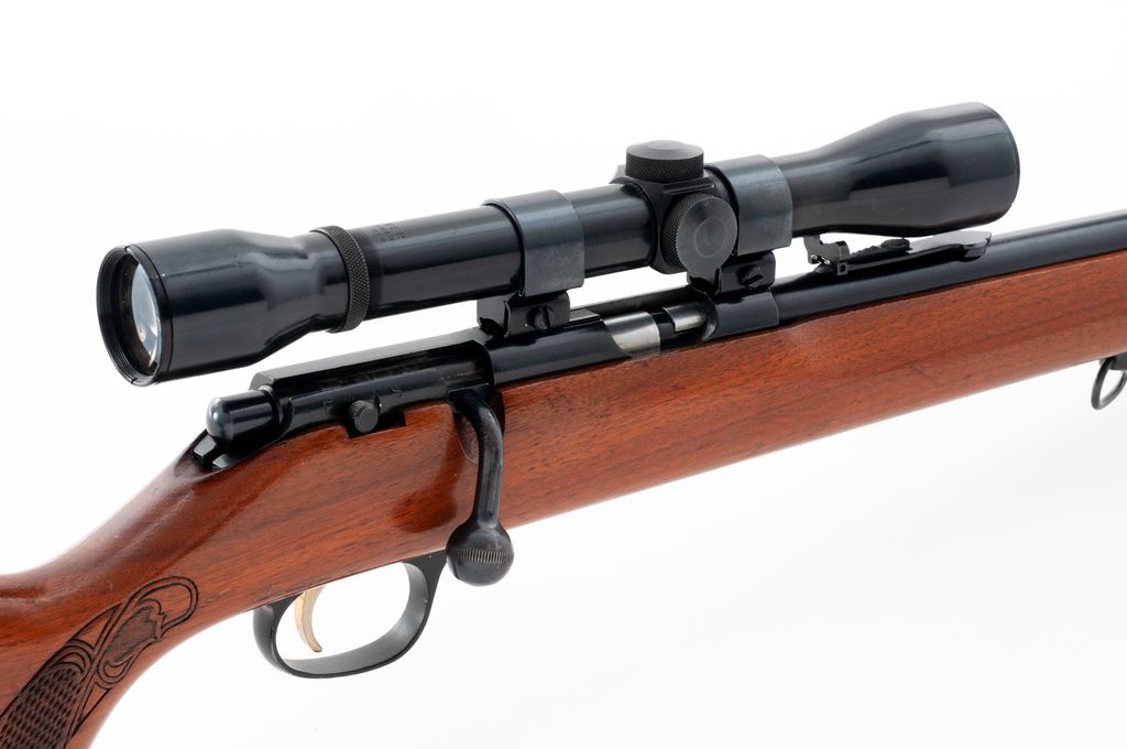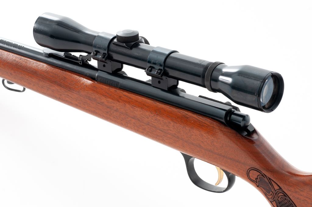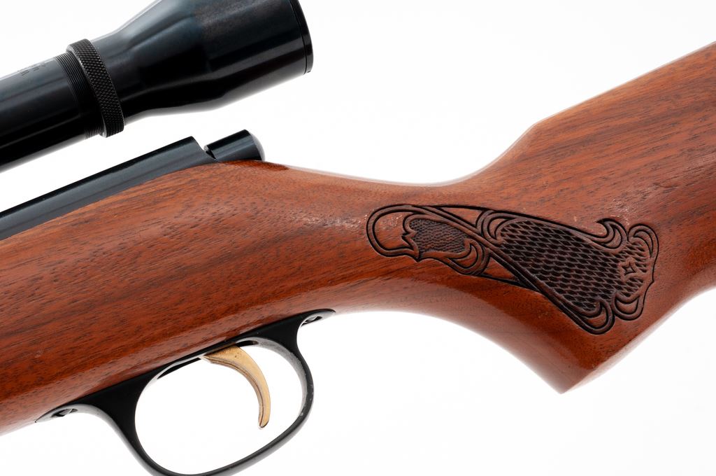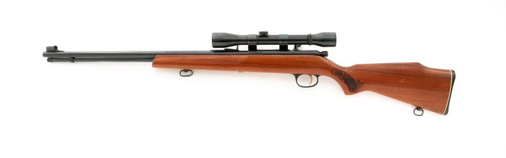 Marlin Model 783 Bolt Action Rifle, with scope, #20695768, .22 WMR cal., 22'' barrel, blue finish, one-piece pistol-grip walnut stock with decorative press checkering at the wrist and forend, hooded brass bead front sight, folding semi-buckhorn rear sight, factory grooved receiver, with a Weaver Marksman scope and 1'' Weaver rings; scope with fine crosshair reticle. Condition is very good with approx. 96%-97% original blue finish remaining; barrel with a few scattered specks of oxidation. Front half of stock is mostly smooth with a nice even semi-gloss finish; buttstock with shallow impressions and a few spots of flaking/wear to the finish. Action is smooth, bore is excellent. Scope exterior shows only minor light handling marks; optics are a little cloudy with a couple of internal dark specks. Est.: $150-$250. (Modern)