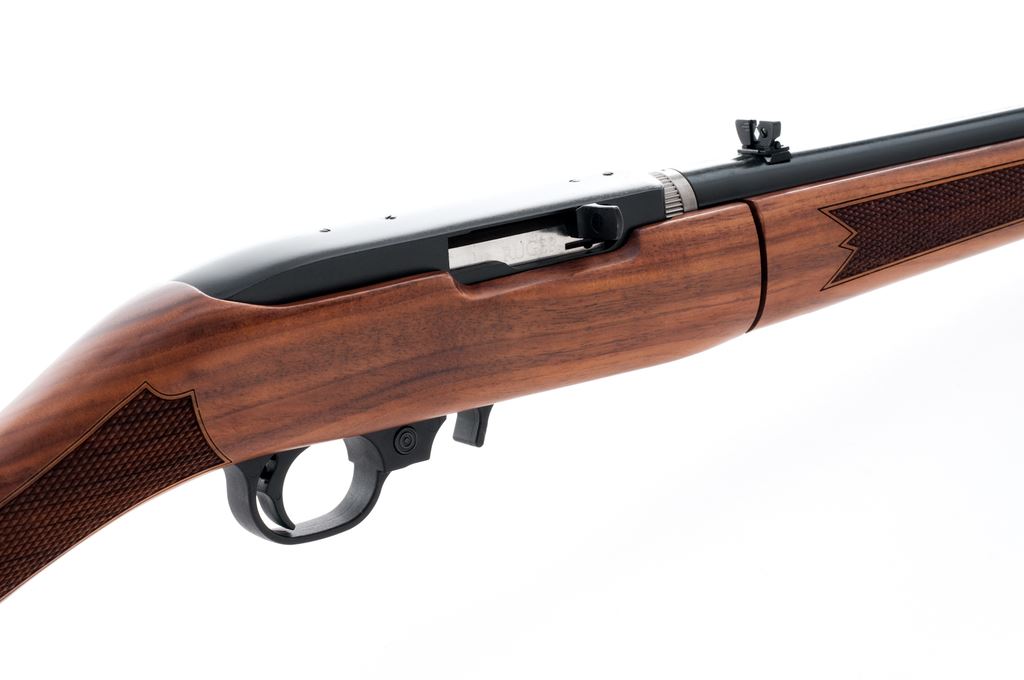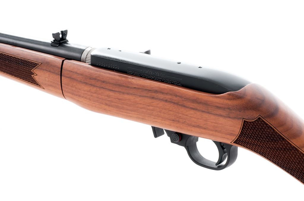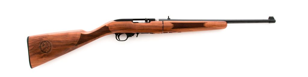 Like New Takedown Ruger 10/22 Classic VI Semi-Automatic Carbine, #0006-81854, .22 LR cal., 18.5'' blued steel barrel, black receiver, and standard sights including a ''U''-notched folding rear sight, with one factory 10-round magazine. Straight grip walnut stock with nice factory checkering at both the wrist and forend, as well as a laser engraved Ruger logo on right side of buttstock. Includes the original padded carrying case, original box that is numbered to the gun, and cable lock. Rifle is in excellent like new condition showing only a few slight handling marks to the barrel at takedown point. Wood shows no visible wear with clean sharp checkering. Excellent action and bore. If this rifle was fired, it was fired very little. Est.: $200-$350. (Modern)