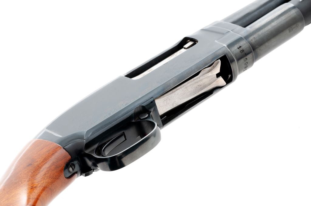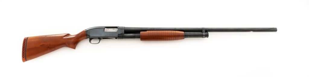Winchester Model 12 Magnum Slide-Action Shotgun, #1875991. 12 ga. 30'' plain barrel is marked ''For Super Speed & Super-X 3 In.'', has a 3'' chamber and is choked Full. Late 14-groove forend and pistol-grip buttstock are of standard walnut without checkering but with red vented Winchester butt pad. Mfg'd 1961. Condition is near excellent, with few handling marks to wood but very little wear to action, which functions well; bore is bright. Est.: $450-$550. (C&R)