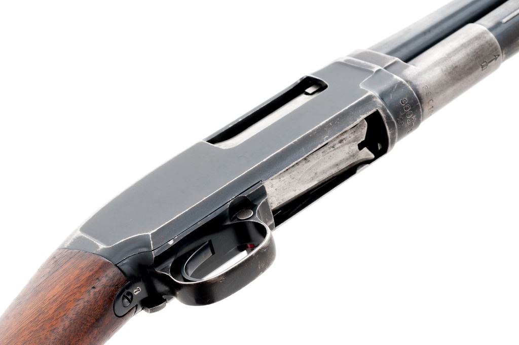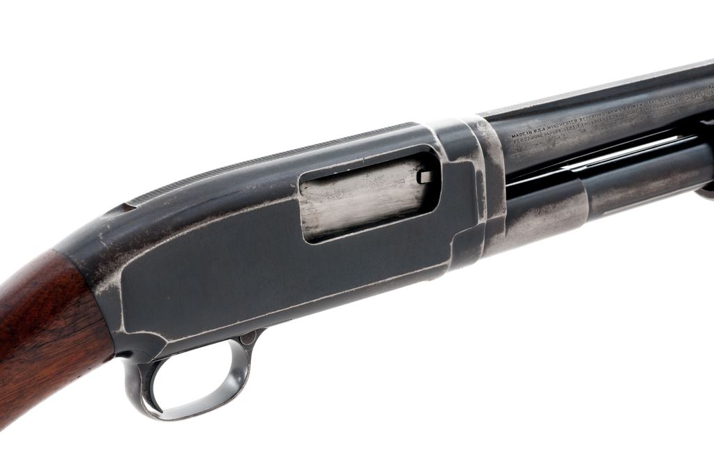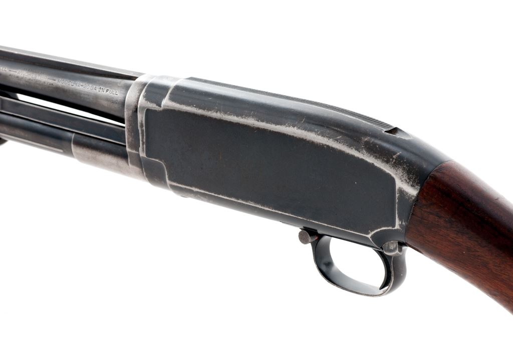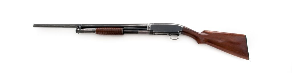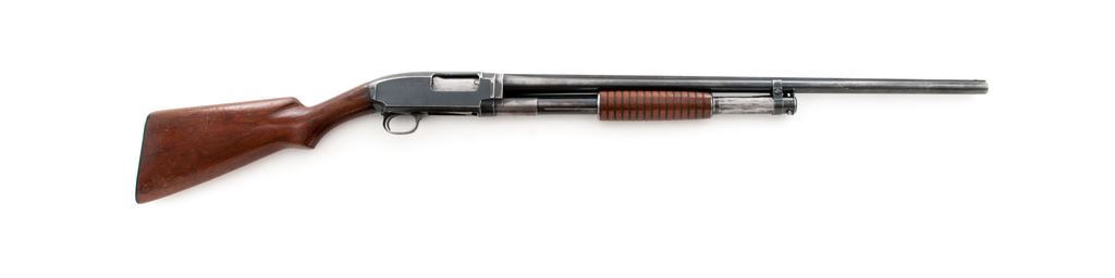 Winchester Model 12 Field Grade Slide-Action Shotgun, #390151. 20 ga. 26'' ''Nickel Steel'' solid rib barrel has a 2-3/4'' chamber and is choked Full. Wood is Standard Grade walnut, with early forend, buttstock and buttplate configurations. Mfg'd 1925. Condition is good to very good, with numerous handling marks and loss of finish to wood, edge and carry wear to receiver and magazine tube, but no heavy wear to the action, which functions smoothly and correctly; bore is good. Est.: $400-$500. (C&R)