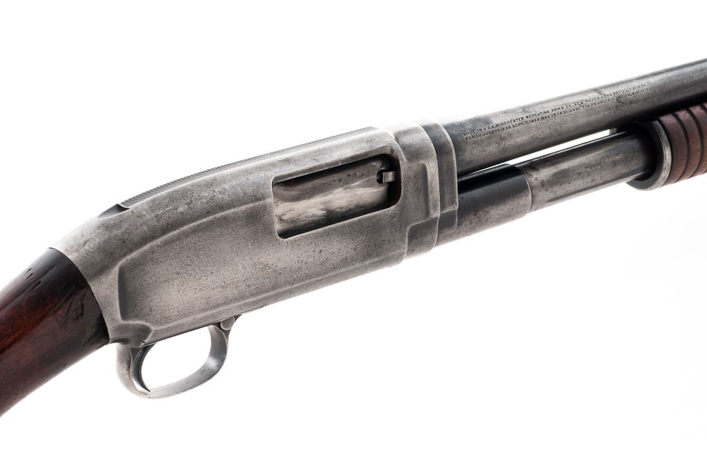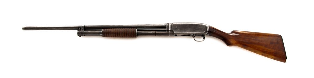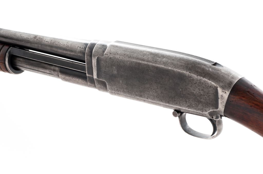 Winchester Model 12 Slide-Action Shotgun, #104740, 16 ga., 36'' plain ''Nickel Steel'' barrel, barrel stamped Full (choke gauge reads ''Cyl''); pistol-grip walnut stock, 14-groove forend, with black composition Winchester buttplate. Mfg'd 1915. Condition is good, with metal surfaces having worn to a combination silver with dark spotting; factory lettering is clear. Stock with dings, mars, and an added coat of finish that has started to flake in areas; right front edge of wrist with a chip missing as well as a hairline crack. Buttplate with a piece missing at the toe. Forend is in original condition with little finish remaining and two hairline cracks to the left side. Action is crisp, bore rates fair and may improve with a thorough cleaning. Est.: $150-$250. (C&R)