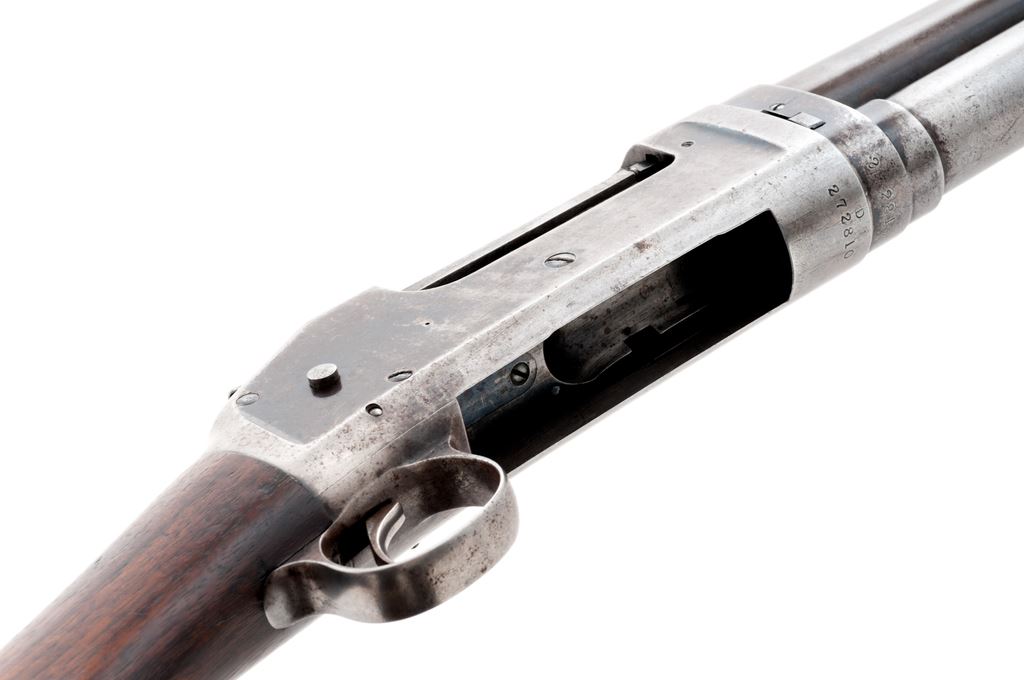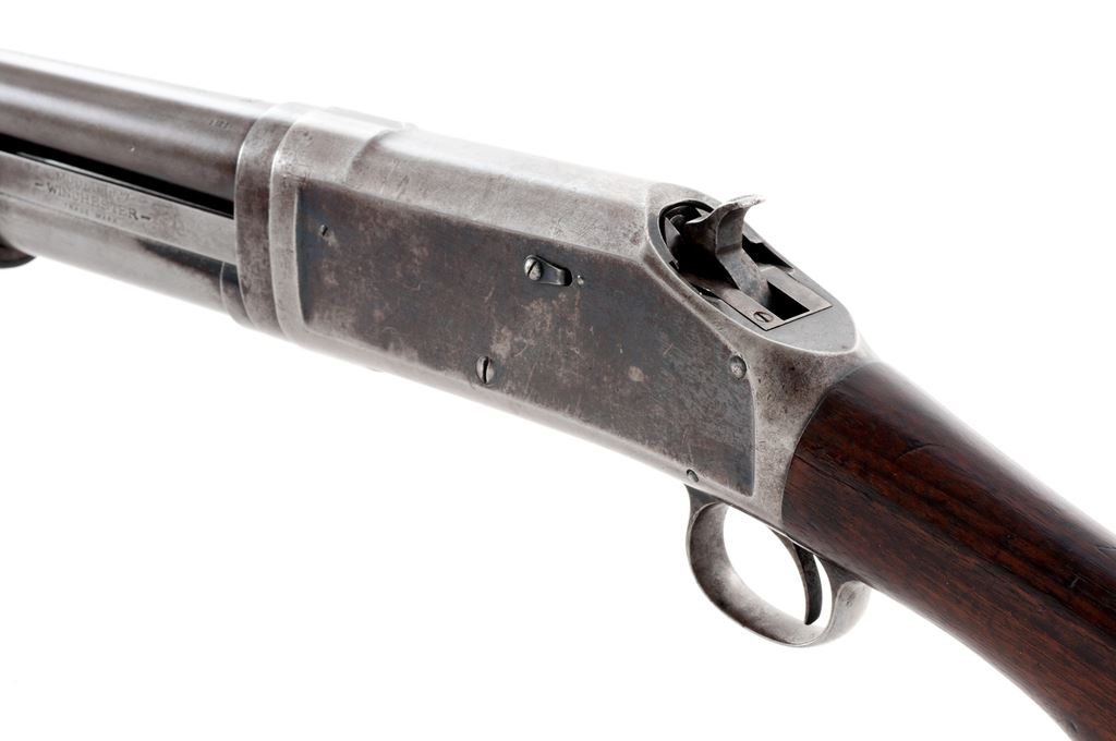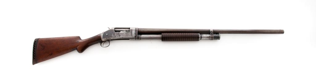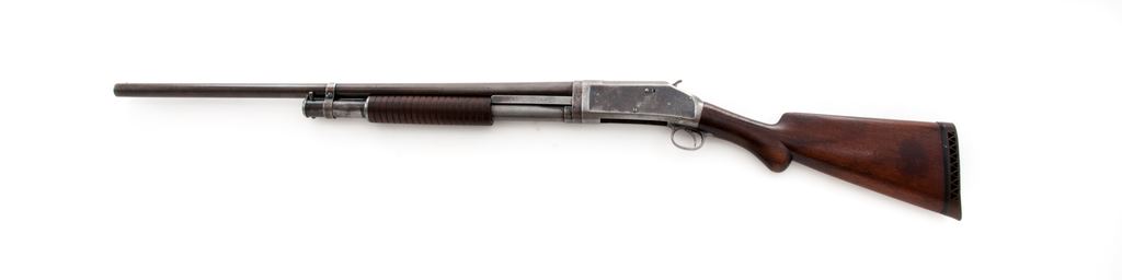Winchester Model 1897 Field Grade Slide-Action Shotgun, #272810. 12 ga. 28'' plain barrel has a 2-5/8'' chamber and is choked Full. Standard Grade walnut used on circular forend and pistol-grip buttstock, with ''Ted Williams'' butt pad added. Receiver is standard '97 with improvements through ''D'' modification. Mfg'd 1905. Condition is very good, as the action and takedown feature function correctly. Very little blue left on receiver, barrel is turning brown, and wood has typical handling marks. Bore is good. Est.: $300-$400. (C&R)