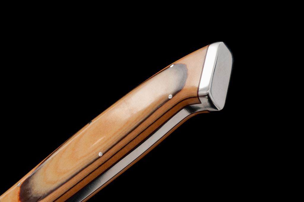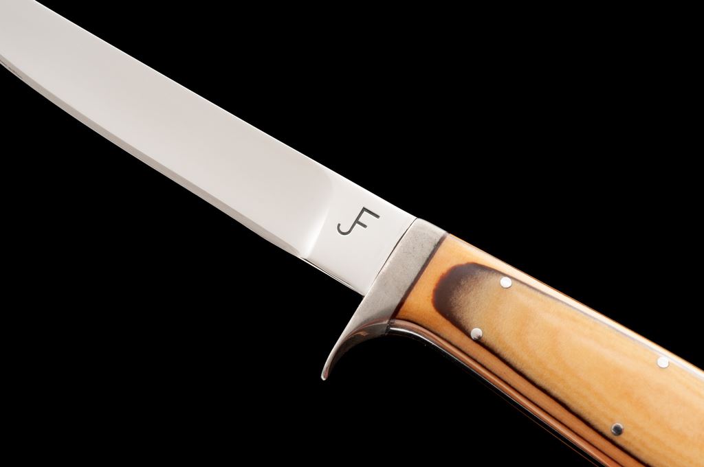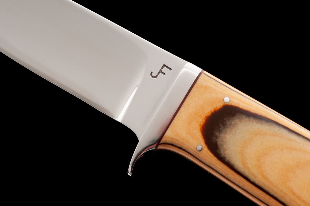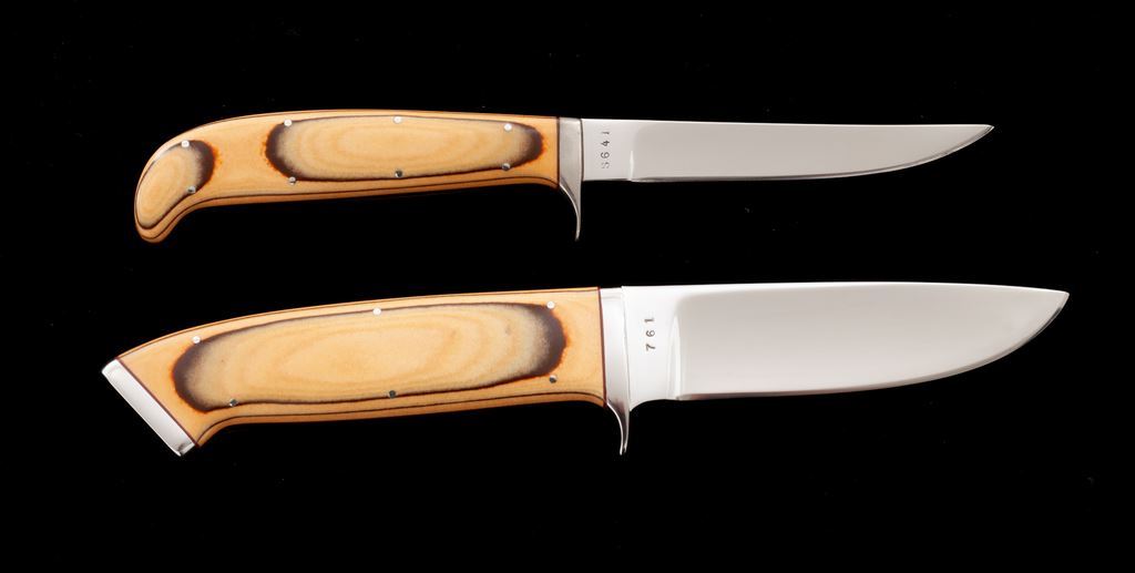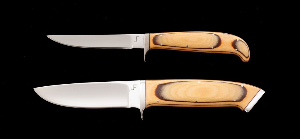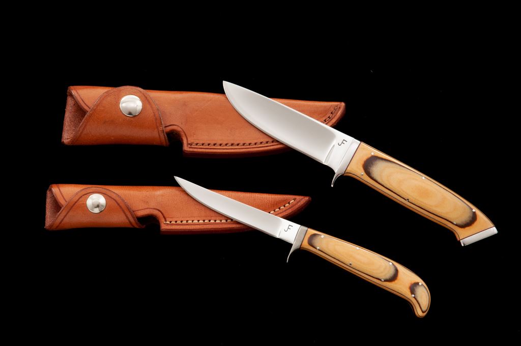 Lot of Two (2) Joe Funderburg Custom Knives, with sheaths: 1.) 3-7/8'' drop point blade that is marked ''JF'', and ''761'' on the opposite side; 8-1/4'' overall, nickel silver guard and pommel, butterscotch colored laminate wood handle with a single thin red spacer to each side; handle is held in place by nickel silver pins. In a tan leather sheath with wide wrap around keeper strap. 2.) The second knife and sheath are made to match the first knife with the same handle color and material, as well as the same color and style of leather sheath, the difference being that this knife is a thinner ''Bird & Trout'' style knife, with a 3-5/8'' blade that is marked ''JF'', and ''S641'' on the opposite side; 7-1/2'' overall. Both knives are in excellent overall condition and appear unused. Guards and laminate wood show minor handling marks. Sheaths with light scuffs and storage wear. Est.: $200-$350/lot.