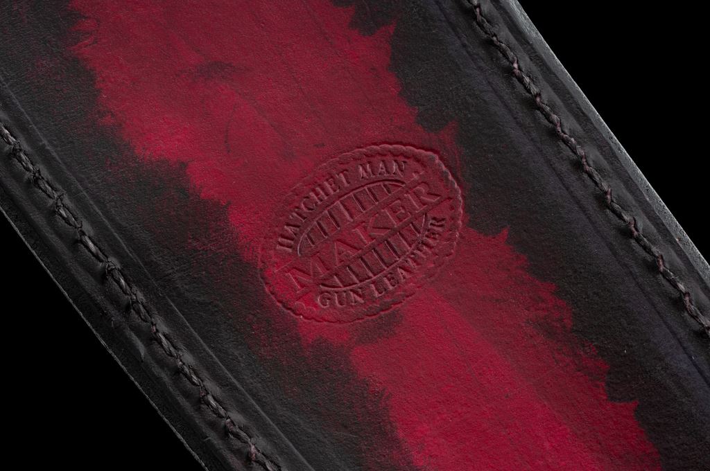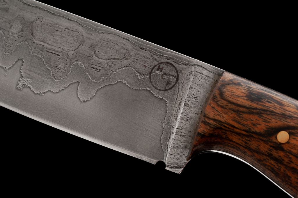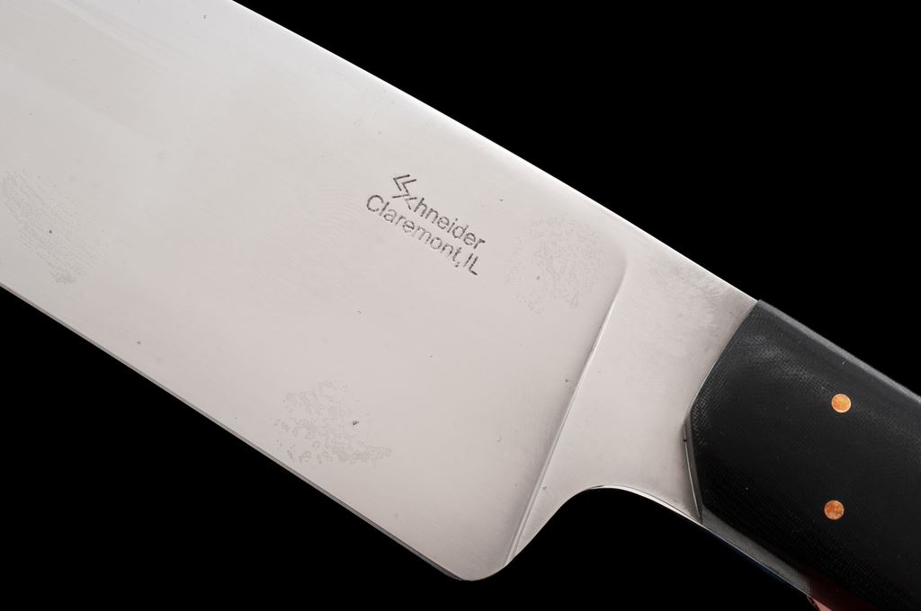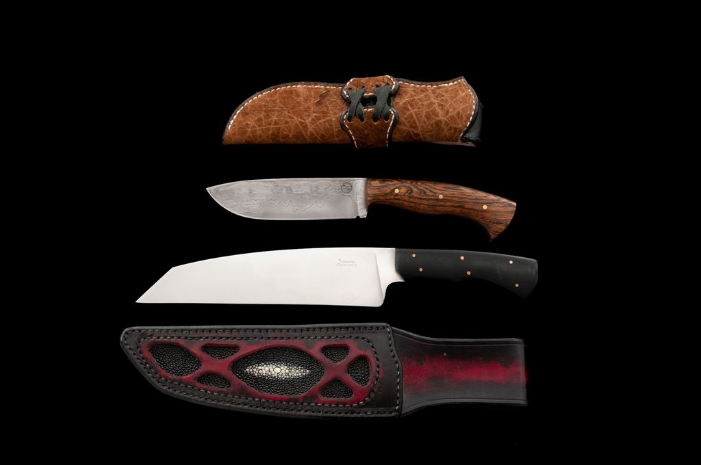 Lot of Two (2) Custom Fixed Blade Knives, by Craig Schneider and Colton Kiso/Heath Creek Forge: 1.) Chef's knife, by Craig Schneider of Claremont, IL; 8-1/4'' blade, 12-3/4'' overall with black micarta handle. In dyed leather sheath with inlaid panels that appear to be ray skin; back is stamped ''Hatchet Man Gun Leather''. Knife is excellent overall. Blade with a few slight scratches; cutting edge appears as new. Sheath shows a few spots of very minor storage wear. 2.) Colton Kiso, Heath Creek Forge, 5-1/4'' drop-point laminated steel blade, tapered tang, wood handle held in place by brass pins, with two-tone black and tan leather sheath. Knife is in excellent overall condition. Blade appears unused. Sheath with small surface layers of the suede that have worn or torn off; back with a few noticeable scratches; stitching and seams are excellent. Est.: $200-$400/lot.