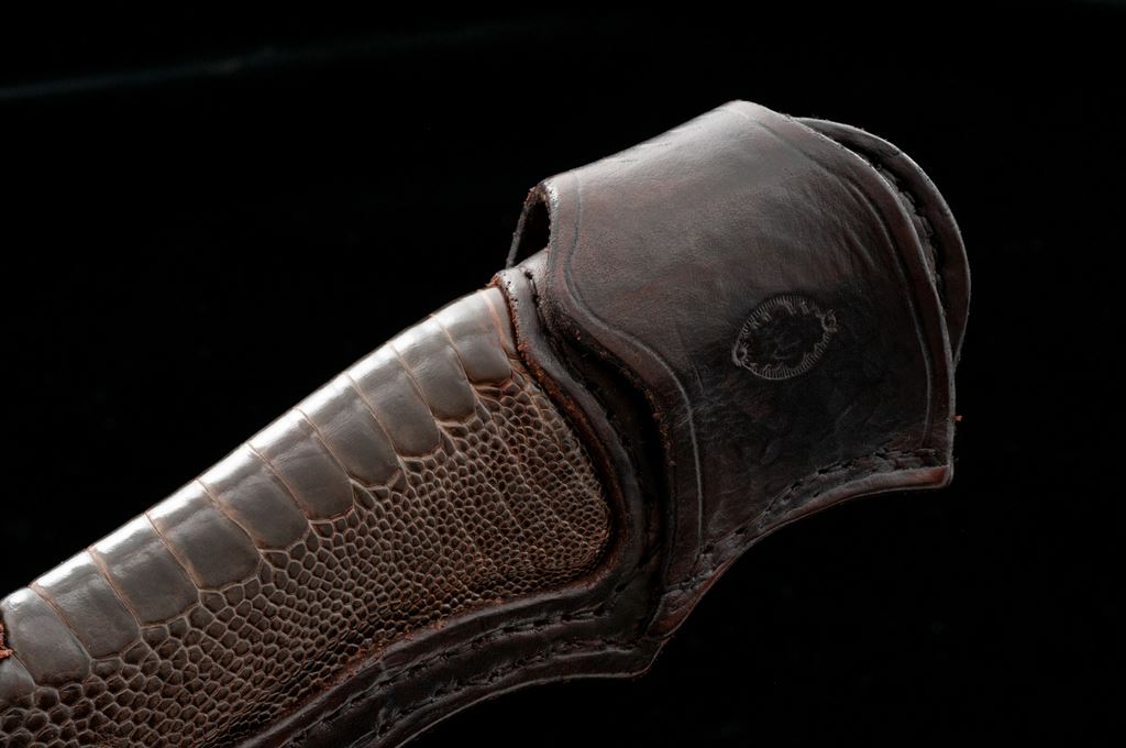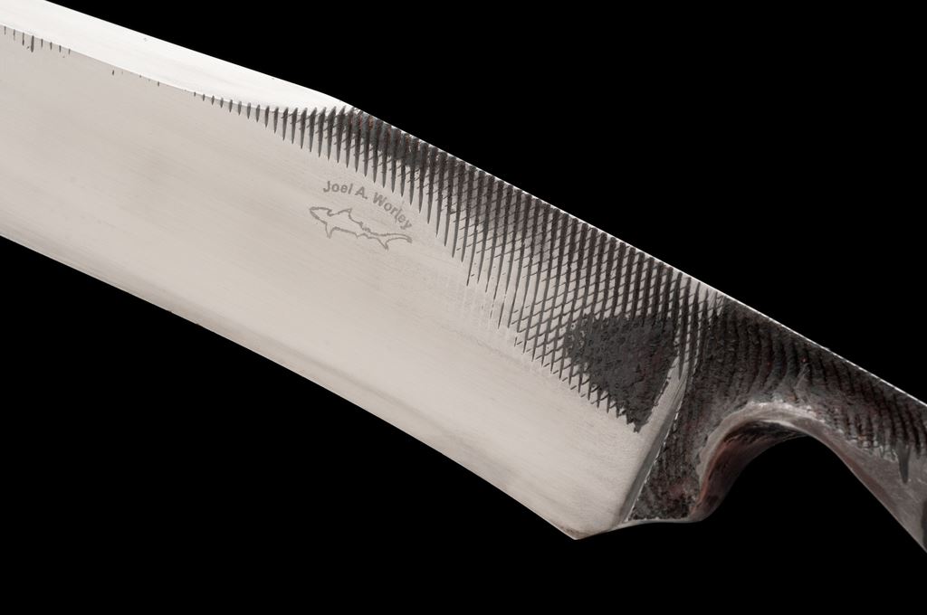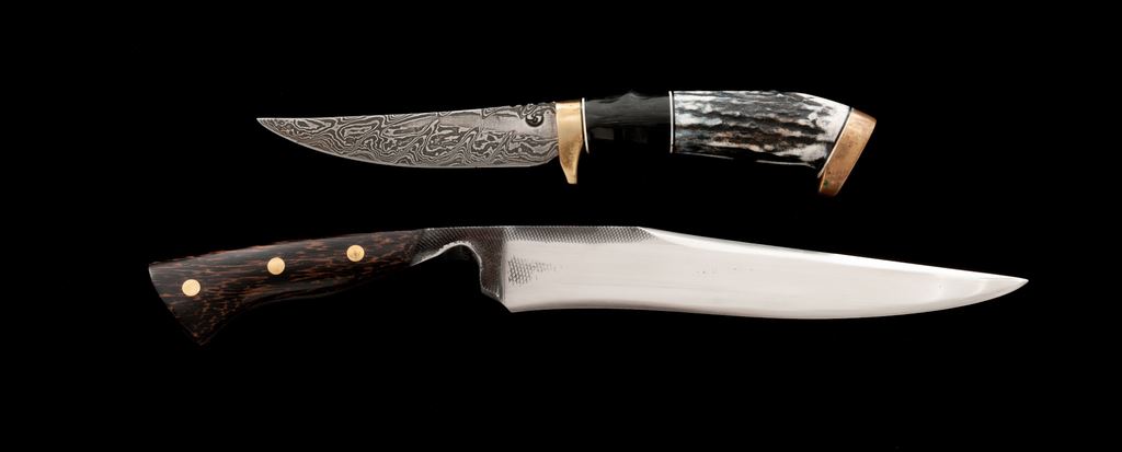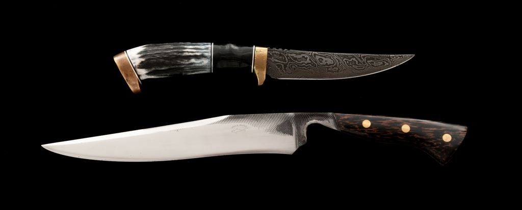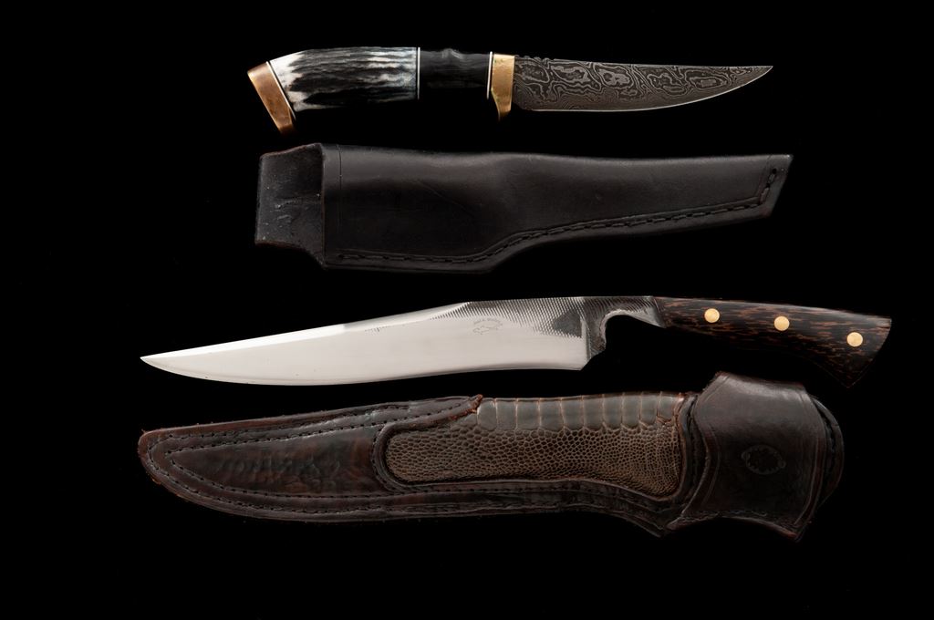 Lot of Two (2) Custom Fixed Blade Knives, by Ray Rantanen and Joel A. Worley: 1.) Damascus blade knife, by Ray Rantanen, 4-3/4'' blade, 9-1/2'' overall. Single brass guard and pommel, with a handle that is a combination of antler and what looks like Blesbok antelope horn, with white and black spacers. In black leather sheath that is stamped on back ''RR''. Blade rates as excellent with a clean and sharp cutting edge. Brass pieces with some dark toning and verdigris; both would improve with a thorough cleaning. Sheath is very good showing light storage wear. 2.) Joel A. Worley Custom, 8'' blade is hand forged from an old file, 13-1/4'' overall, tapered tang, with wood handles. In nicely made dark leather sheath with an inlaid piece of what looks like alligator skin; leather has a light ''hammer forged'' type appearance and a majority is double stitched. Condition is excellent with scattered light scratches and small marks from handling. Est.: $350-$550/lot.