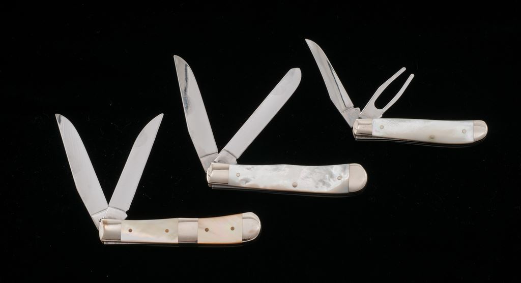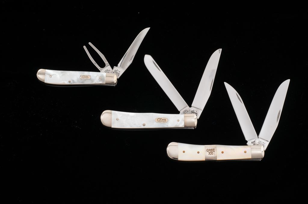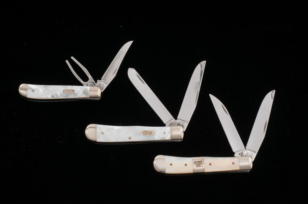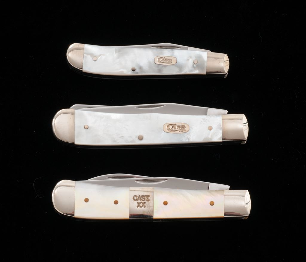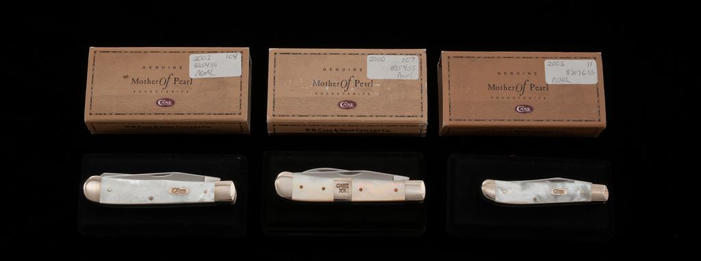 Lot of Three (3) Limited Edition Case Mother of Pearl Series ''Trapper'' Folding Knives: 1.) #8207G SS, with pearl handles, and golf tool. In the original black velvet box with correct slip cover. Mfg'd 2003. 2.) #8254 SS, with pearl handles. In the original black velvet box with correct slip cover. Mfg'd 2000. 3.) #8254 SS, with pearl handles. In the original black velvet box with correct slip cover. Mfg'd 2002. All of the knives are in excellent as new condition, never carried or sharpened. Beautiful pearl handles are free of chips or cracks. The velvet box for knife #2 with some moderate damage to the lid; upper and lower portion do not line up properly. Slipcover is also creased. Est.: $300-$500/lot.
