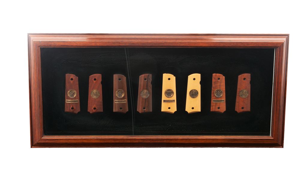 Colt's WWI 1911-A1 Commemorative Issued Grips, commemorating the four major battles in France during WWI in which American forces led the way. Each set of grips commemorates the following battles: Battle at Chateau Thierry; Battle of Belleau Wood; 2nd Battle of the Marne; Battle of Meuse Argonne. Grips are in excellent unused condition with medallions, produced by Colt in 1965 and never mounted on a gun. In 26''x12'' wood display. Est.: $400-$600/set.