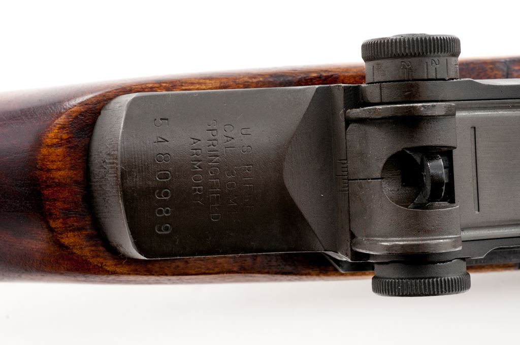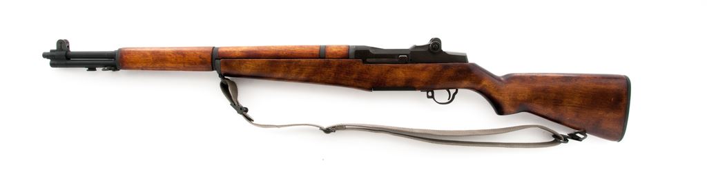 Springfield M1 Garand Semi-Automatic Rifle, #5480989, .30-06 cal., 24'' barrel, parkerized finish, walnut stock, blade front sight with protecting ears and adjustable aperture rear sight. Marked on receiver tang ''U.S.RIFLE CAL. .30 M1 SPRINGFIELD ARMORY'', and on right side of barrel ''SA'' and ''1 55''. Defense Dept. eagle stamp on left side of stock and circle ''P'' firing proof on underside of wrist. ''SA'' stamped on bolt, trigger housing, hammer, and operating rod. Condition overall is very good with over 95% of the dark parkerized refinish remaining on metal surfaces, with light wear on the bolt lugs and right side of receiver. Wood has been refinished with a dark semi-gloss stain and shows a few light handling marks on the forend and buttstock. Action is smooth, bore has some darkness at mid length, otherwise bright with very good rifling. No visible import stamps. Includes a reproduction U.S.G.I. cotton sling in excellent condition. Est.: $800-$1,100. (C&R)