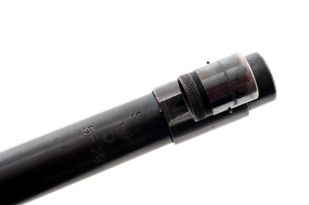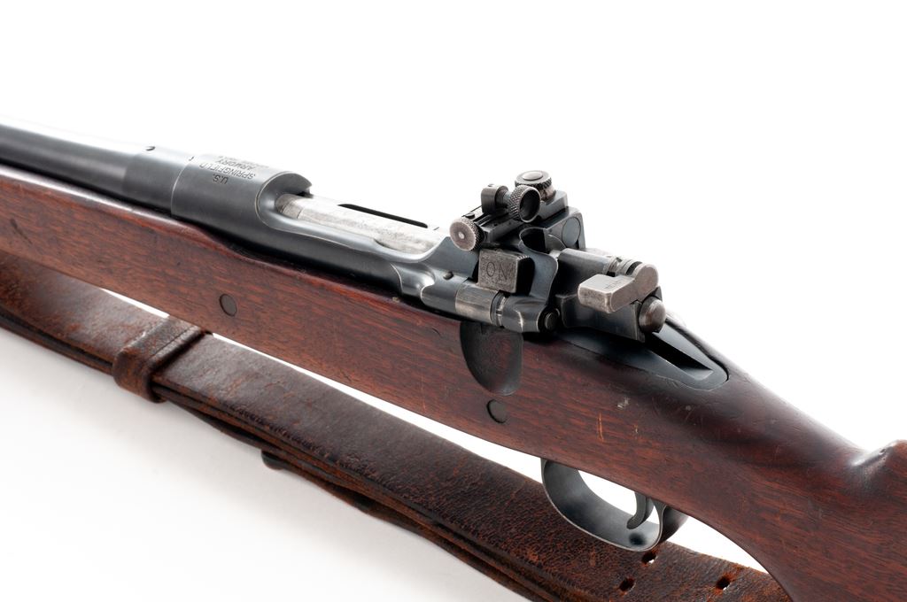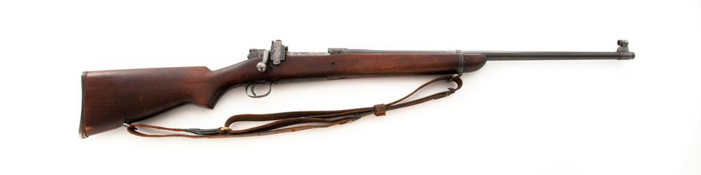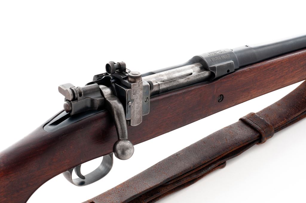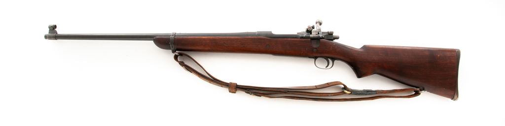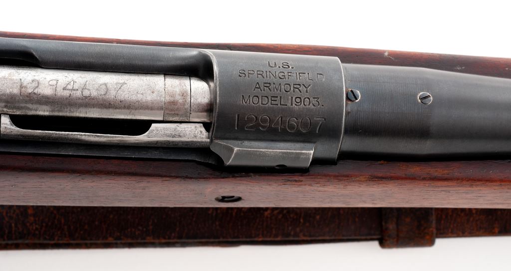 Springfield Model 1903 NRA Sporter Bolt Action Rifle, #1294607, .30-06 cal., 24'' star-gauged barrel dated 5-28, blue finish, factory smooth pistol-grip walnut stock, checkered steel buttplate, with Lyman 48 rear and standard rifle front sight with added hood. Top of barrel has been drilled and tapped for dovetail scope blocks. Includes WWI era M1907 sling. Condition is very good retaining approx. 85%-90% thinning blue. Stock with mild to just moderate scuffs and scratches overall. Bright matching numbered electro-penciled bolt shows mild carbon spotting. Star-gauged barrel is fine. Est.: $600-$800. (C&R)