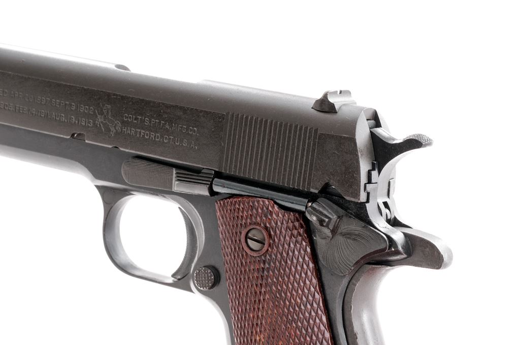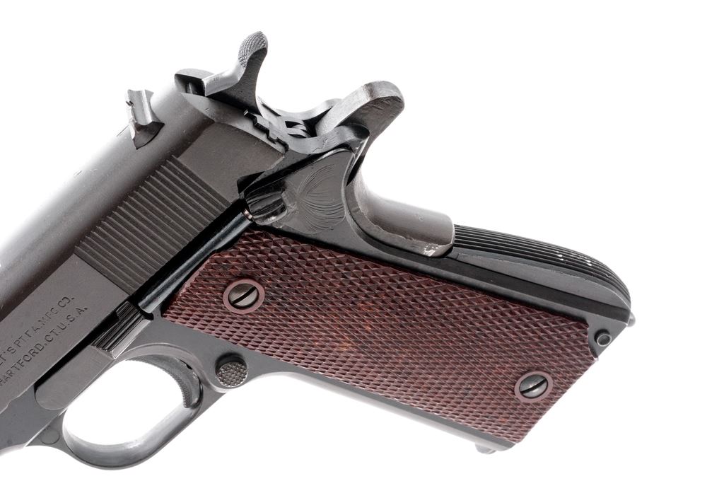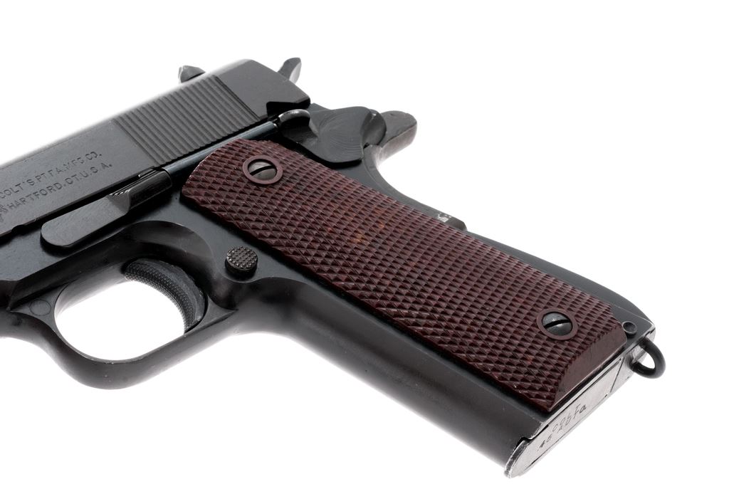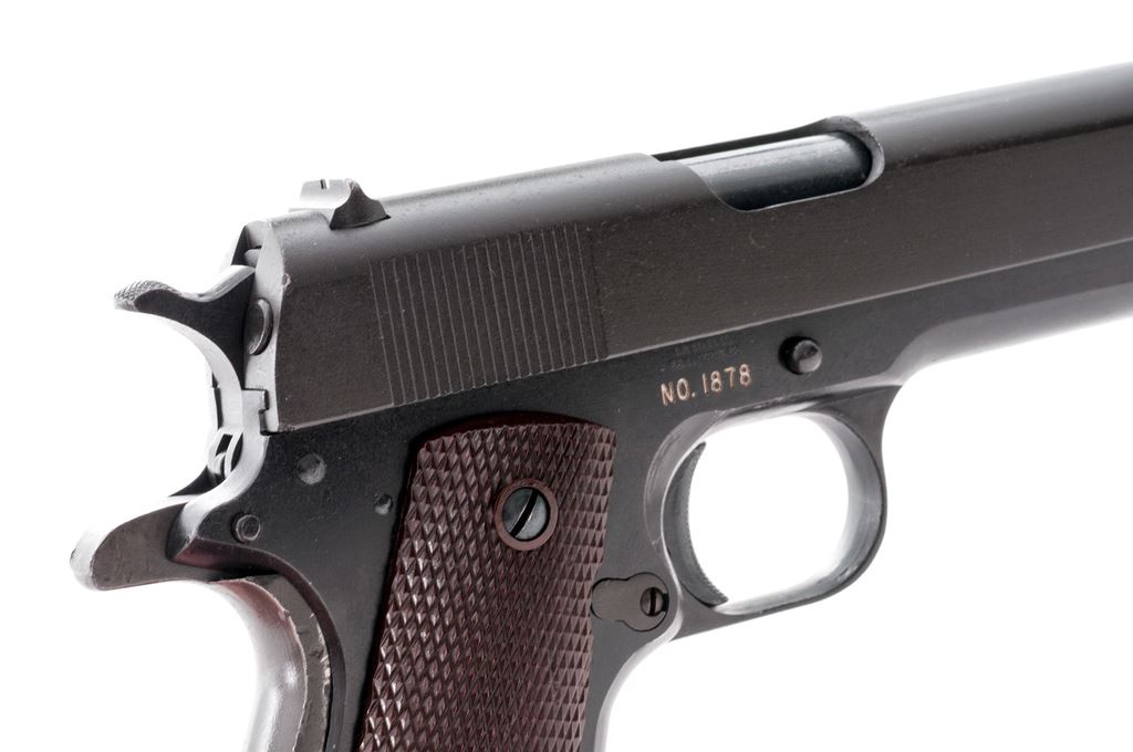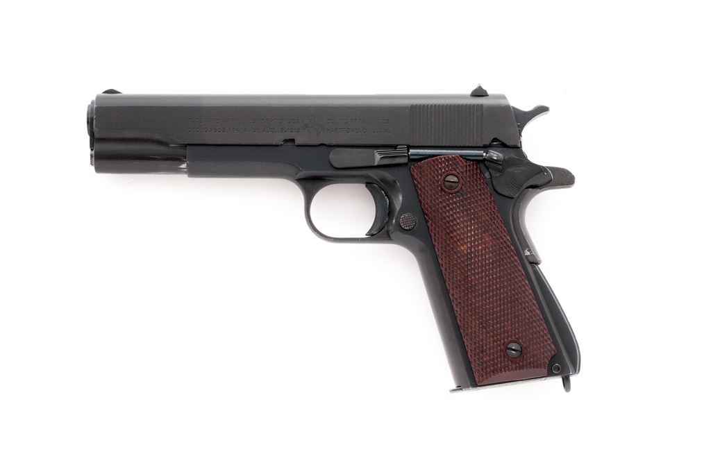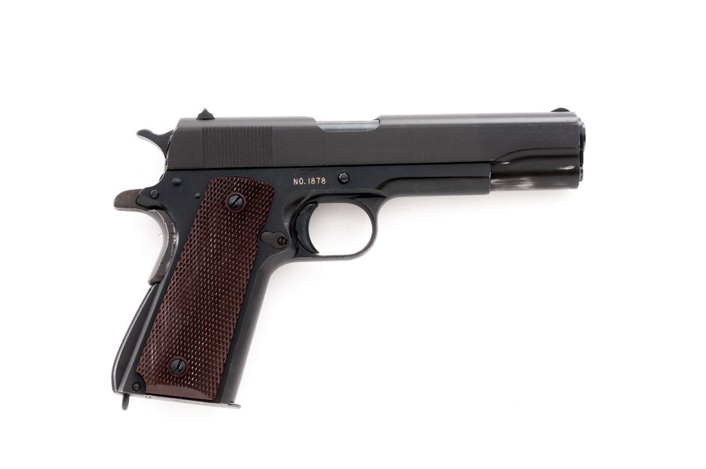 Composite Model 1911-A1 Semi-Automatic Pistol, frame by A.R. Sales Co./So. El Monte, CA, #1878, .45 ACP cal., 5'' WWII Hi-Standard barrel, parkerized finish, WWII era brown checkered plastic grips with thin reinforcing rings. Includes one Post-WWII Colt marked magazine. Condition is excellent using mostly GI parts, except for frame. Pistol shows some thinning to forward portion of slide, as well as barrel hood. Grips with minor wear. Good action, very good bore. Est.: $500-$750. (Modern/PPT)