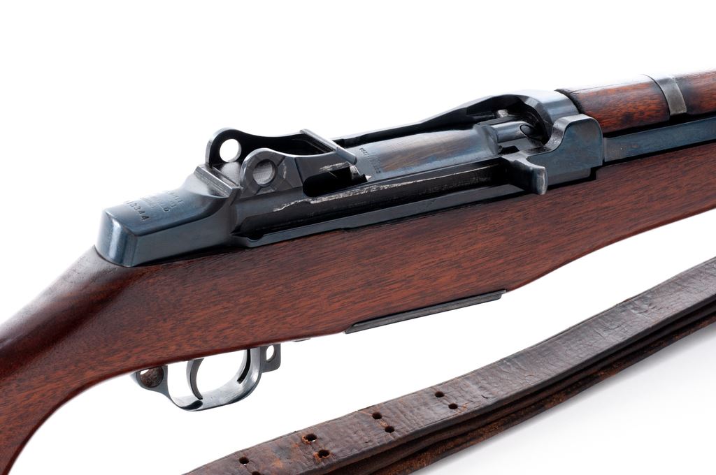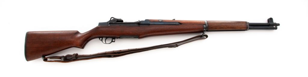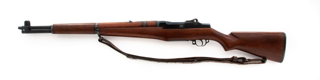 Springfield M1 Garand Semi-Automatic Rifle, #1813344, .30-06 cal., 24'' barrel, blued/painted finish, walnut stock, blade front sight with protective ears and folding leaf rear sight. Marked on receiver tang ''U.S.RIFLE CAL..30 M1 SPRINGFIELD ARMORY'', and on right side of barrel, ''3-S-A-7-43''. Bolt, hammer, trigger housing, and operating rod all marked ''SA''. Rifle has been modified by removing issue rear sight, cutting a hole in the rear handguard, and attaching a small folding leaf rear sight directly to the barrel. Gas cylinder and exposed barrel have been painted black, and receiver and operating rod have been refinished with a dark bluing. Condition overall is very good as modified, with metal surfaces retaining over 95% of its painted and blued finish with some flaking on the gas cylinder, light wear on the bolt and receiver, and thinning and patina on the buttplate. Wood has been refinished with a semi-gloss stain and is in very good condition showing a few light handling marks. Action is smooth, bright bore is very good. No visible import stamps. Buttstock contains cleaning kit, but door is jammed preventing removal. Includes a U.S. M1907 leather sling stamped ''MILSCO 1943'' in good condition with darkening and cracking to the leather. Est.: $800-$1,000. (C&R)