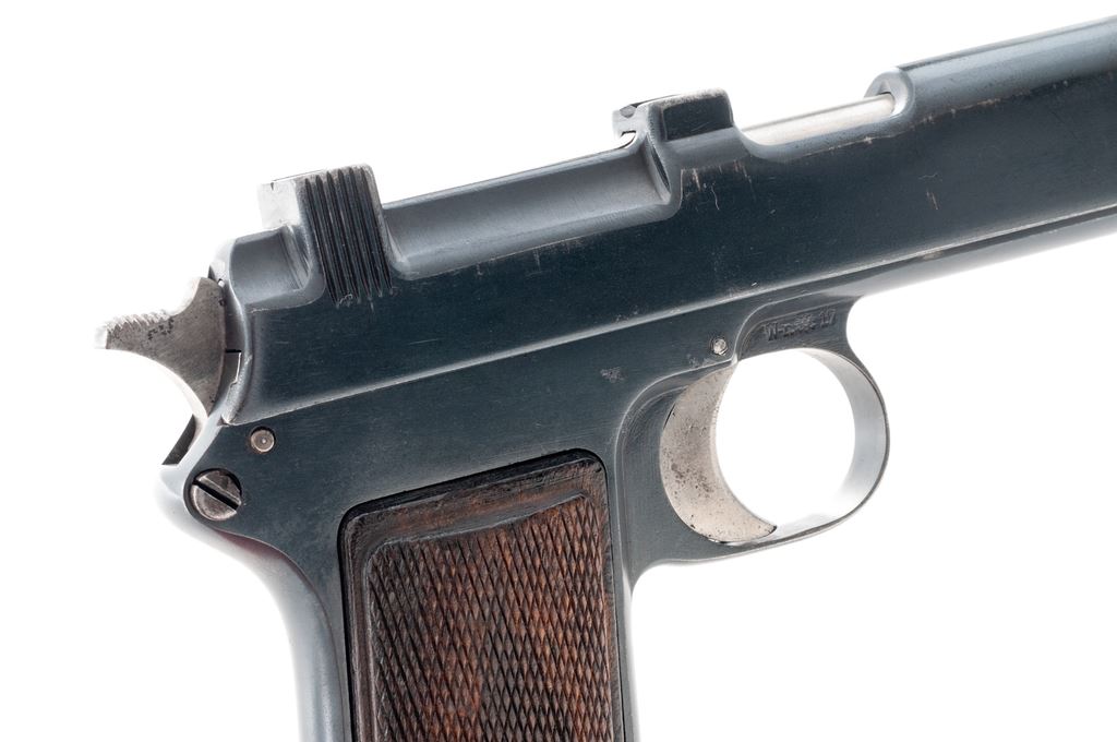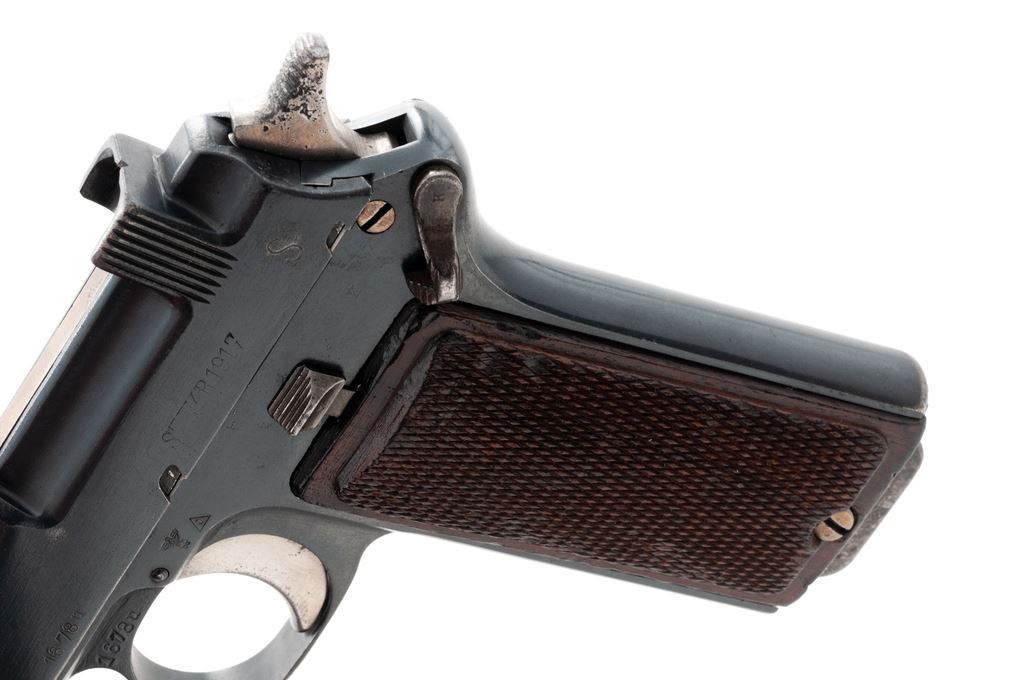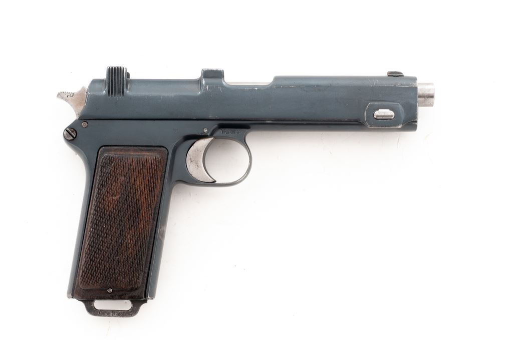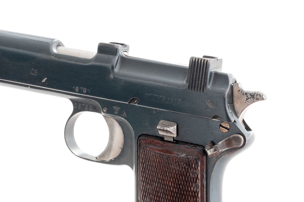 Steyr Model 1912 Semi-Automatic Pistol, #1678U, 9x19mm, 5.0125'' barrel, blue finish, checkered walnut grips, ''(crown)/N'' and ''(trangle)/0'' proofmarks. Right side triggerguard bow marked ''Wn/(eagle)/17''. Condition is excellent as refinished, probably at time of importation, and retains approx. 94% blue with some scratches and mild abrasions. Grips with some flattening to checks and very small losses. Moderate pitting to rear third of hammer. Good action, bright bore. Est.: $450-$650. (C&R/PPT)