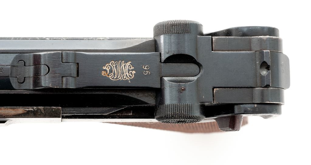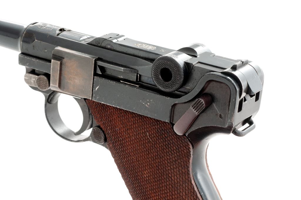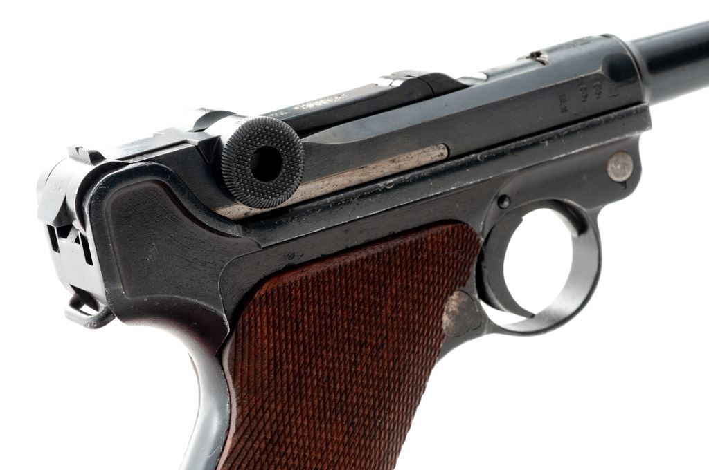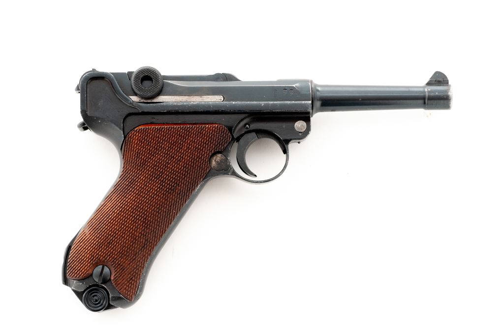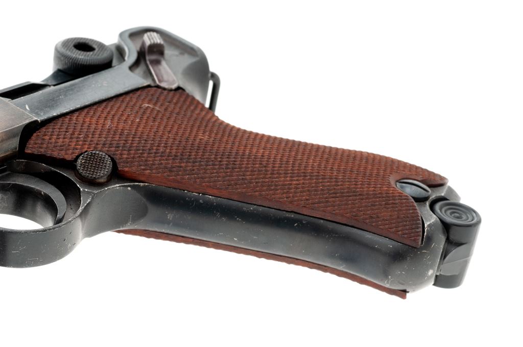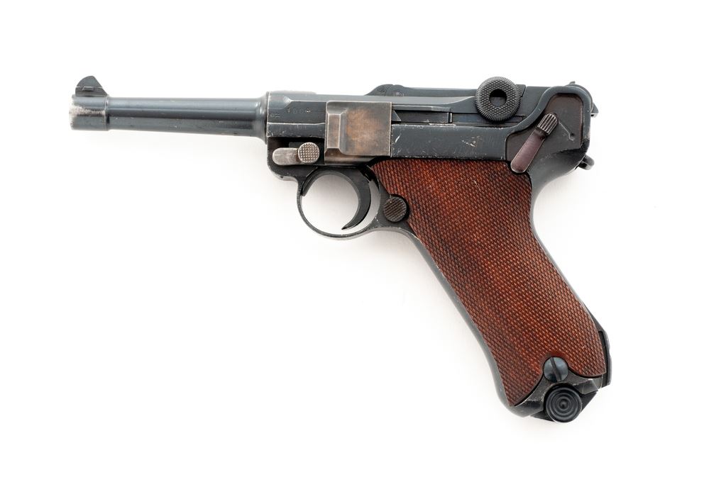 DWM P.08 Luger, #6999f, 9mm, 4'' barrel, blue finish, checkered walnut grips, with one post-war WWII magazine. Chamber double dated 1920/1917, DWM toggle center link. Condition is good with mixed parts, unnumbered sideplate, modern reproduction walnut grips. Good action, fine bore. A nice shooter Luger. Est.: $450-$650. (C&R/PPT)