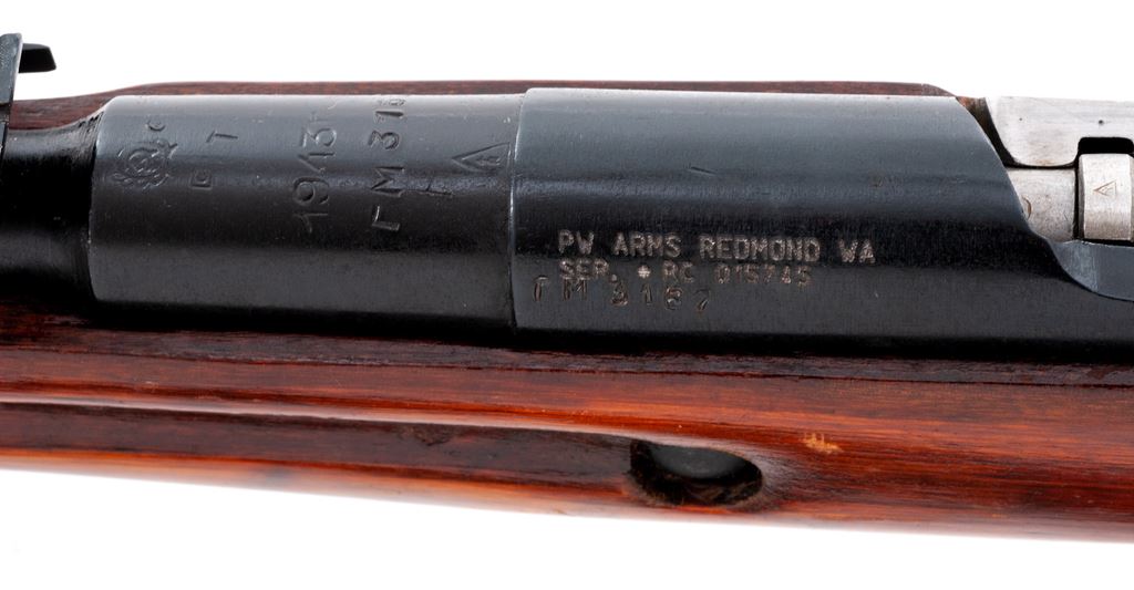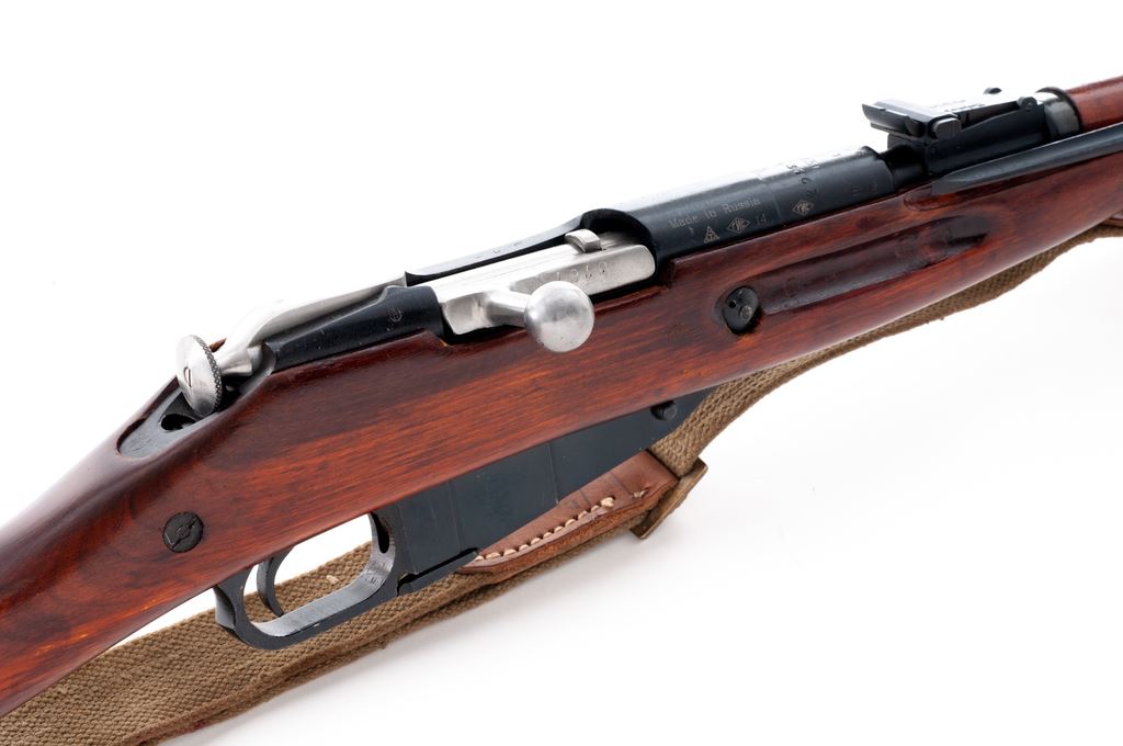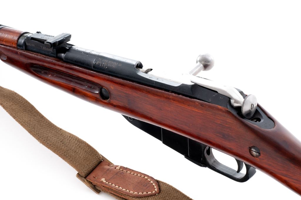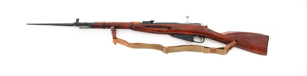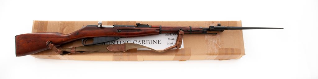 Soviet M44 Mosin-Nagant Bolt Action Carbine, with folding bayonet, #RC015745, 7.62x54Rmm cal., 20.4'' barrel, blued finish, hardwood stock, hooded post front sight and adjustable tangent rear sight. Marked on barrel shank with ''(Soviet crest)/1943r/(fletched arrow)'' inside triangle of the Soviet Izhevsk Arsenal. No refurbishment marks on receiver or stock. Matching original numbers (magazine floorplate has been renumbered to match). Includes cleaning rod. Condition overall is very good with over 95% blued finish remaining on metal surfaces, with bolt assembly bright. Wood is very good with light handling marks. Action is smooth, bore is good with darkness in the grooves and some roughness. Import stamped on left side of receiver. Also marked on right side of receiver ''Made in Russia'', and on left side of rear sight ''Mod.44 7.62x54R''. Bayonet operates smoothly and has a small rust spot on the blade, otherwise excellent. Includes a shipping box and a communist bloc cotton and leather sling in good condition. Est.: $200-$400. (C&R)