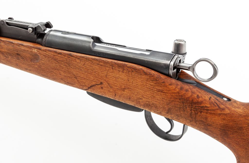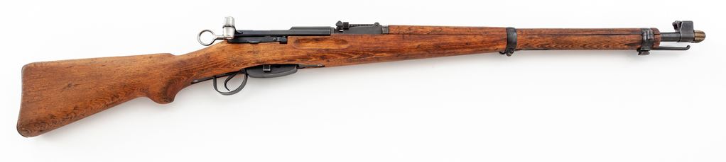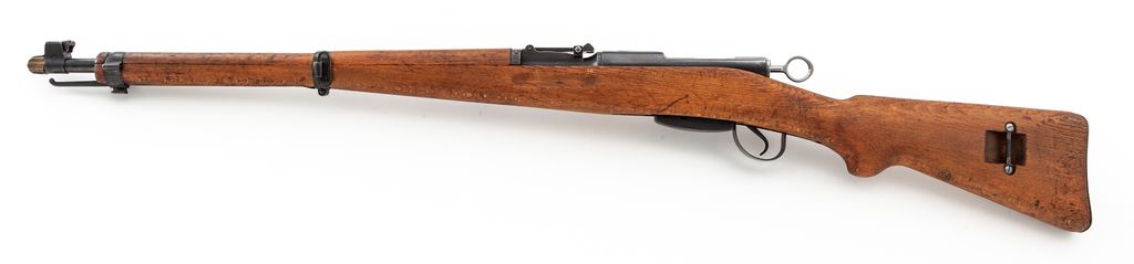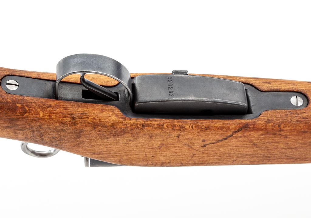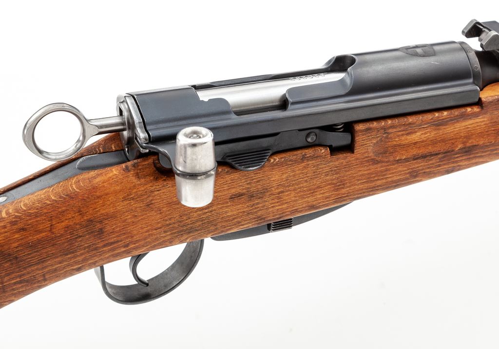 Swiss Model K31 Schmidt-Rubin Straight-Pull Carbine, #920262, 7.5x55 Swiss cal., 25.67'' barrel, blued finish, hardwood stock, blade front sight with protective ears and adjustable tangent rear sight. Marked on top of receiver with Swiss crest and on right side of buttstock with small shield cartouche. Matching numbers. Condition overall is very good with approx. 95% of the blued finish remaining on metal surfaces, with light toning on barrel bands and discoloration on magazine follower. Wood has been sanded and left unfinished showing old handling marks. Action is smooth, bright bore is excellent with sharp rifling. Import stamped on underside of barrel. Includes Swiss muzzle cover in good condition. Est.: $400-$600. (C&R)