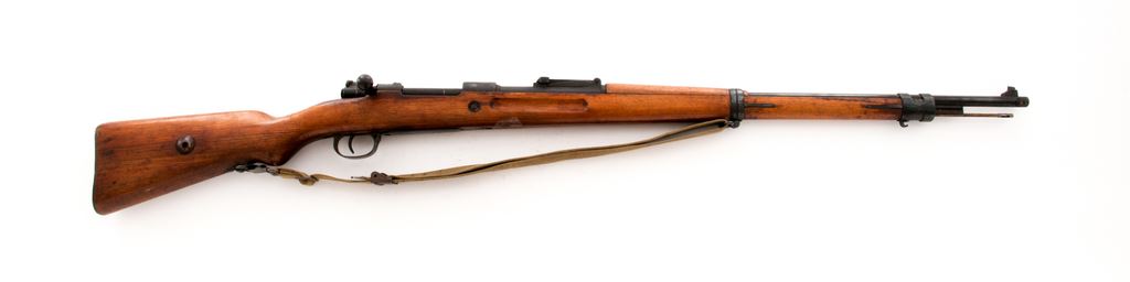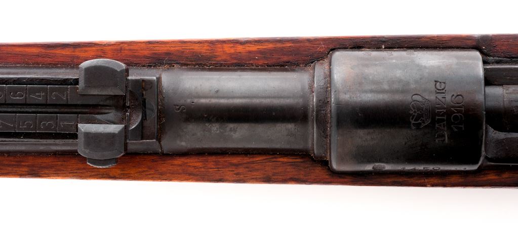 German Gewehr 98 Mauser Bolt Action Rifle, #1459, 8x57mm cal., 29.13 '' barrel, blued finish, hardwood stock, inverted ''V'' front sight and adjustable tangent rear sight. Marked on receiver ring ''(crown)/DANZIG/1916'', and on left side receiver rail ''Gew.98''. ''S'' stamped on barrel behind rear sight. Rear sight leaf stamped ''S/42G''. Upper band has parade hook. Includes cleaning rod and early U.S. M1 Garand cotton sling. Matching numbers on receiver and barrel; mismatched numbers on bolt and other parts. Condition overall is very good with approx. 80% dark blued refinish remaining on metal surfaces, with patina on the triggerguard and buttplate and small rust spots on the barrel. Wood has been sanded and refinished with darkening around the receiver and light handling marks. Adhesive from an old sticker is on the stock in front of the triggerguard. Action is smooth, bore has very good rifling with overall darkening in the grooves. No visible import stamps. Est.: $350-$550. (C&R)