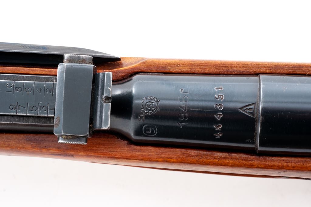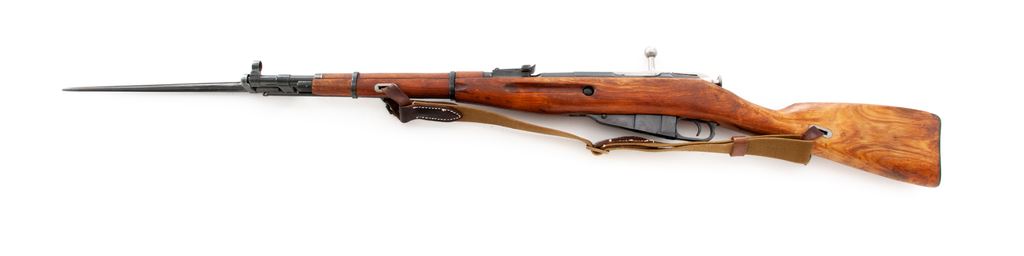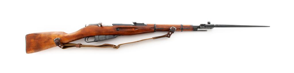 Soviet Izhevsk M44 Mosin-Nagant Bolt Action Carbine, with side folding bayonet, #4K4851, 7.62x54R cal., 20.5'' barrel, blued finish, hardwood stock, hooded post front sight and adjustable tangent rear sight, cleaning rod, and Soviet marked canvas sling with leather collars. Marked on top of chamber with Soviet crest and is dated ''1946'', with Izhevsk Arsenal makers mark. Right side of the buttstock with faint inspectors stamps, etc. Marked parts all appear to have the Izhevsk Arsenal stamp but only the bolt, receiver, and buttplate have matching numbers. No visible import marks. Condition overall is very good, with approx. 95% blued finish remaining on metal surfaces and an area of thinning on the buttplate. Wood has been lightly sanded with an added coat of finish and shows scattered small handling marks and scratches with mild darkening around the buttplate. Front sight and barrel bands with some cosmoline in protected areas. Action is smooth, bright bore is excellent. Bayonet is also excellent and operates smoothly. Est.: $200-$300. (C&R)