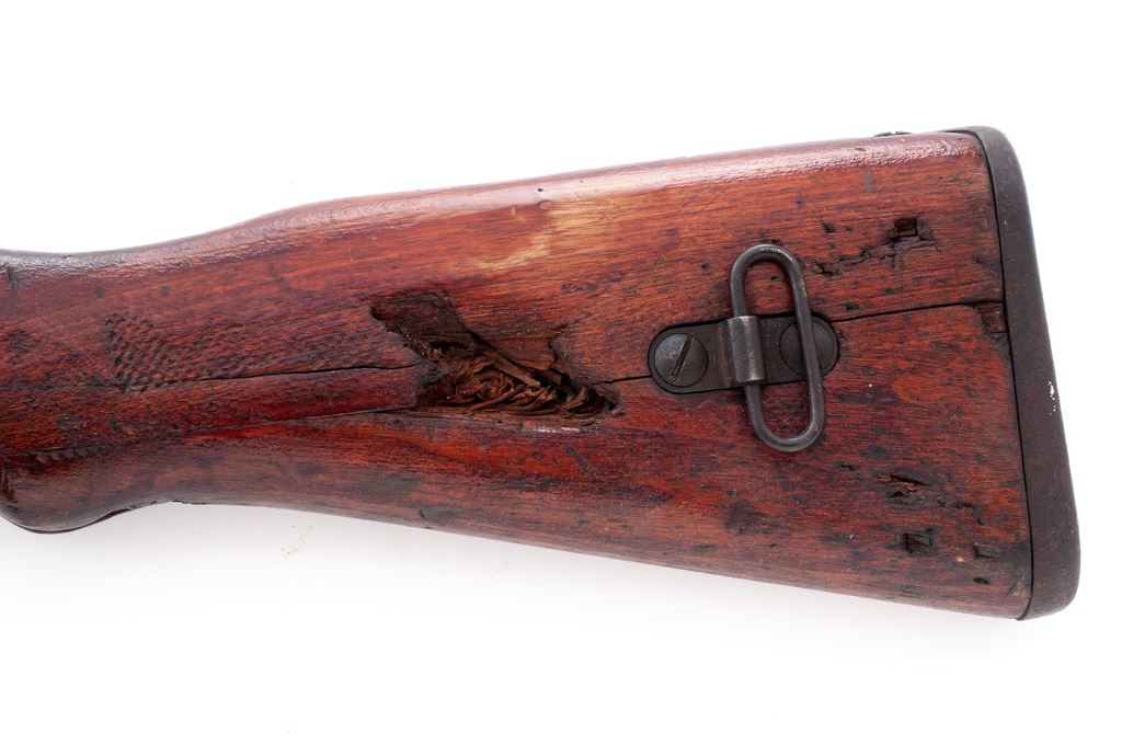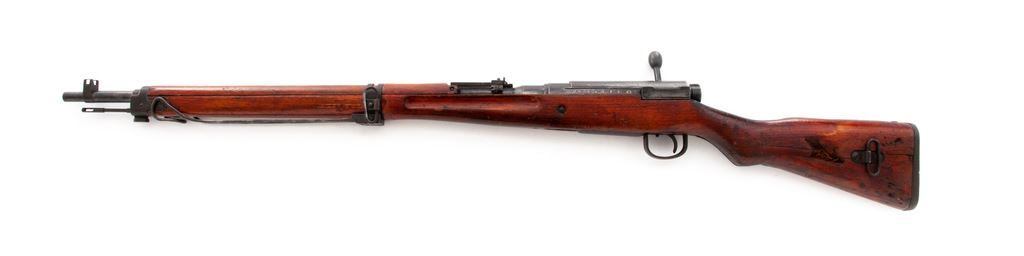 Arisaka Type 99 Bolt Action Rifle, #38075, what looks like 6th Series markings, mfg'd at Nagoya Arsenal, 7.7mm Japanese cal., 25.5'' barrel, blue finish, hardwood stock, inverted ''V'' front sight with protective ears and folding leaf adjustable peep sight with anti-aircraft wings, knurled safety knob, monopod, dust cover, with cleaning rod. Receiver ring with a very clean mum and Japanese ''Type 99'' characters. Receiver, bolt, extractor, and bayonet lug are matching. No import marks. Both sides of the buttstock with what looks like possible battle damage from a piece of shrapnel, etc. Rifle is in good overall condition. Metal is mostly dark. As previously mentioned, the receiver ring markings are really clean and clear. Wood shows age and wear consistent with the rest of the rifle, including scattered scratches and mars, with an added coat of finish. Stock is solid and damage to the buttstock makes for an interesting story. Good action; bore with scattered moderate surface peppering; rifling is very good. Est.: $200-$400. (C&R)