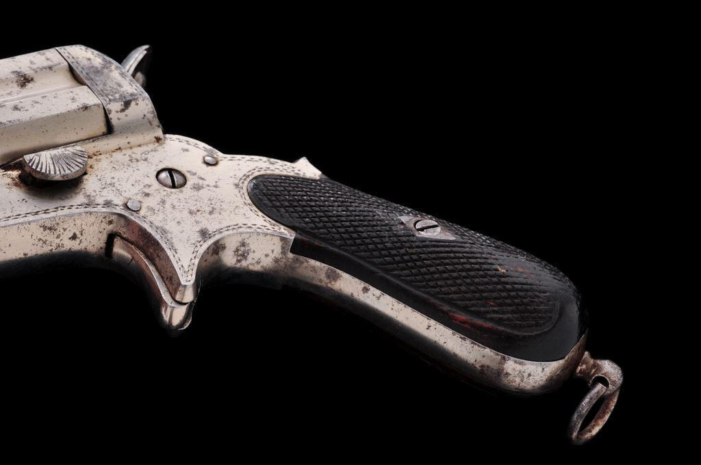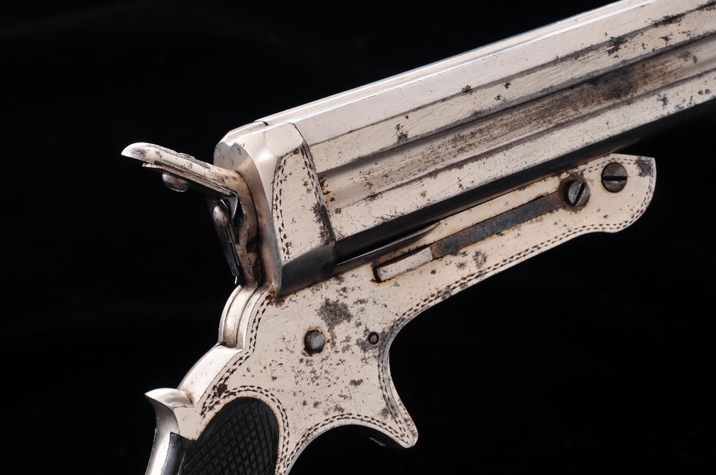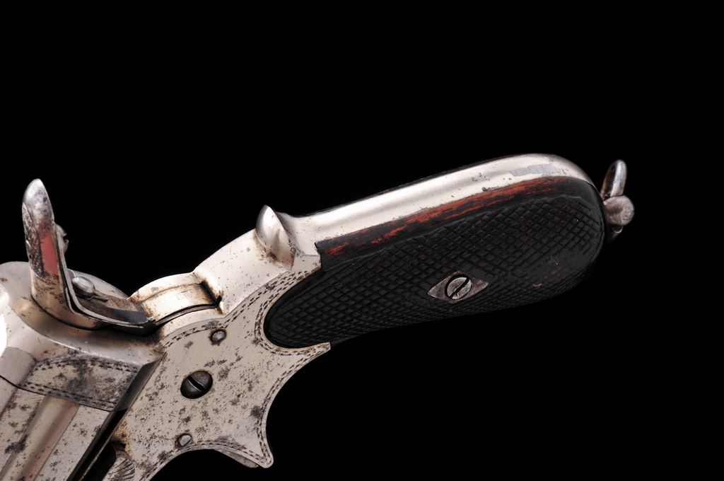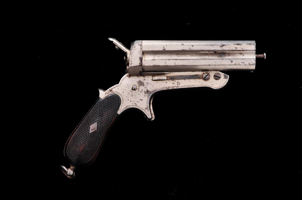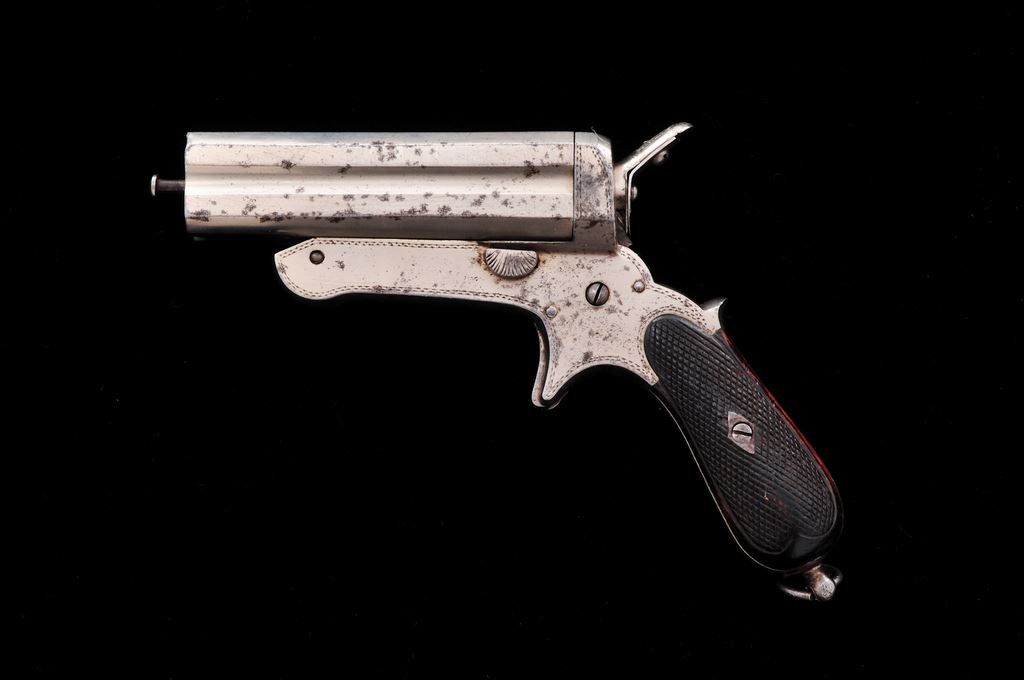 Large-Bore, Large-Frame, Likely European Sharps-Type 4-Barrel Spurtrigger Pepperbox Pistol, appears to be serial #0 under tip-up barrel group and on left grip frame (perhaps an inventor's model or prototype as it is completely unmarked as to maker and without proofmarks), .41/10mm RF cal. with single revolving striker, 4-1/8'' ribbed barrel group. Originally finished in full nickel plate with checkered walnut bag-style two-piece grips having diamond screw escutcheons, and steel lanyard ring in butt. Frame and recoil shield decorated with fine two-row engraved bordering. Condition is fine retaining approx. 85%-90% original nickel showing age spotting and minor losses. Grips are very good with minor flattening to checks and no cracks or chips. Barrel hinge is solid. Action is smooth and sure; bores appear good with distinct rifling and should clean. Est.: $450-$650. (Antique)