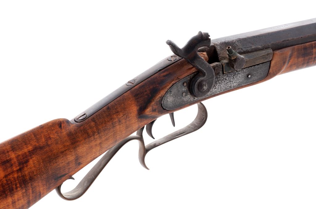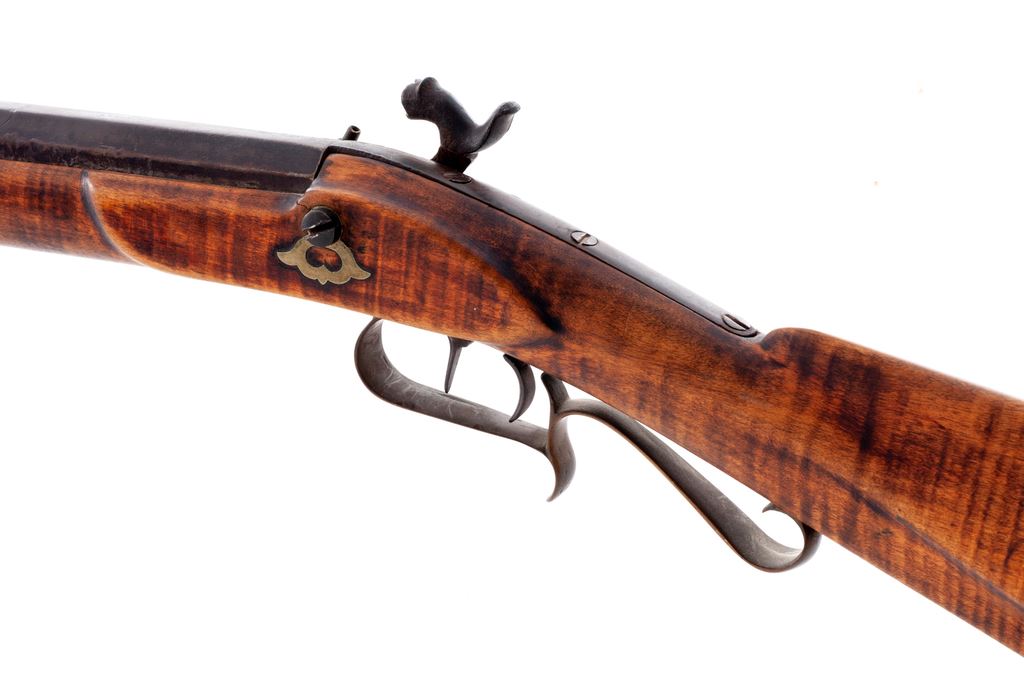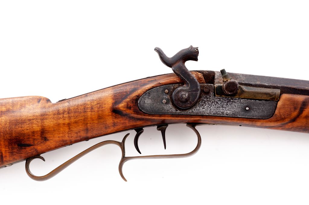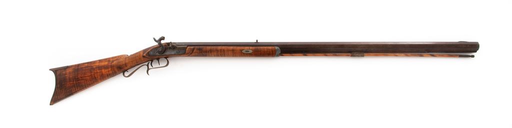 Antique Halfstock Long Barrel Percussion Plains Rifle, NVSN, approx. .40 cal., 35.5'' medium-weight octagonal steel barrel marked ''J.F. Redwine'' on top flat, with a long very-low dovetailed front sight and dovetailed buckhorn rear; flat iron lockplate has engraved scene of water birds on the wing behind hammer, appears to have been converted to percussion from original flintlock, and is marked (only partially legible) what may be ''Lane & Read/Boston'' in two lines. Double set triggers. Brass furniture including triggerguard with scrolled rear tang and finger rest, crescent buttplate with extended lower tang, percussion bolster, escutcheon opposite lockplate, and one (of 2) ramrod ferrules. Striped hardwood ramrod with brass tip a later replacement. Artificially striped hardwood (likely maple) halfstock with two German silver barrel wedge escutcheons; pewter forend cap. Condition is very good. Metal overall shows a brownish gray gunmetal color with pitting around percussion bolster and at barrel breech; replacement nipple; missing top ramrod ferrule; wood with .75''x.5'' loss at breech; brass with an aged patina. Stock with carved raised cheekpiece is sound, appears to have been sanded smooth and is without cracks or gouges. J.F. Redwine of Lynnville, Morgan County, Illinois, was listed as a ''Premium'' maker of ''Target Rifles'' in the book Transactions of the Illinois State Agricultural Society, Vol. 4, for 1861. Action cocks but triggers do not release hammer; bore appears fairly clean with visible rifling. A simple, serviceable rifle ideally suited for use in the harsh conditions prevalent on the early American frontier. Est.: $500-$750. (Antique)