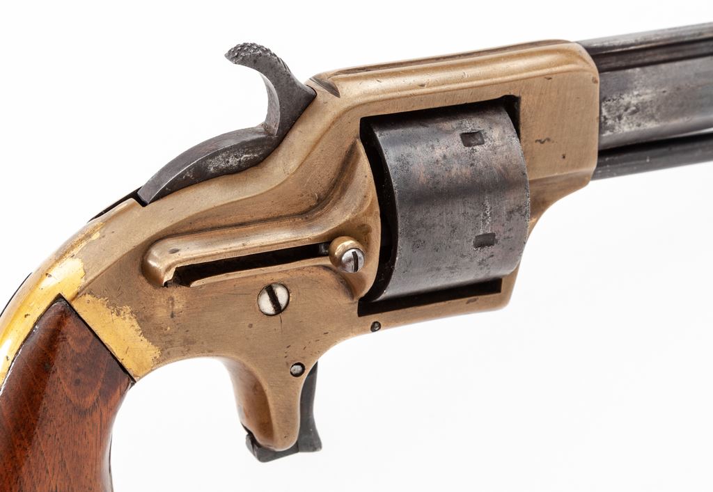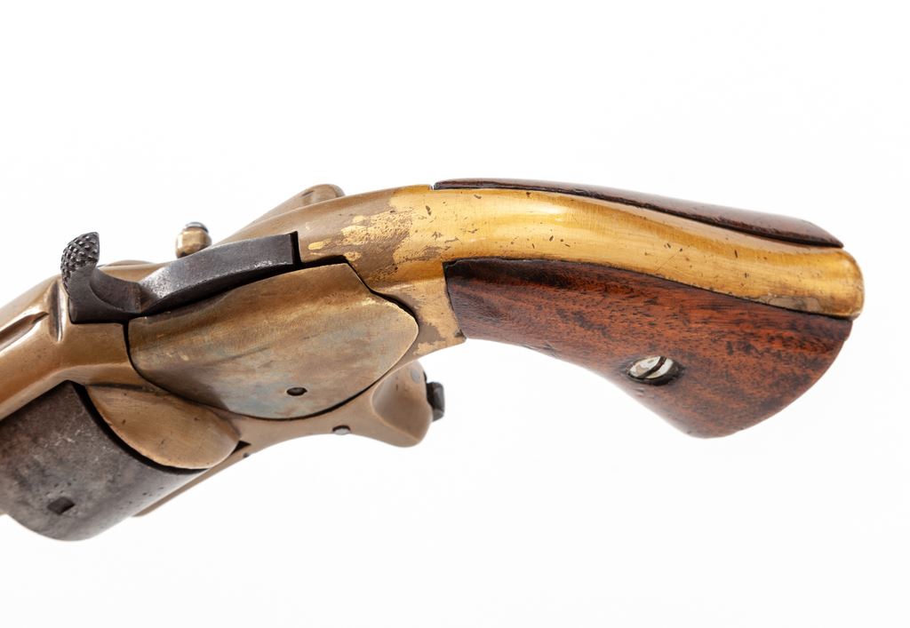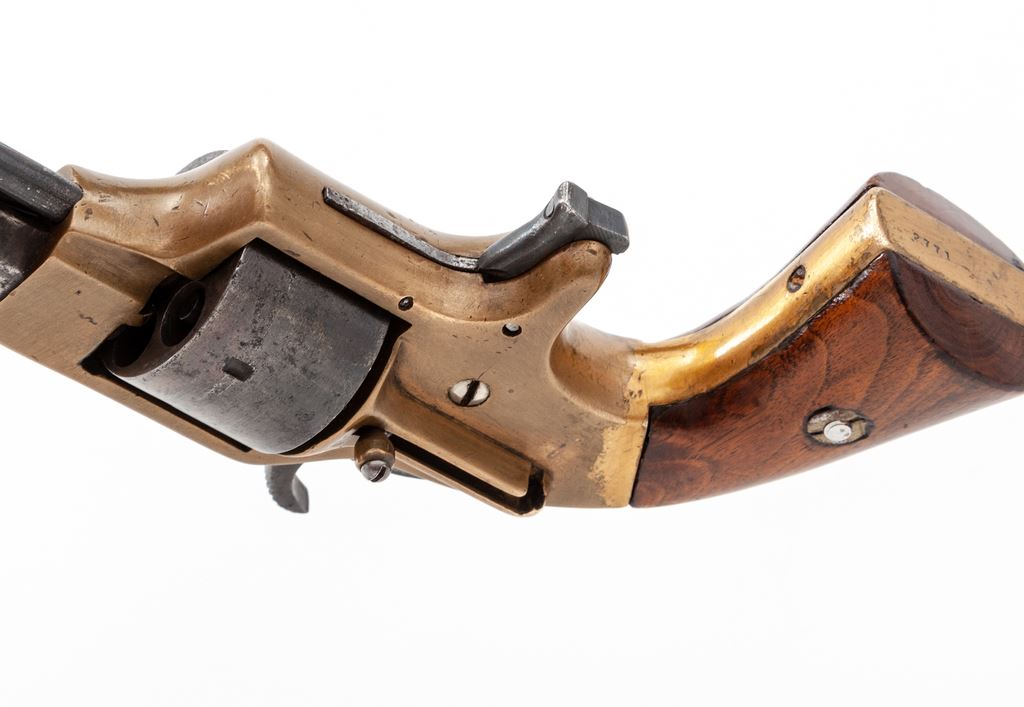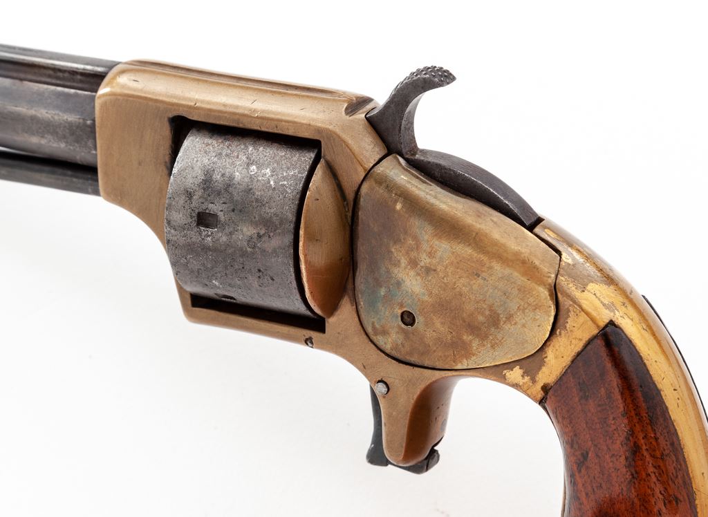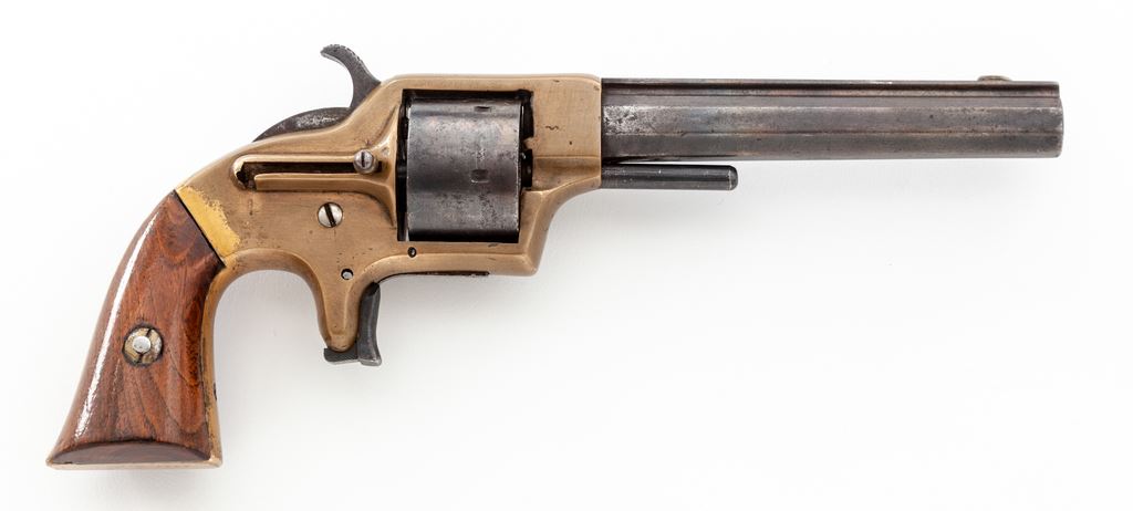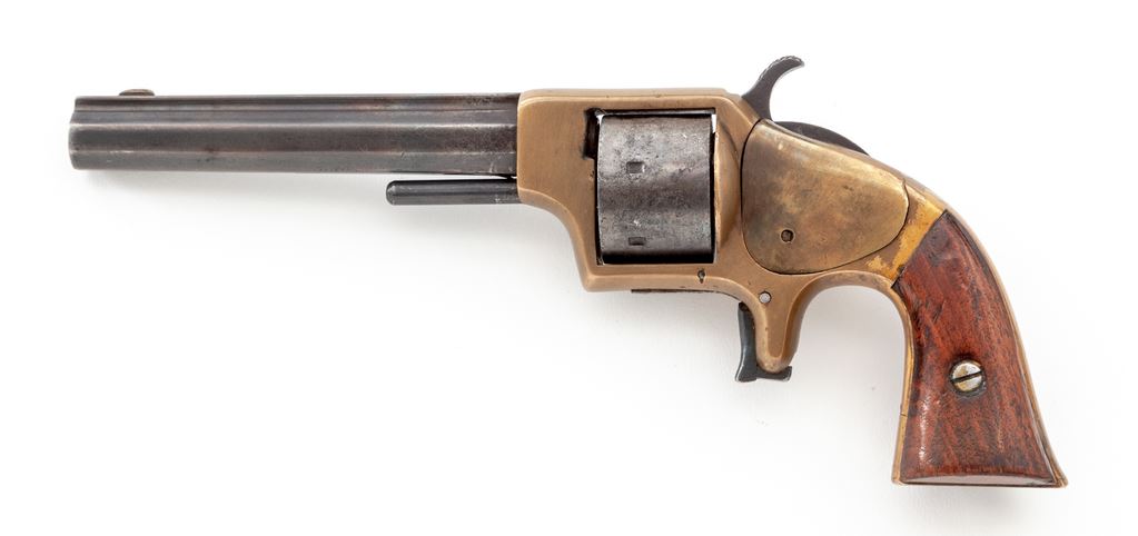 Plant's Third Model (Type 1) Front-Loading Cup-Primed Large Frame ''Army'' Civil War Cartridge/Percussion Revolver, #2771, .42 cal., 6-shot, 5.5'' octagonal barrel with full-length top rib marked ''Plant's Mfg. Co. New Haven Ct.'' Bronze spur trigger frame with integral sliding cartridge ejector rod on right side. Plant's unique design featured two cylinders, one for cap-and-ball percussion and another for metallic cartridges, the latter intended to circumvent Rollin White's bored-through cylinder patent then controlled by Smith & Wesson. Originally blued steel and lacquered bronze finish; varnished walnut two-piece grips. Condition is about good showing no original blue and most of what appears to be gilded lacquer to rear of frame and grip straps. Spring retained cylinder pin replaced with a plain rod. Grips show most of a later varnish; left panel may be a replacement. Action is non-functioning, bore appears dark. Est.: $400-$600. (Antique)